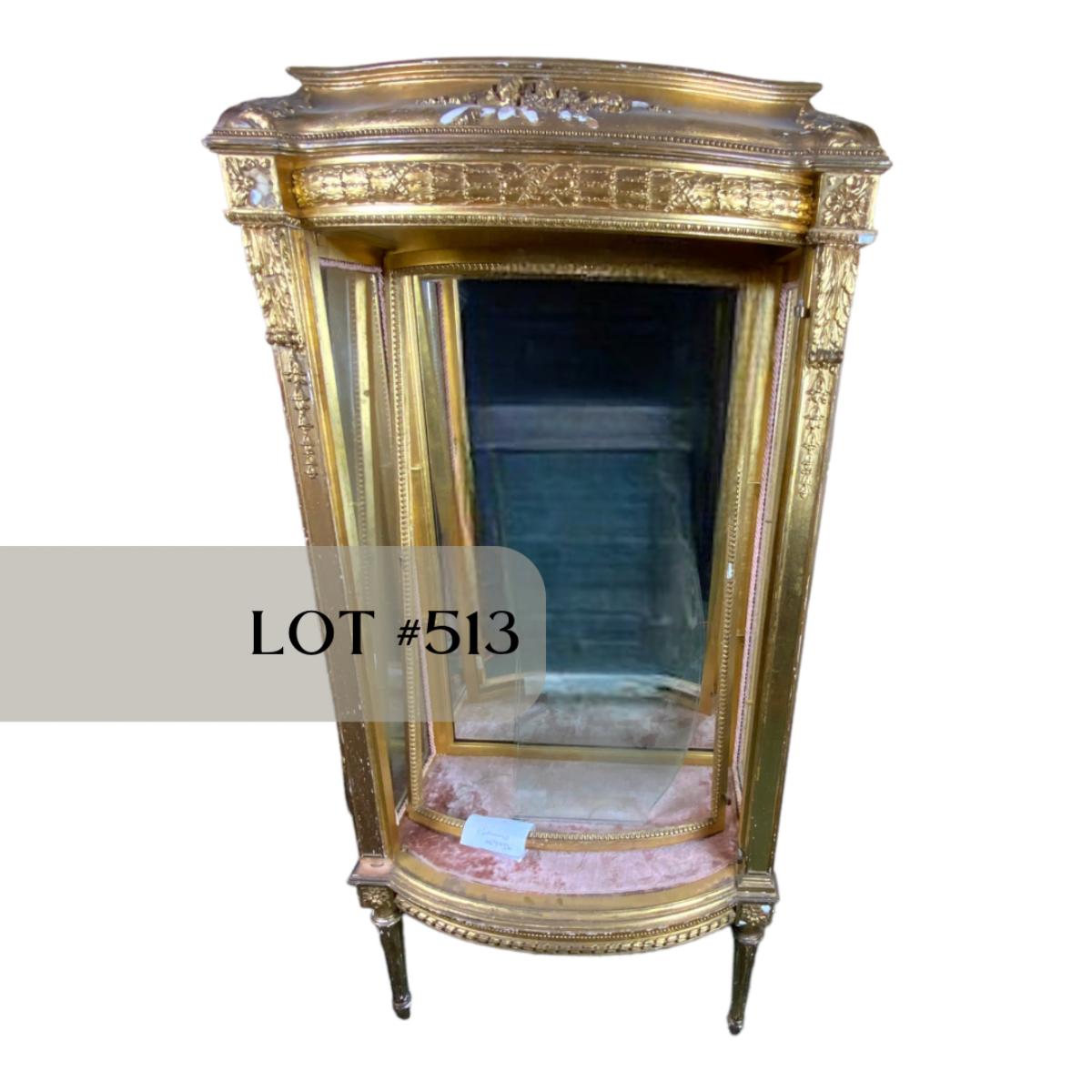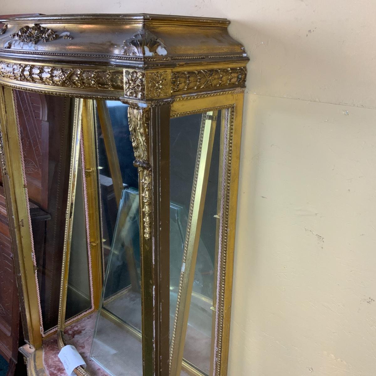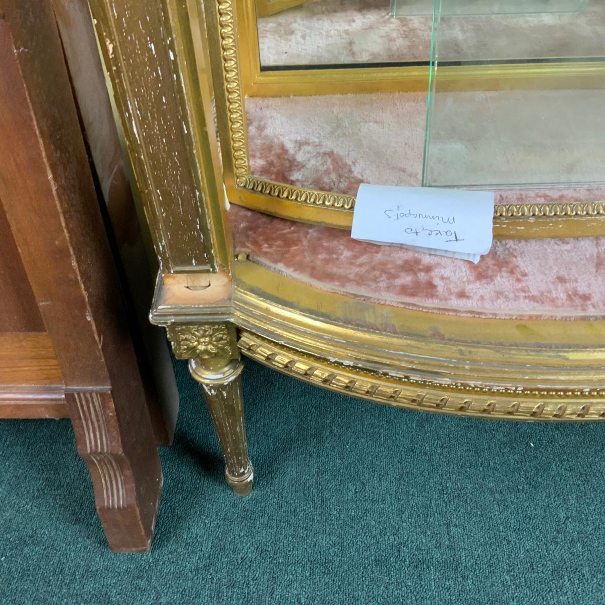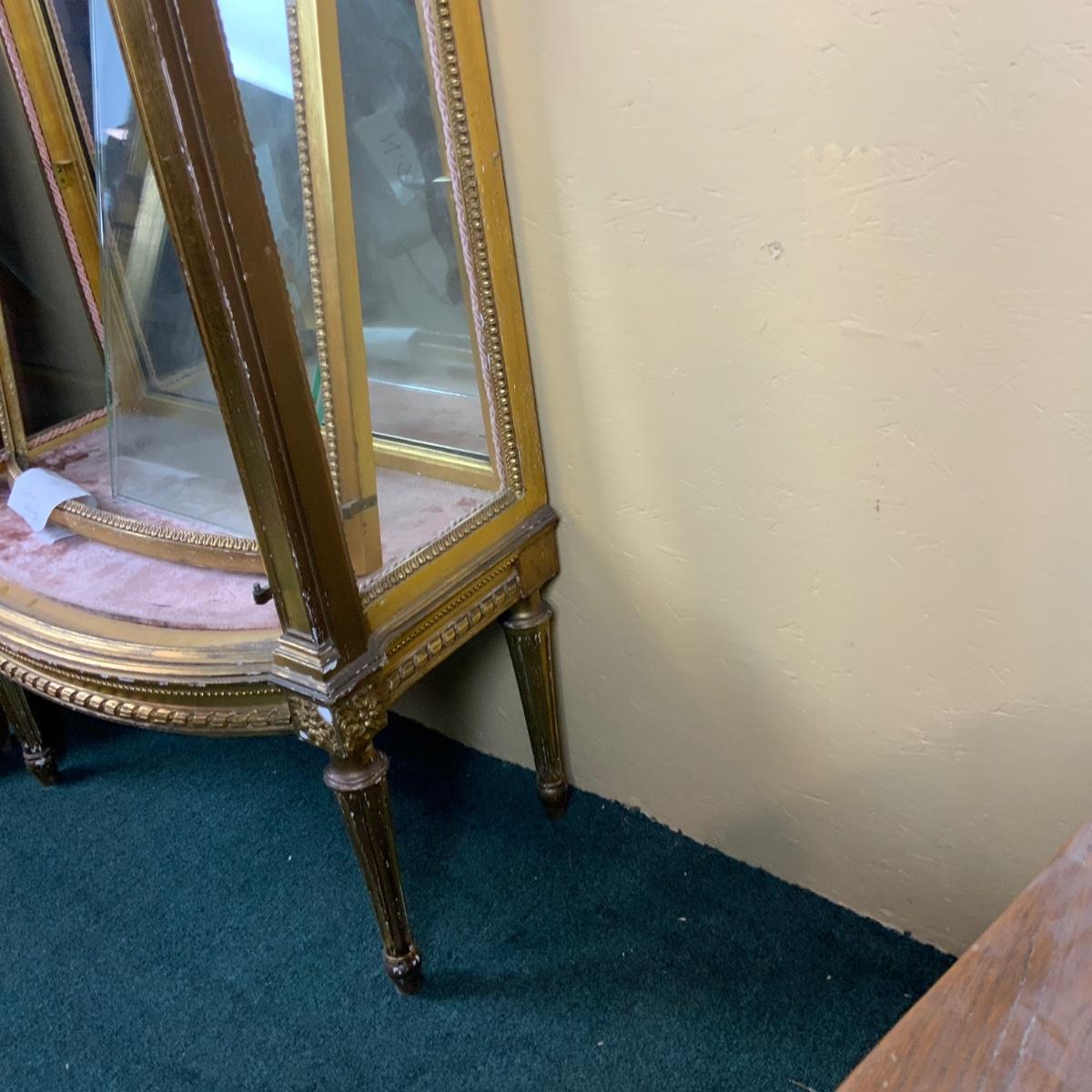 Gold Curved Front Vitrine with 2 shelves. Front glass needs to be replaced. Mirrored back. //::\\ Please see photos for details and condition. No attempt has been made to hide any imperfections. All items listed in this auction are warehouse items, and need to be cleaned. A majority of the items need restoration as well. All items are sold AS IS and WITHOUT GUARANTEE. If you are uncertain about an item, DO NOT BID. Due to the nature of this online auction in-person inspection is HIGHLY recommended. All Sales are FINAL. Pick Up Times are FIRM. Please confirm with your own schedule that you can pick up in the scheduled times listed in the Terms and Conditions. Any questions please message the auctioneer. DO NOT Contact The Harp Gallery.