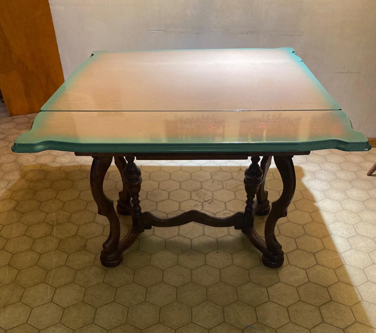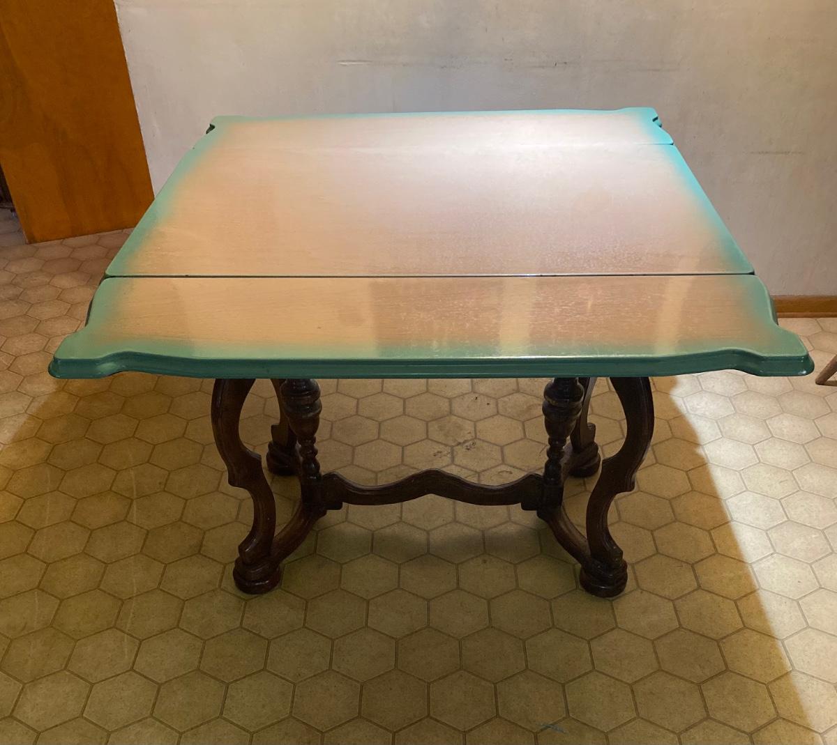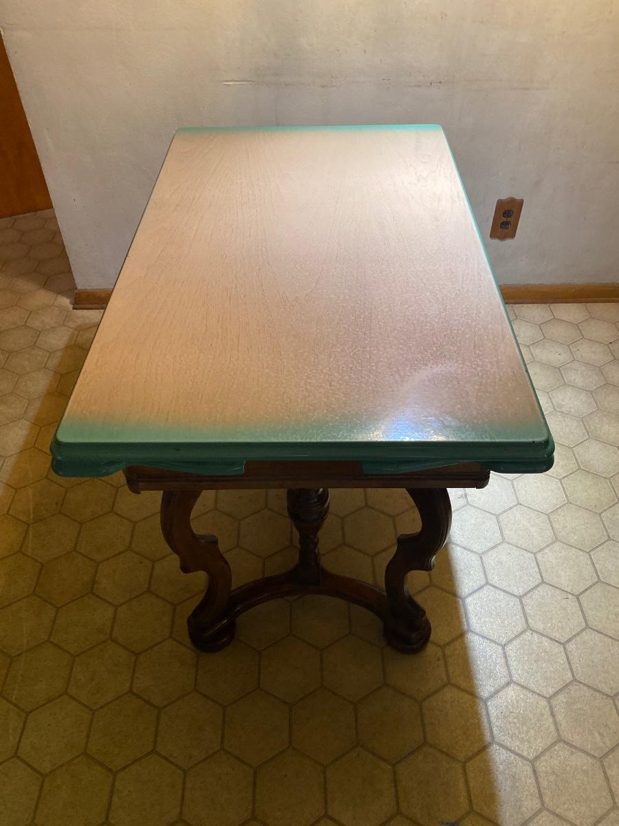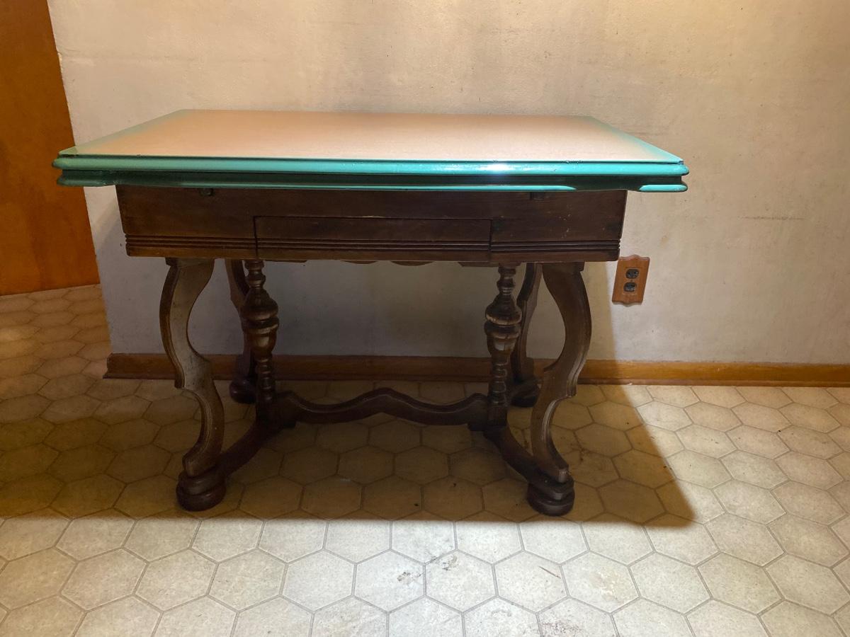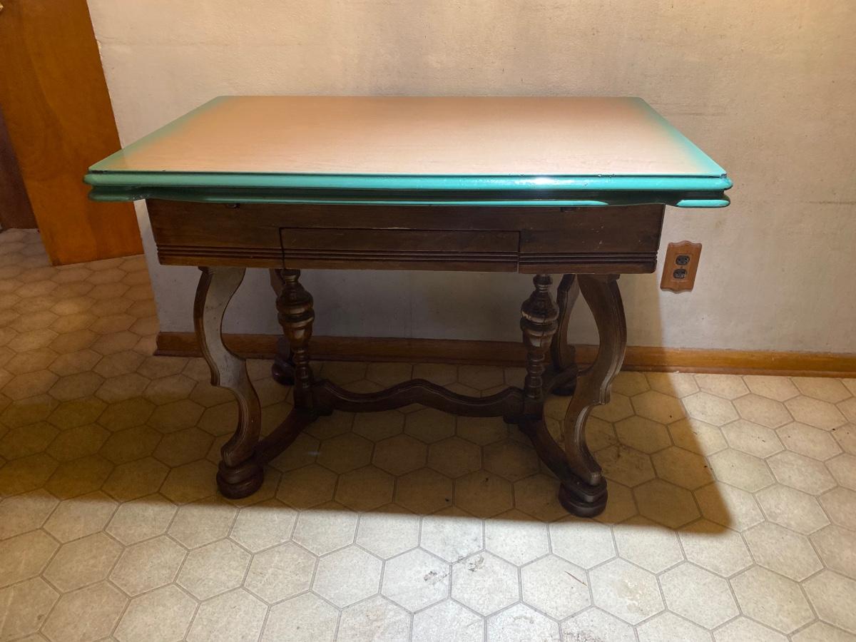 Table has metal top and wood frame bottom. Drop leaf on either sides of table. Drawer in the table frame. Table is 30” in height. 40”width. 45” Long when fully extended. 20” Long when leaf is folded in on both sides.
