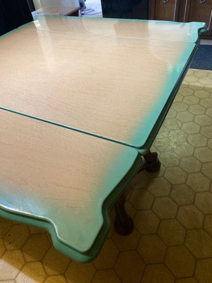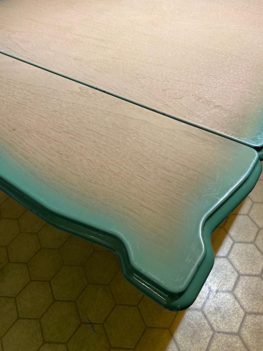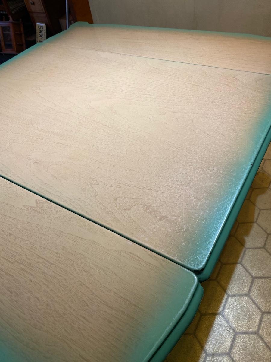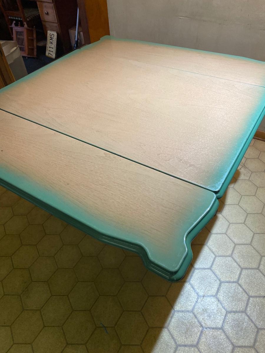 Table has metal top and wood frame bottom. Drop leaf on either sides of table. Drawer in the table frame. Table is 30” in height. 40”width. 45” Long when fully extended. 20” Long when leaf is folded in on both sides.