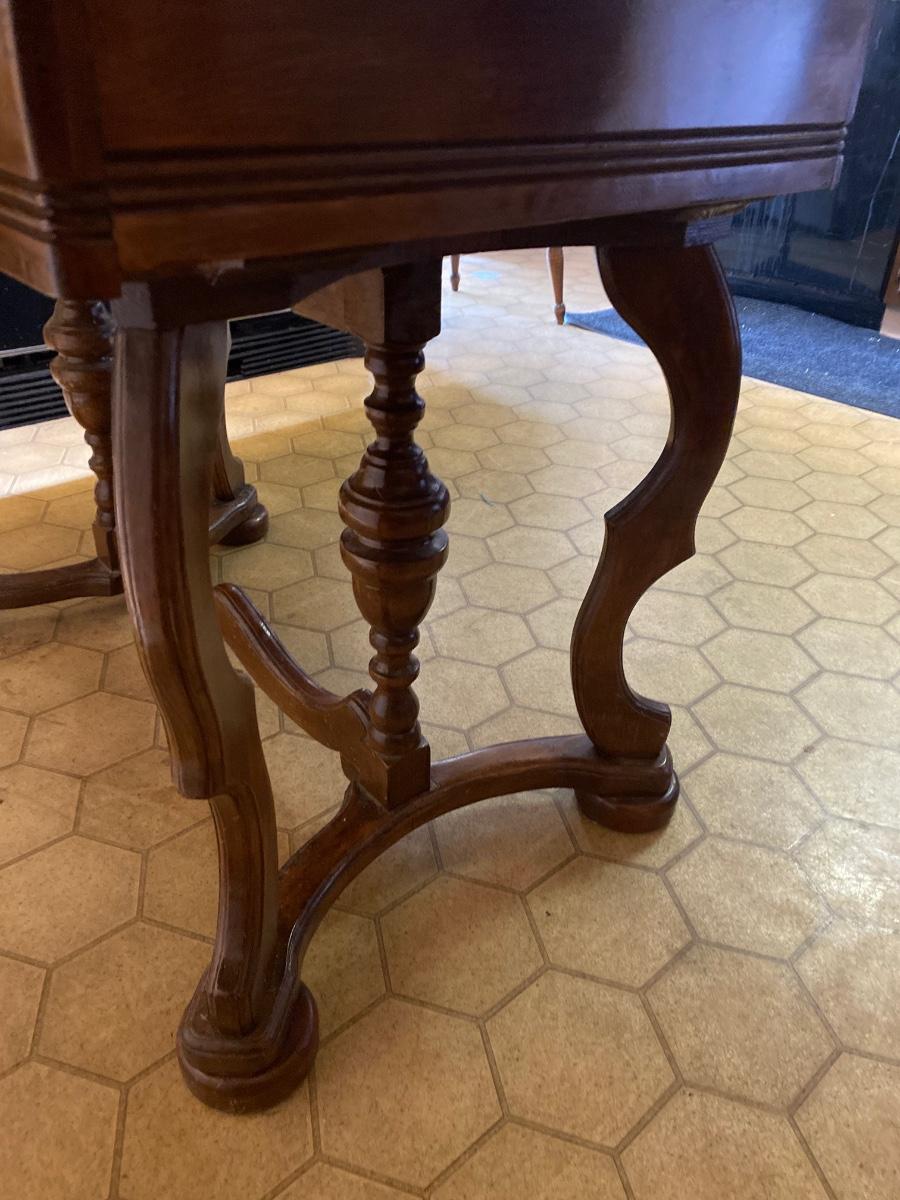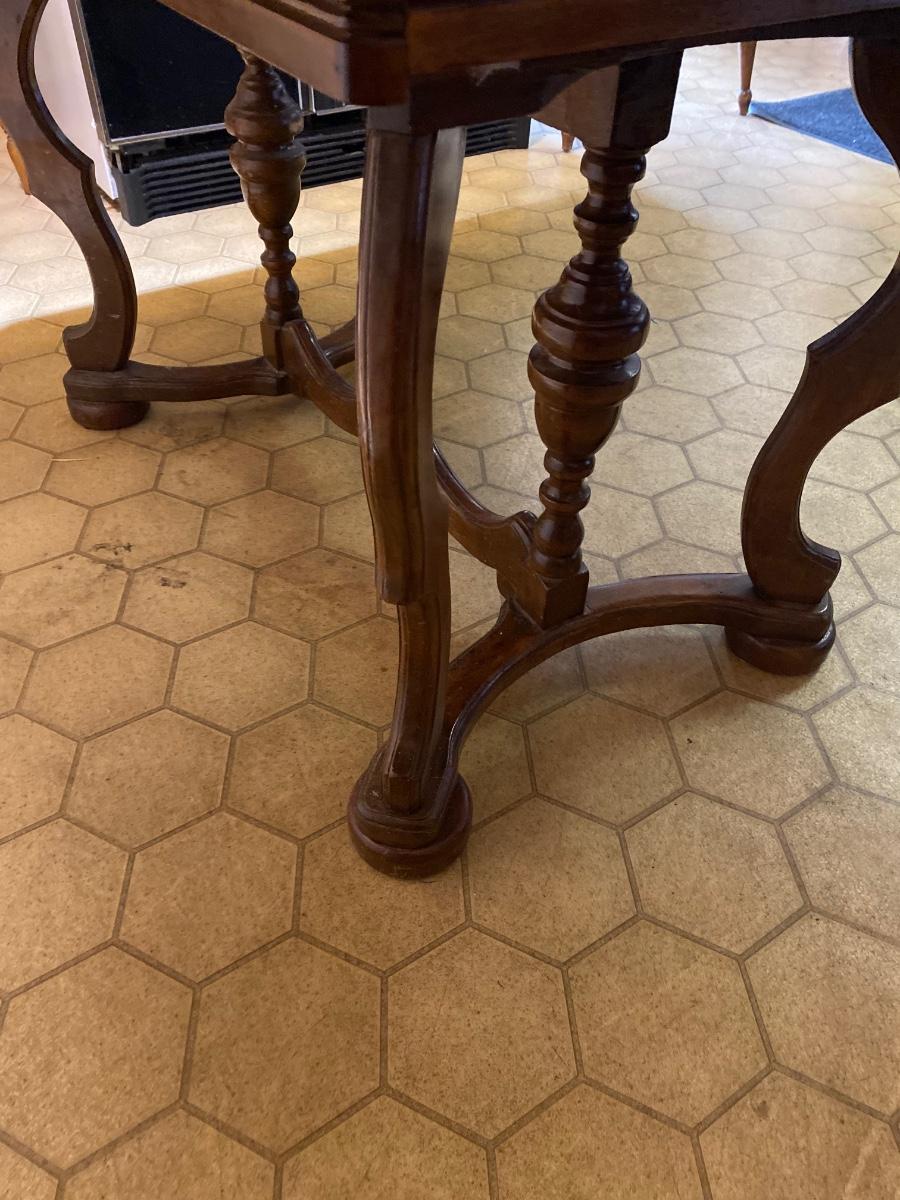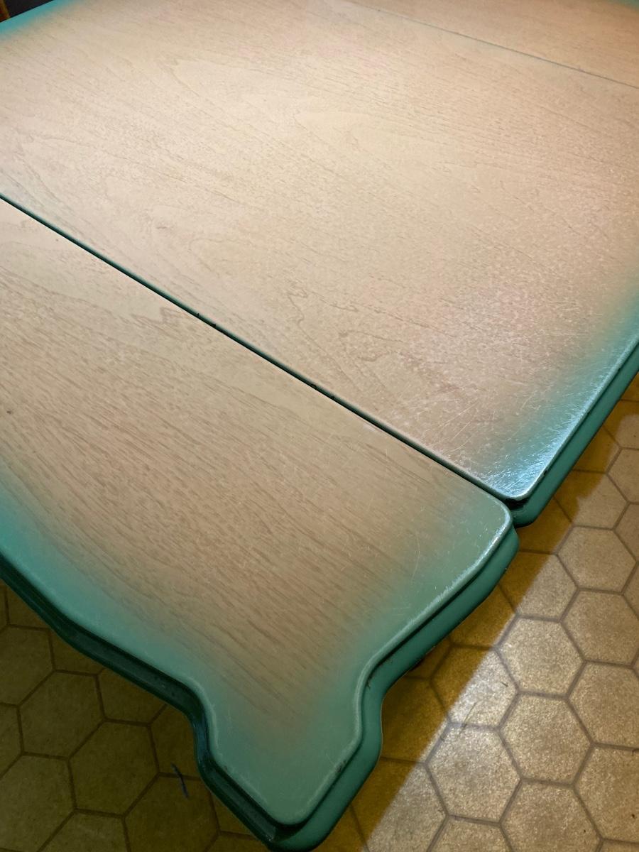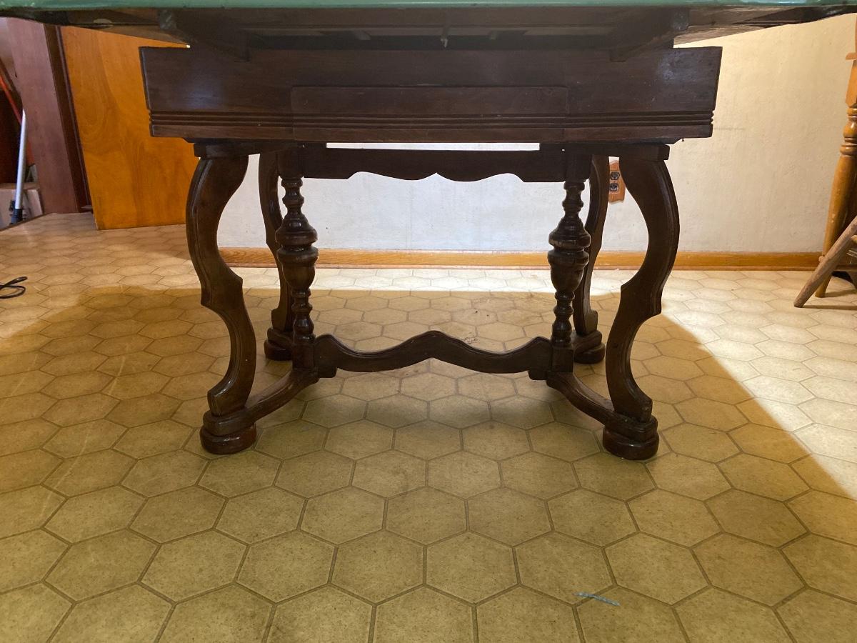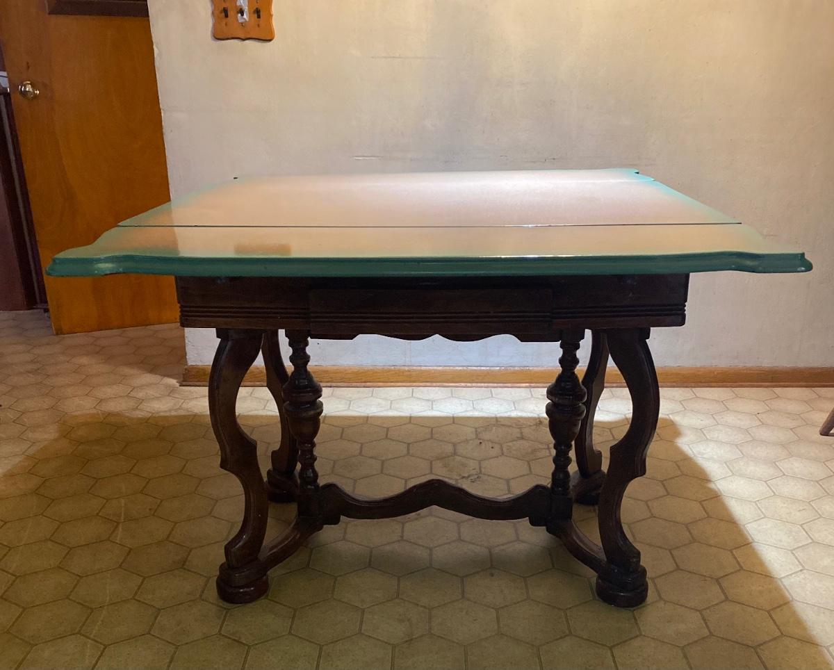 Table has metal top and wood frame bottom. Drop leaf on either sides of table. Drawer in the table frame. Table is 30” in height. 40”width. 45” Long when fully extended. 20” Long when leaf is folded in on both sides.