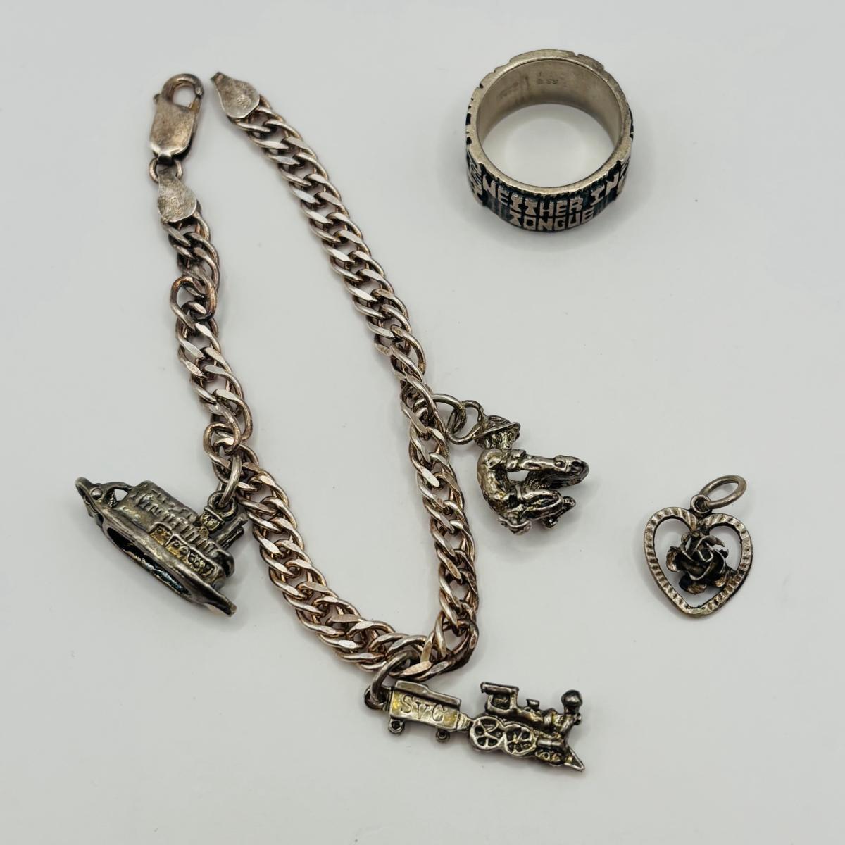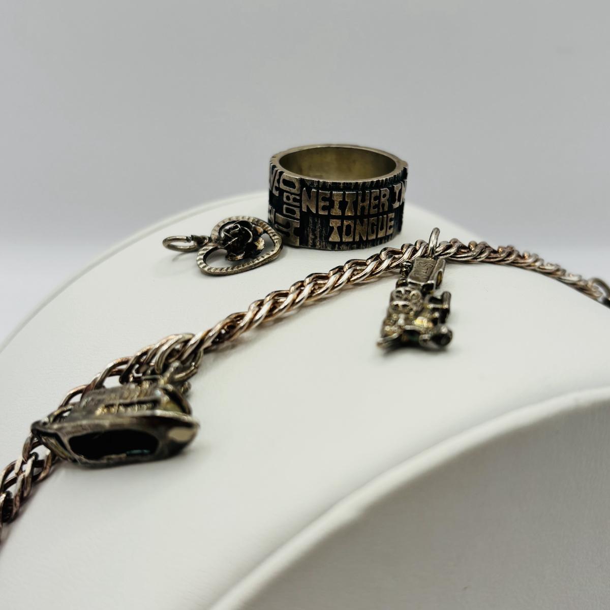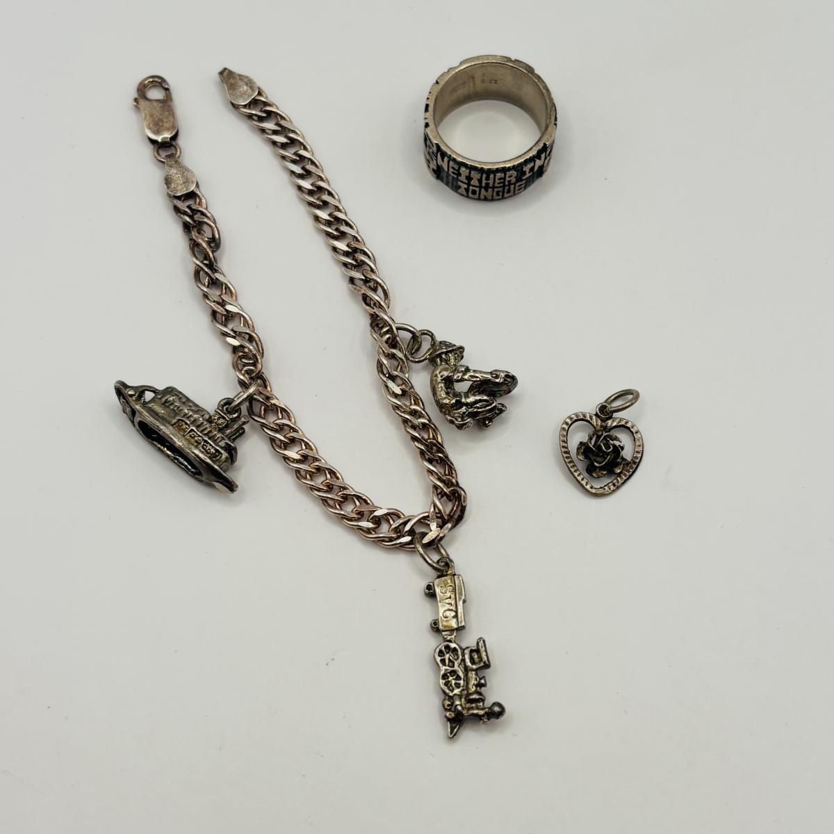 Lot 512J: Sterling Silver Charm Bracelet, Band Ring w/Saying Marked SS, Small Heart & Rose Pendant Marked 830