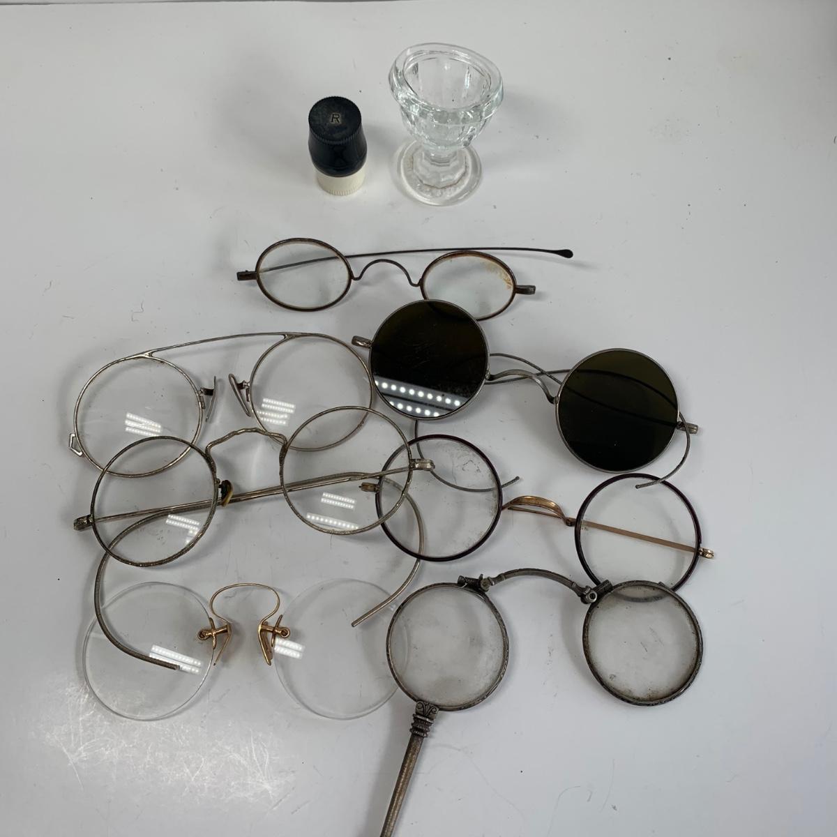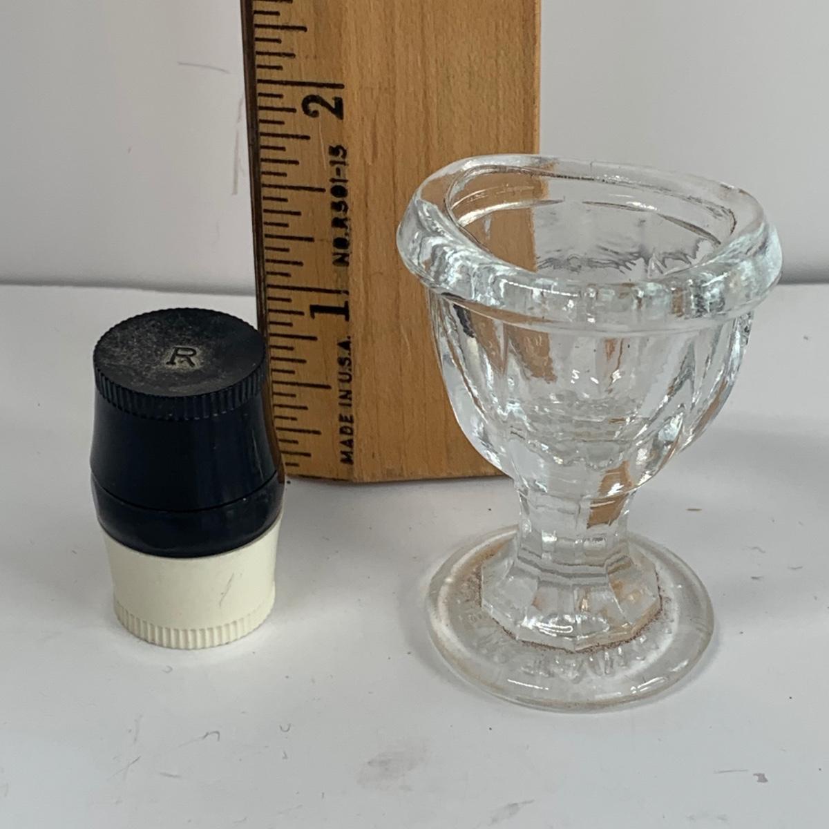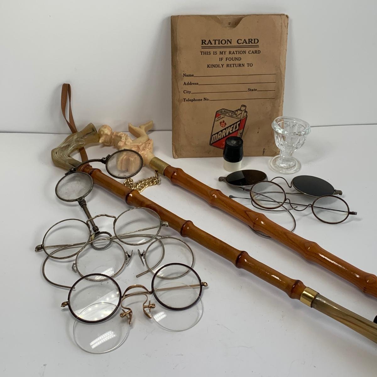 Lot 514: WWII Ration Book, Vintage Shoe Horns: Hoof & Pinocchio/Whale,  Vintage Eye Glasses & Contact Lens Holder w/Contacts, Eye Glass Cup