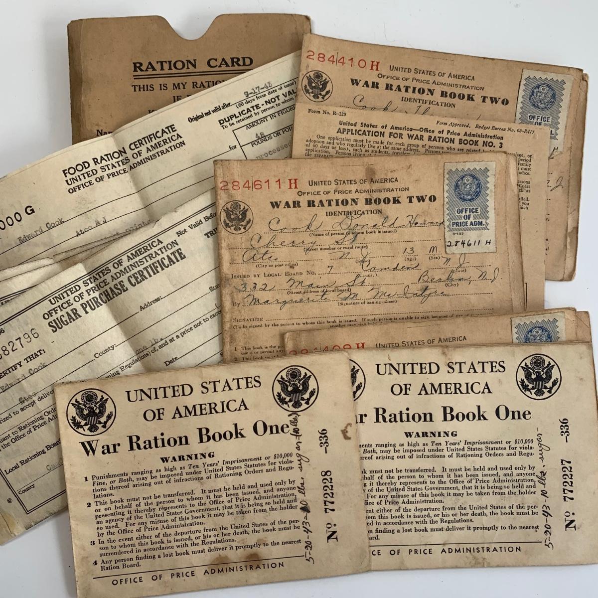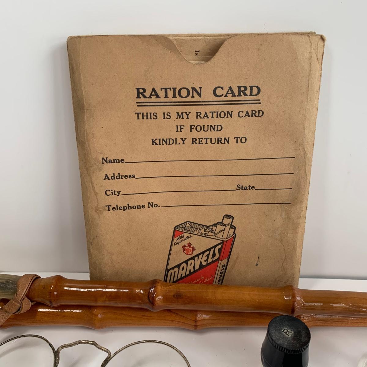Lot 514: WWII Ration Book, Vintage Shoe Horns: Hoof & Pinocchio/Whale, Vintage Eye Glasses & Contact Lens Holder w/Contacts, Eye Glass Cup