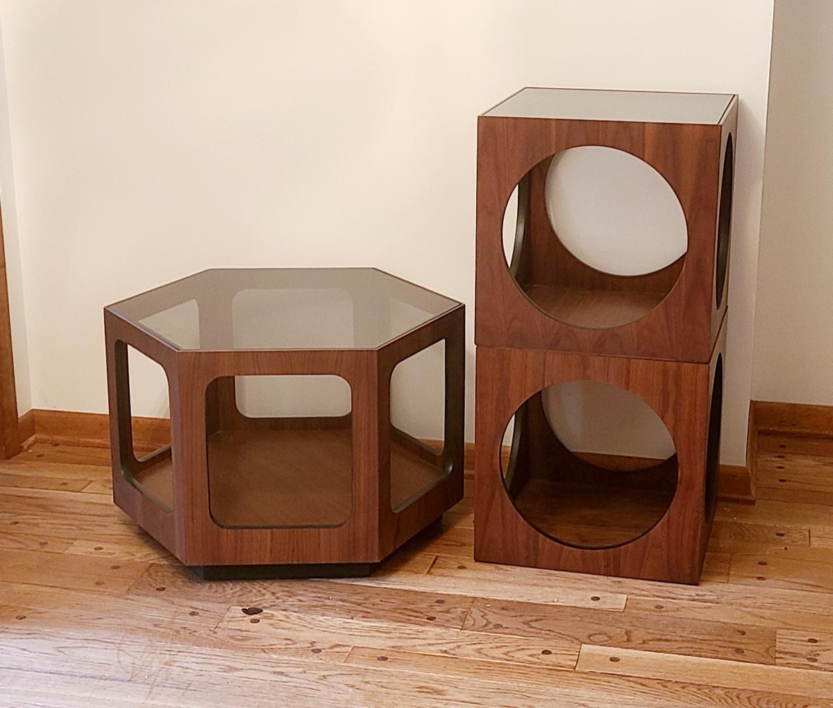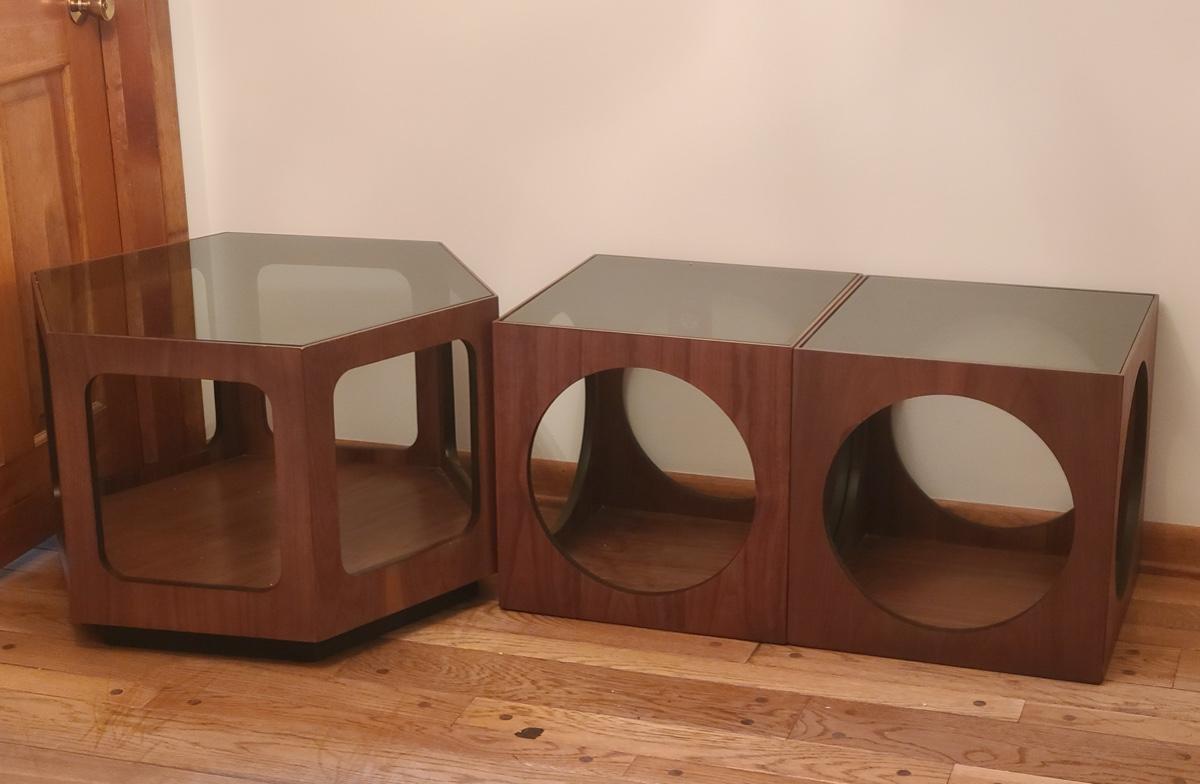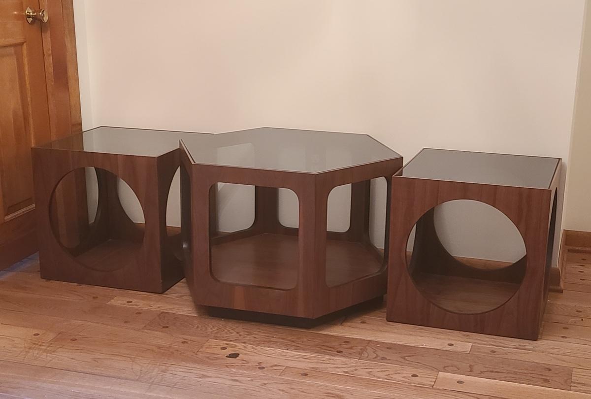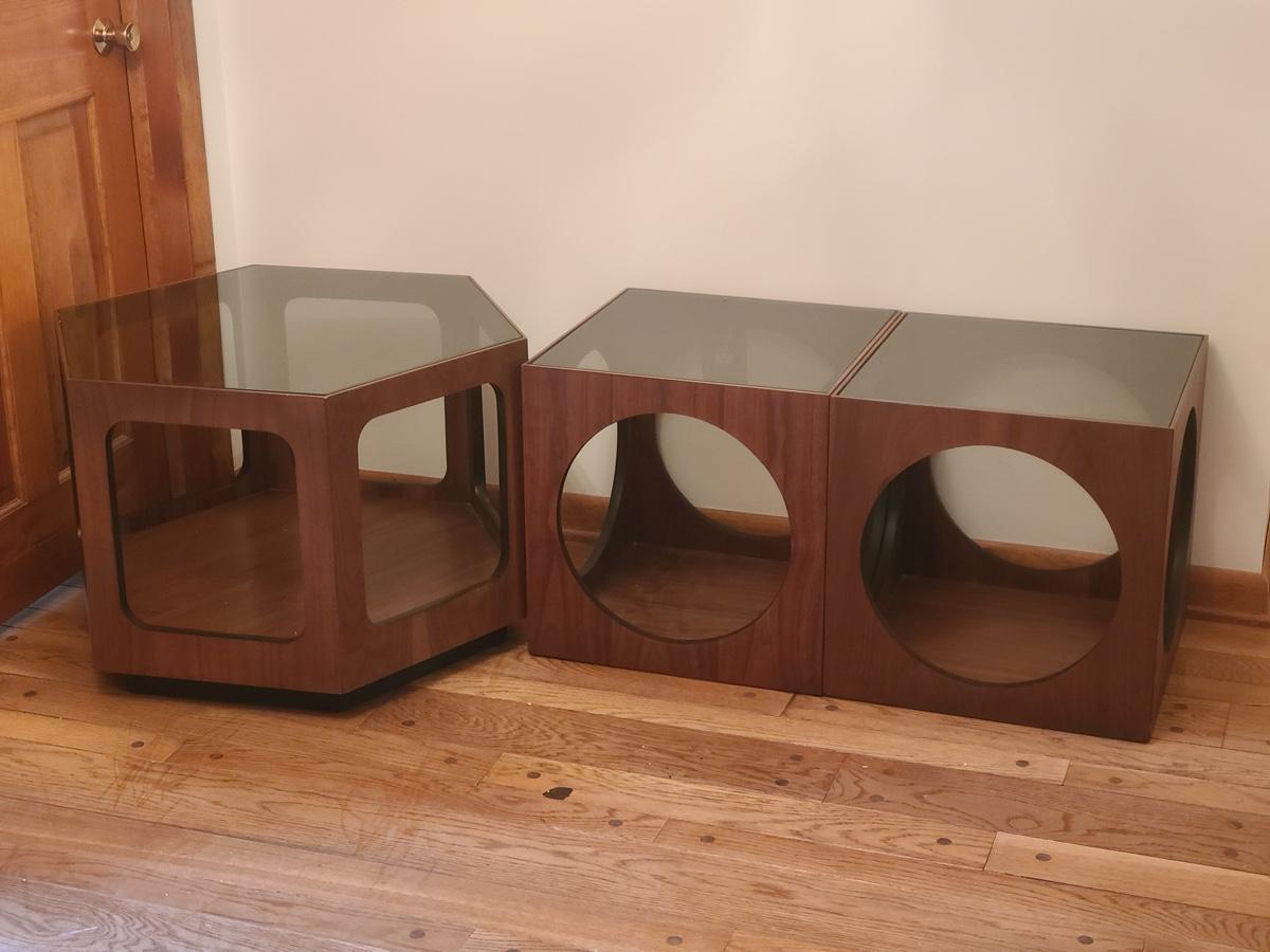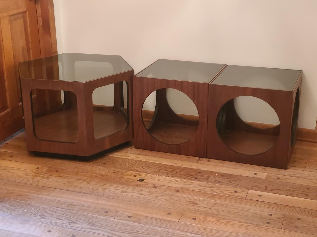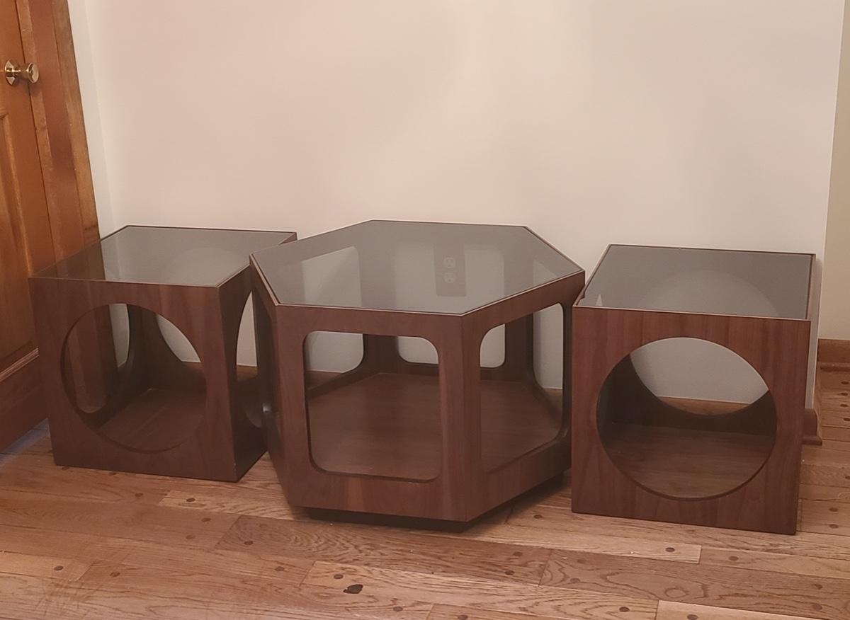 This is such a fun set. These pieces can be used together or alone. The small side tables can be used bedside too! The glass is a smokey grey color, and the wood is gorgeous. The two square end tables can be used alone flanking a couch, or put together as a coffee table. Recently these have been used stacked as seen in the pictures, and you can take out the second piece of glass, and use as cat beds! Fun MCM vintage set by Lane! The pictures show condition, measurements if taken, and what is included in the lot. Due to the large amount that we photograph and the time frame, we are not always able to take measurements. All items unless noted, are pre-owned and have been used. If you purchased furniture, you must bring help. We do not allow one person to carry large furniture out on their own. Bring help, tools and a truck for the safety of our client’s homes, and your personal safety. Company policy. Thank you.