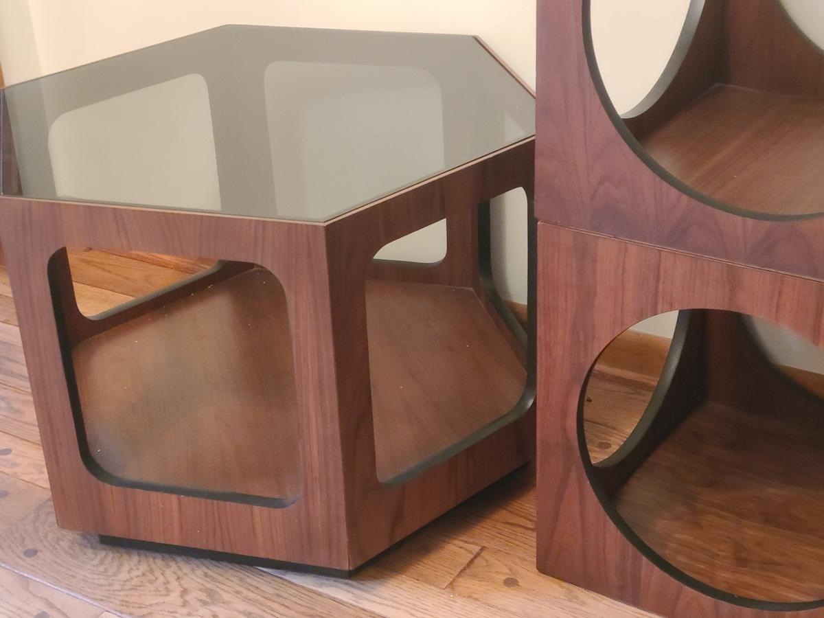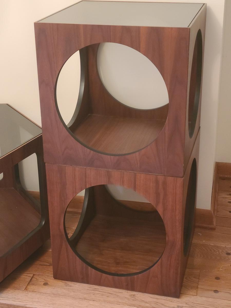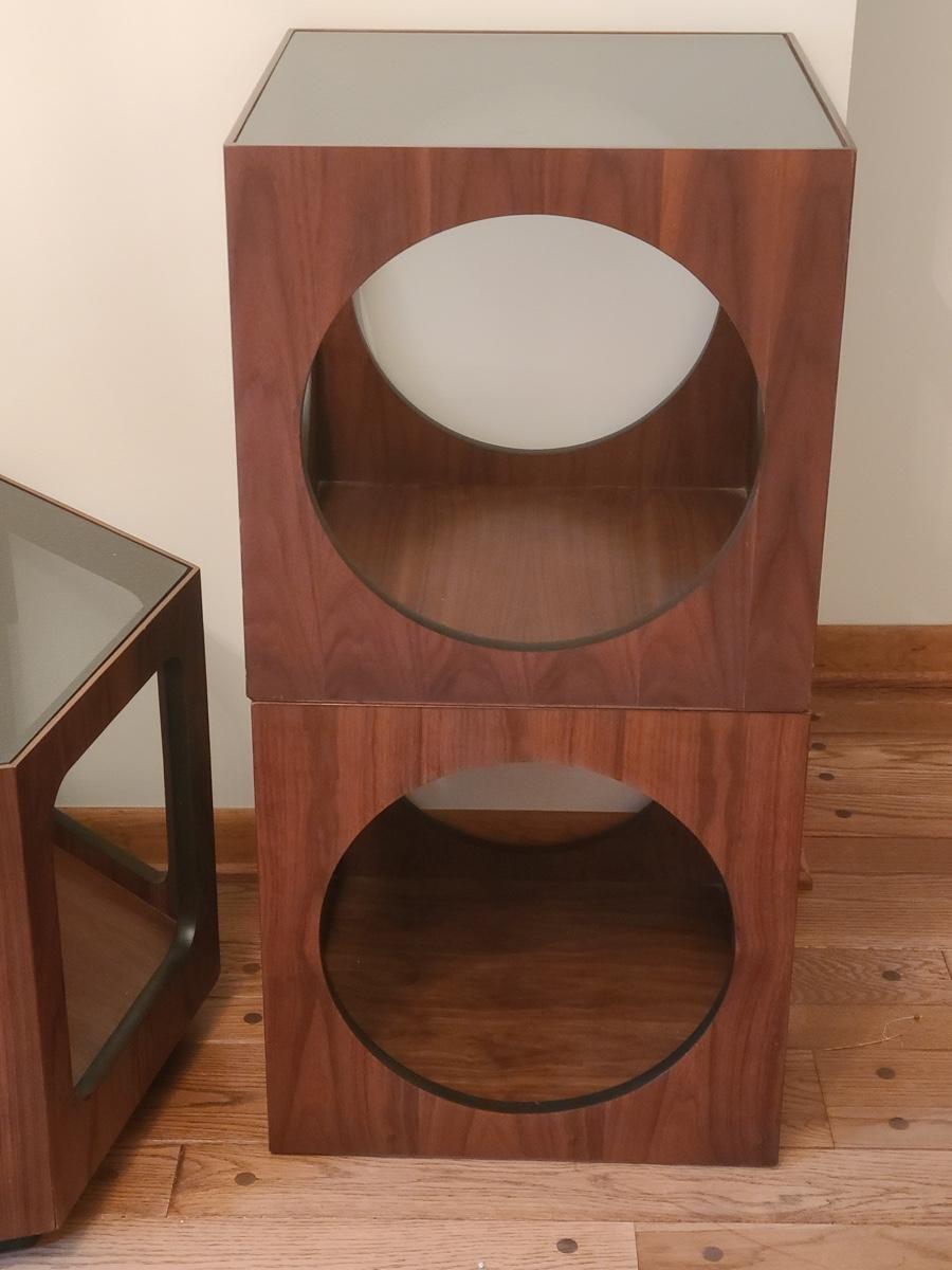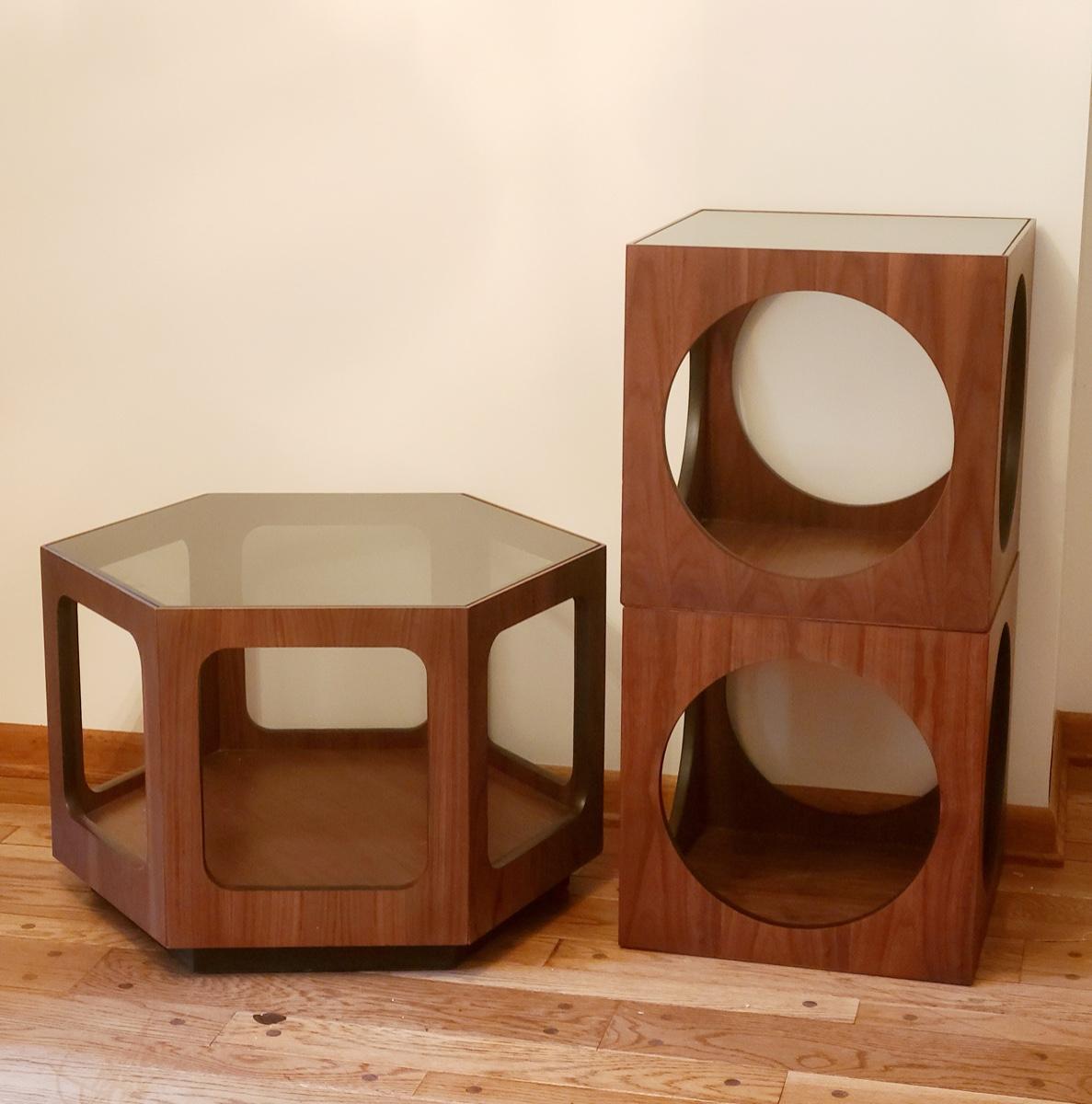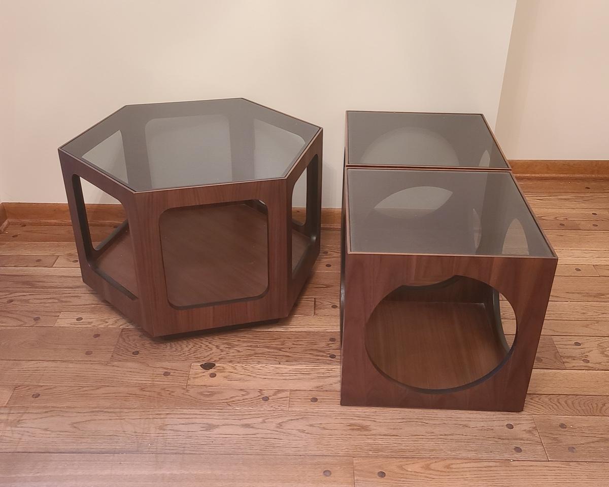 This is such a fun set. These pieces can be used together or alone. The small side tables can be used bedside too! The glass is a smokey grey color, and the wood is gorgeous. The two square end tables can be used alone flanking a couch, or put together as a coffee table. Recently these have been used stacked as seen in the pictures, and you can take out the second piece of glass, and use as cat beds! Fun MCM vintage set by Lane! The pictures show condition, measurements if taken, and what is included in the lot. Due to the large amount that we photograph and the time frame, we are not always able to take measurements. All items unless noted, are pre-owned and have been used. If you purchased furniture, you must bring help. We do not allow one person to carry large furniture out on their own. Bring help, tools and a truck for the safety of our client’s homes, and your personal safety. Company policy. Thank you.