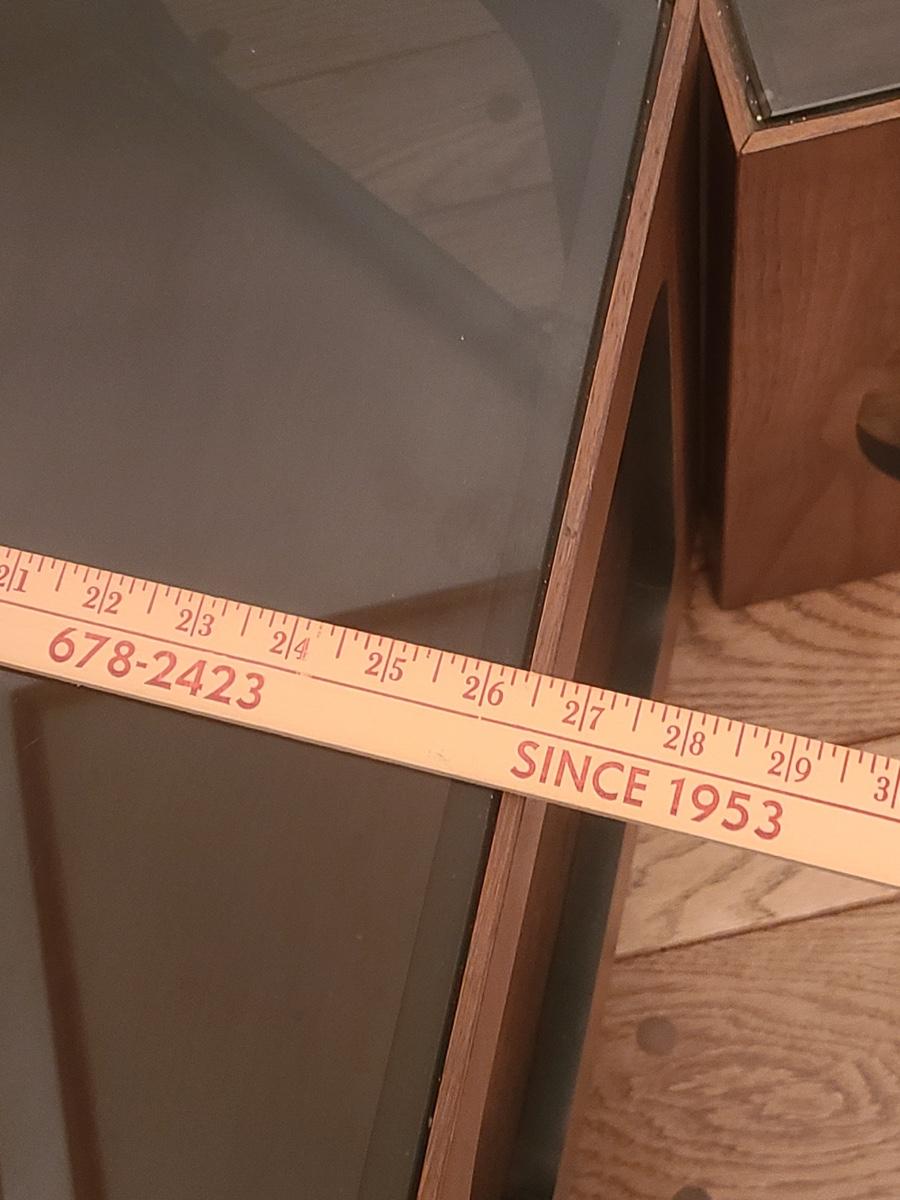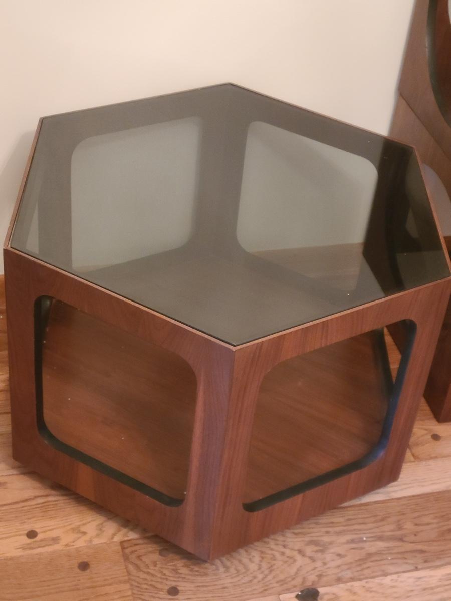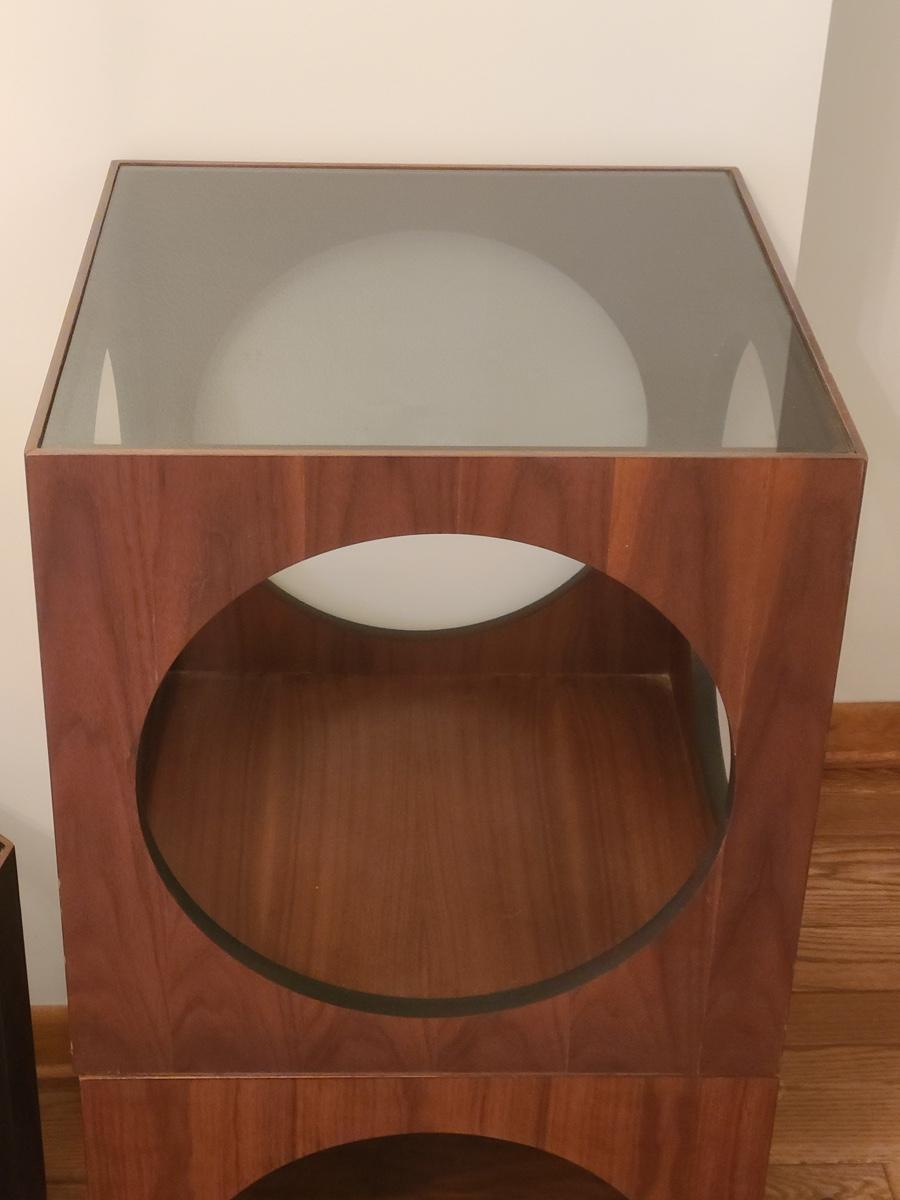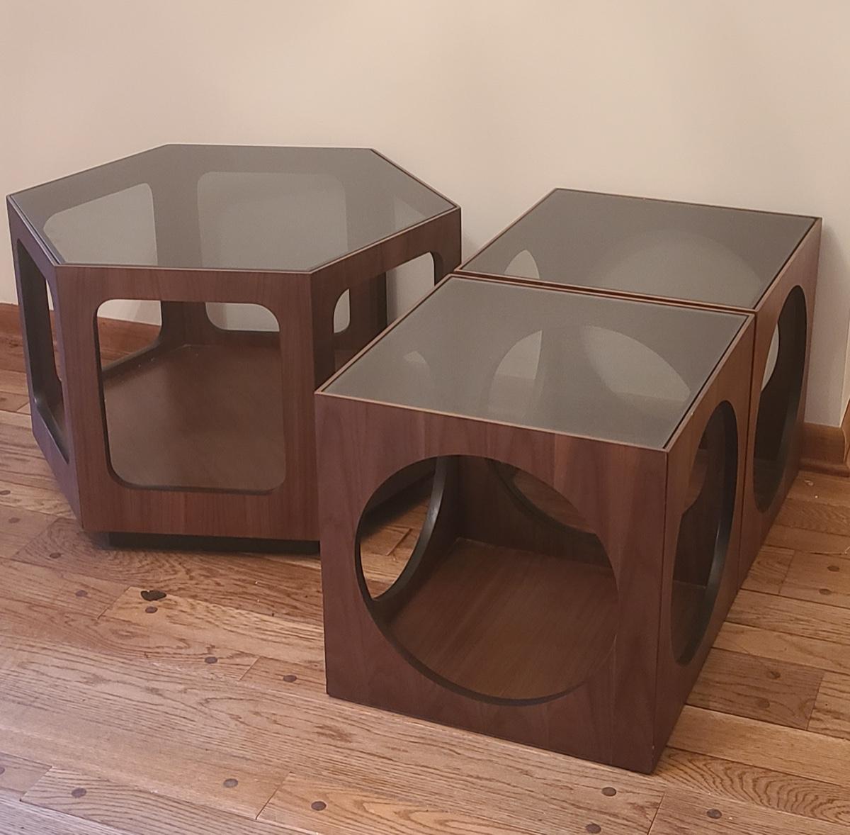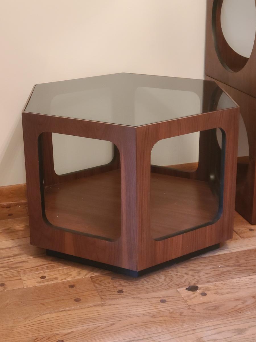 This is such a fun set. These pieces can be used together or alone. The small side tables can be used bedside too! The glass is a smokey grey color, and the wood is gorgeous. The two square end tables can be used alone flanking a couch, or put together as a coffee table. Recently these have been used stacked as seen in the pictures, and you can take out the second piece of glass, and use as cat beds! Fun MCM vintage set by Lane! The pictures show condition, measurements if taken, and what is included in the lot. Due to the large amount that we photograph and the time frame, we are not always able to take measurements. All items unless noted, are pre-owned and have been used. If you purchased furniture, you must bring help. We do not allow one person to carry large furniture out on their own. Bring help, tools and a truck for the safety of our client’s homes, and your personal safety. Company policy. Thank you.