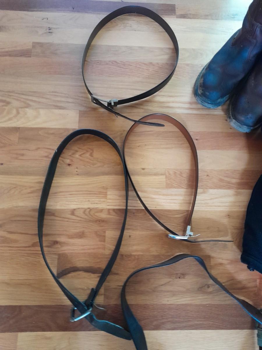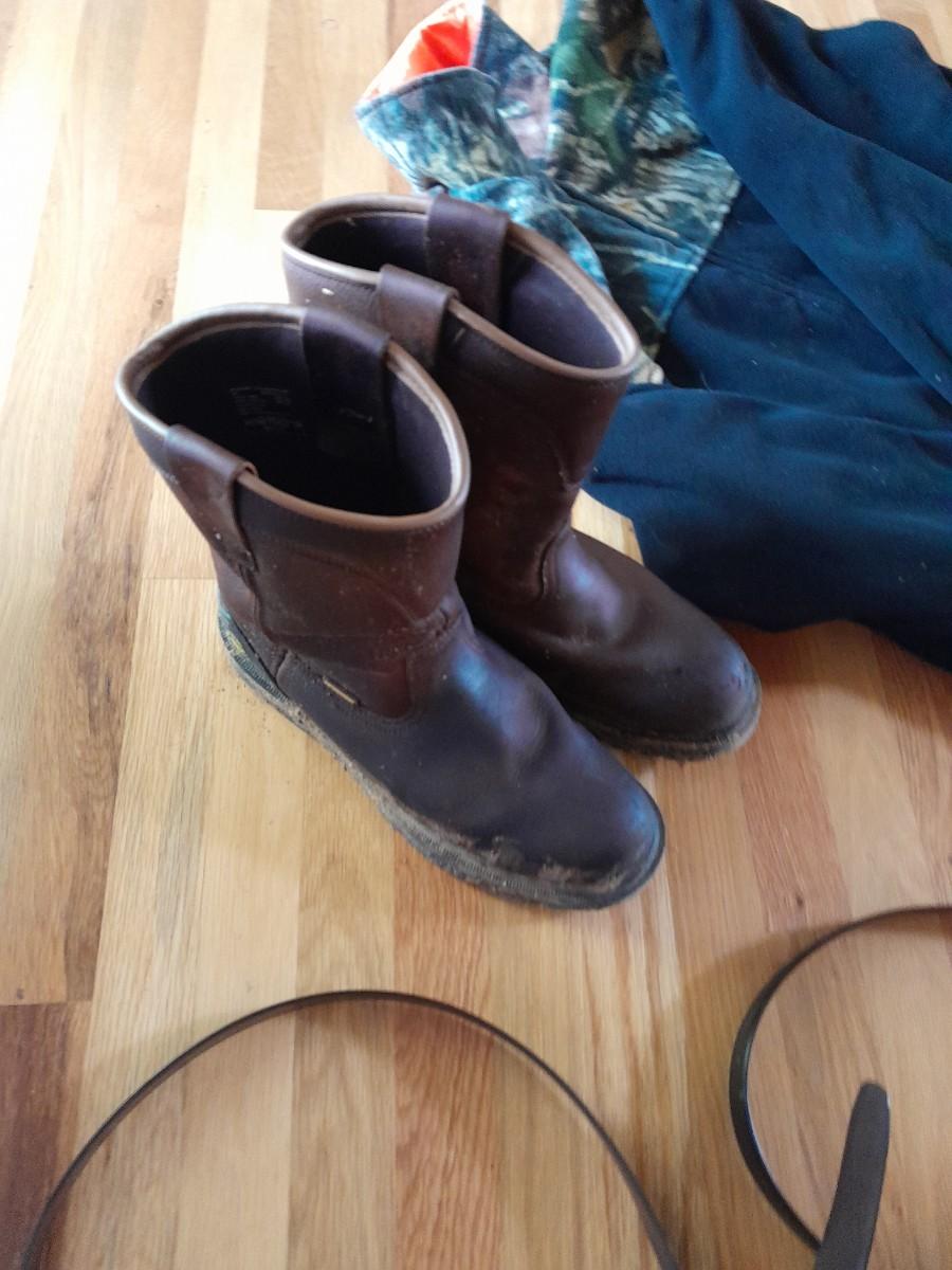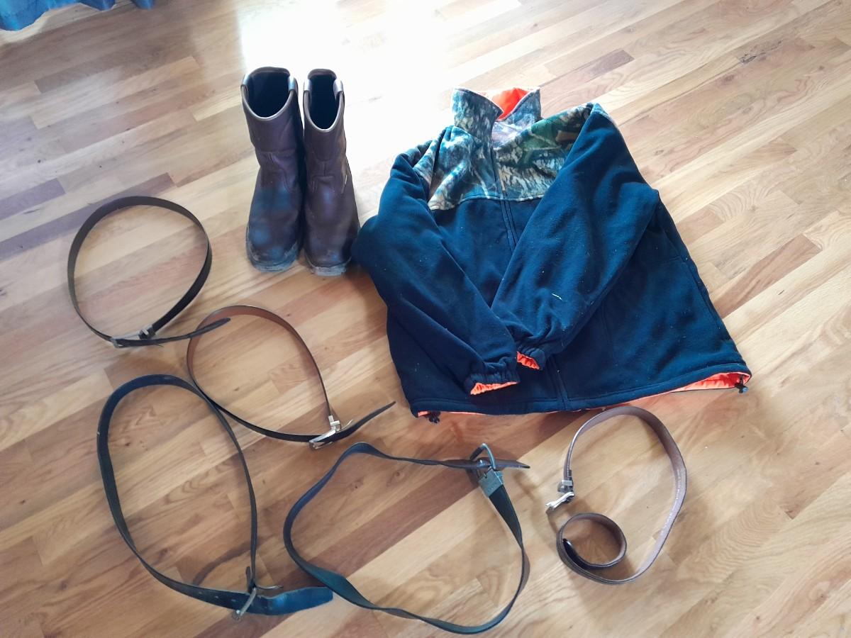 MEN'S BELTS, JACKET, AND WATERPROOF BOOTS SIZE 11