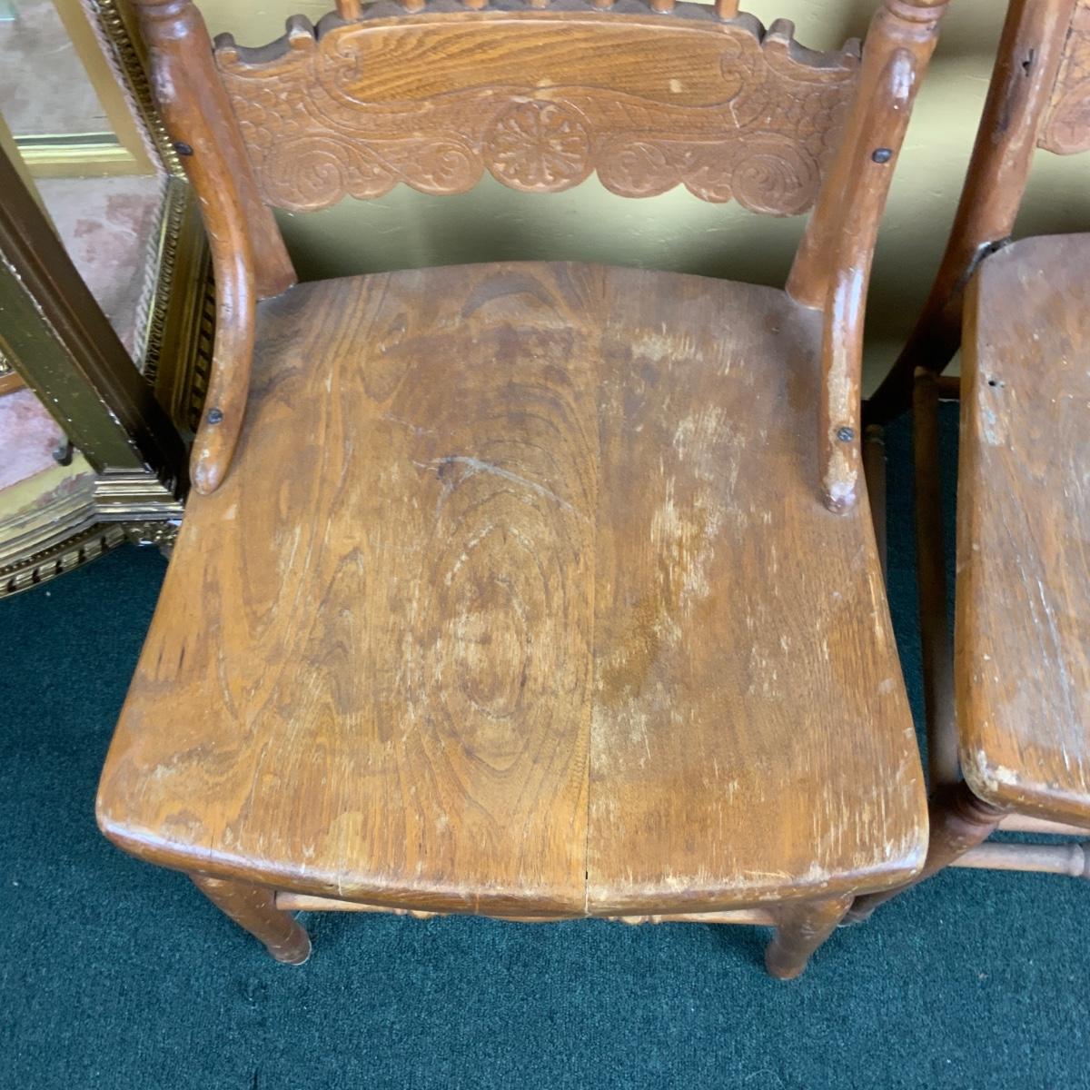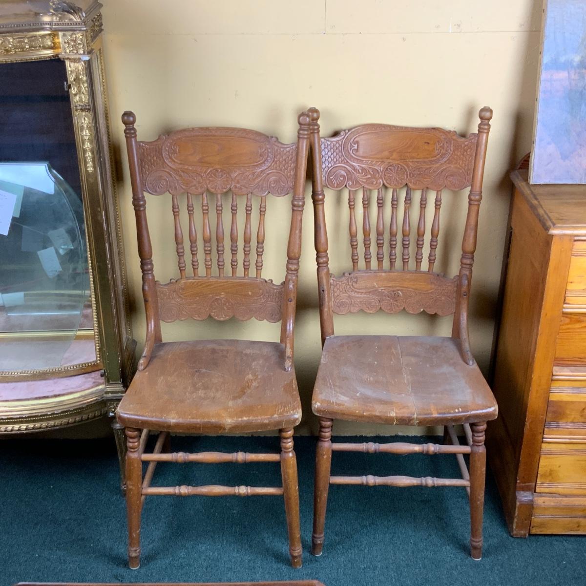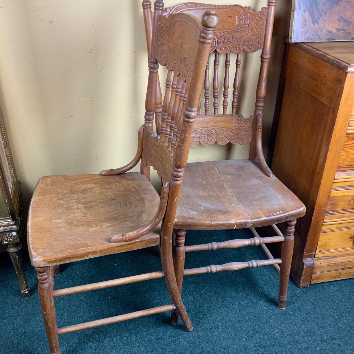 Two Pressed-Back Chairs. Nice additions to any home. //::\\ Please see photos for details and condition. No attempt has been made to hide any imperfections. All items listed in this auction are warehouse items, and need to be cleaned. A majority of the items need restoration as well. All items are sold AS IS and WITHOUT GUARANTEE. If you are uncertain about an item, DO NOT BID. Due to the nature of this online auction in-person inspection is HIGHLY recommended. All Sales are FINAL. Pick Up Times are FIRM. Please confirm with your own schedule that you can pick up in the scheduled times listed in the Terms and Conditions. Any questions please message the auctioneer. DO NOT Contact The Harp Gallery.