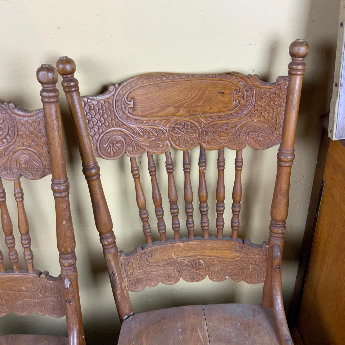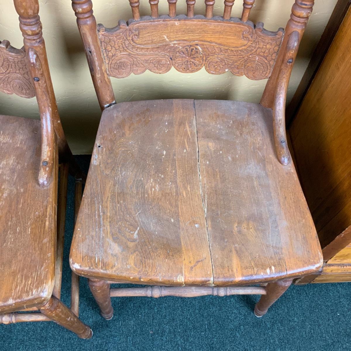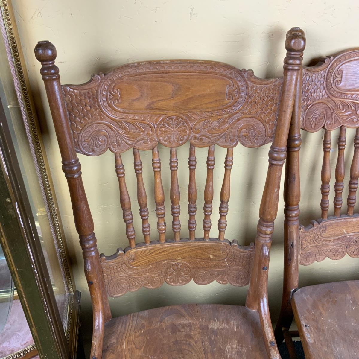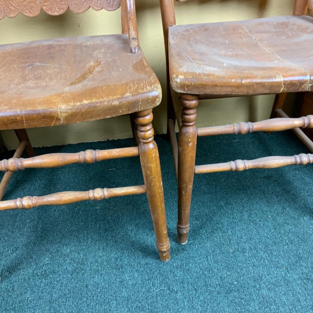 Two Pressed-Back Chairs. Nice additions to any home. //::\\ Please see photos for details and condition. No attempt has been made to hide any imperfections. All items listed in this auction are warehouse items, and need to be cleaned. A majority of the items need restoration as well. All items are sold AS IS and WITHOUT GUARANTEE. If you are uncertain about an item, DO NOT BID. Due to the nature of this online auction in-person inspection is HIGHLY recommended. All Sales are FINAL. Pick Up Times are FIRM. Please confirm with your own schedule that you can pick up in the scheduled times listed in the Terms and Conditions. Any questions please message the auctioneer. DO NOT Contact The Harp Gallery.