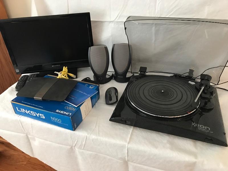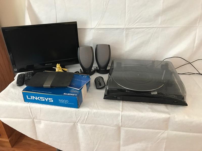 Included in this lot is a Linksys N900 dual band smart wi-fi router, pair of Hartman/Kardon computer speakers, Sansui monitor, Dynex wireless mouse and Ion Profile LP USB Turntable.
