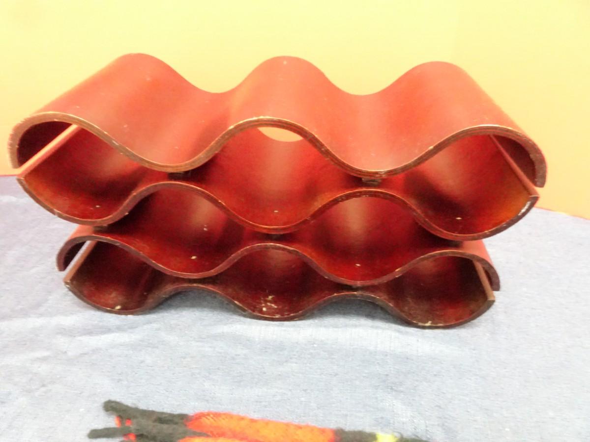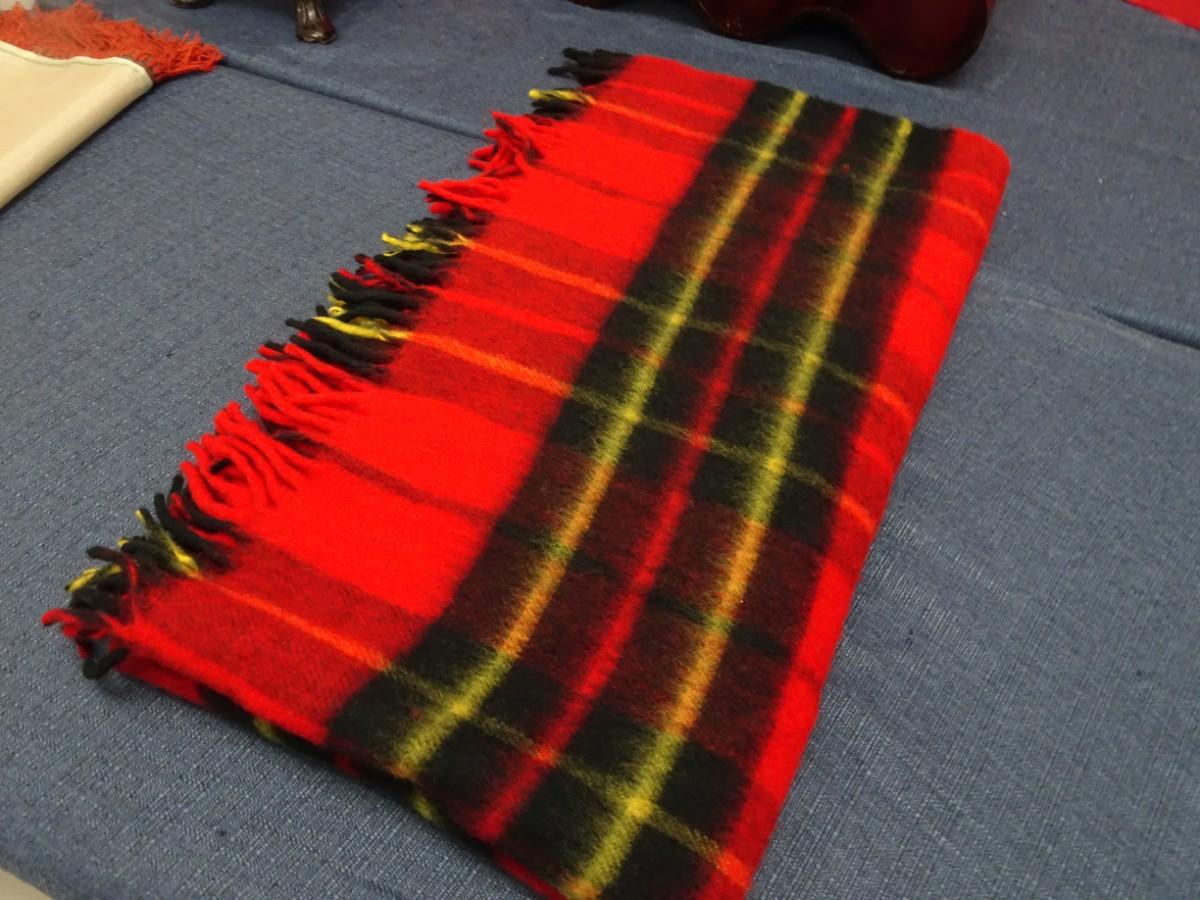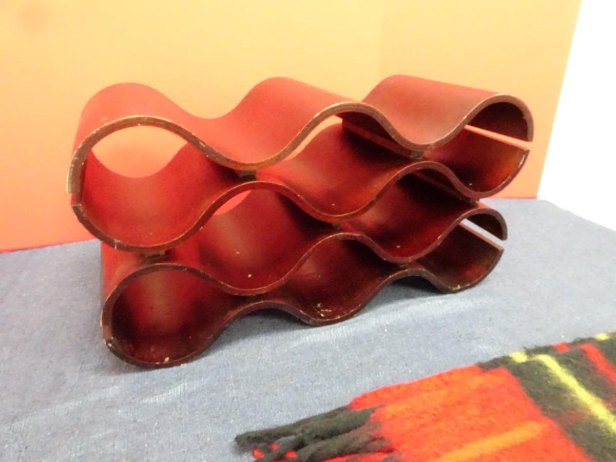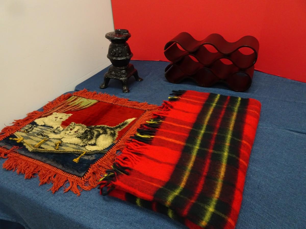 LOT 517. PLAID BLANKET, WOOD WINE BOTTLE STAND AND HOME DECOR