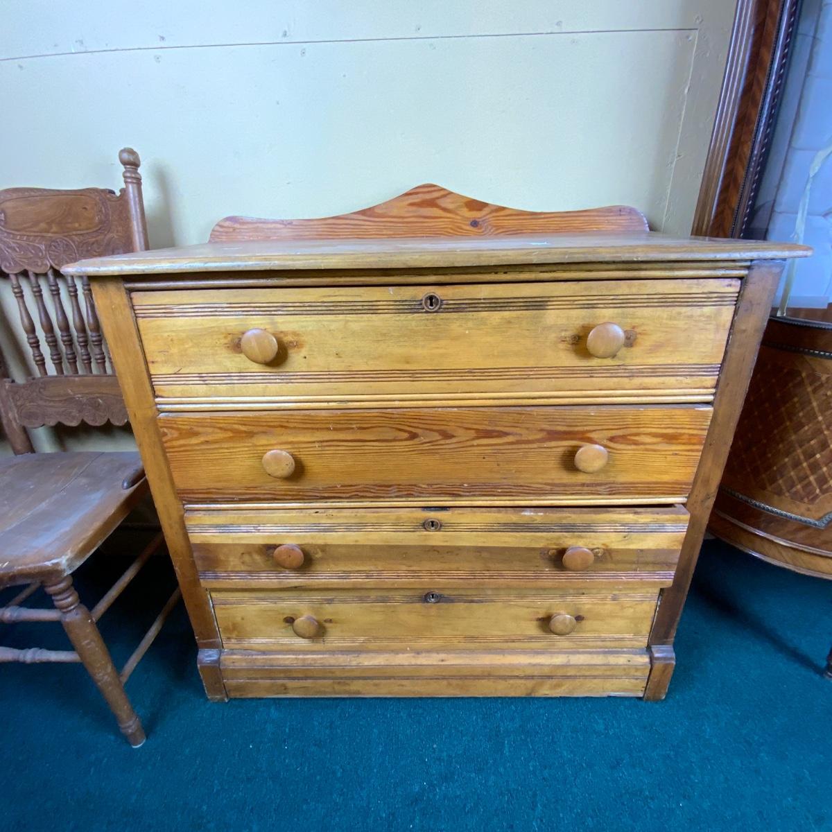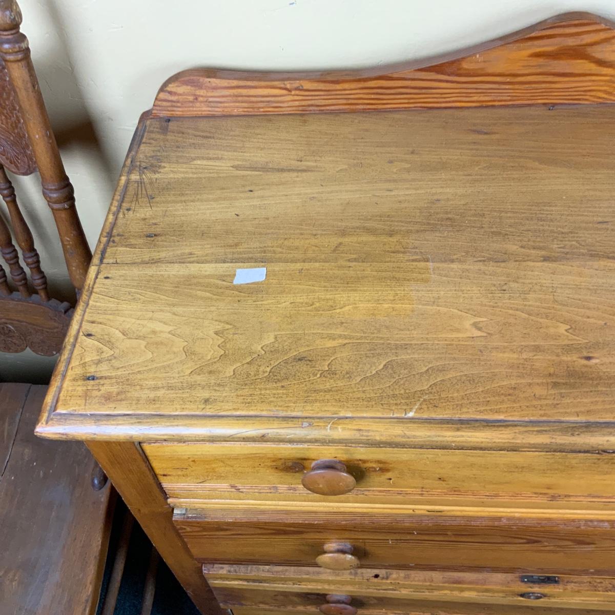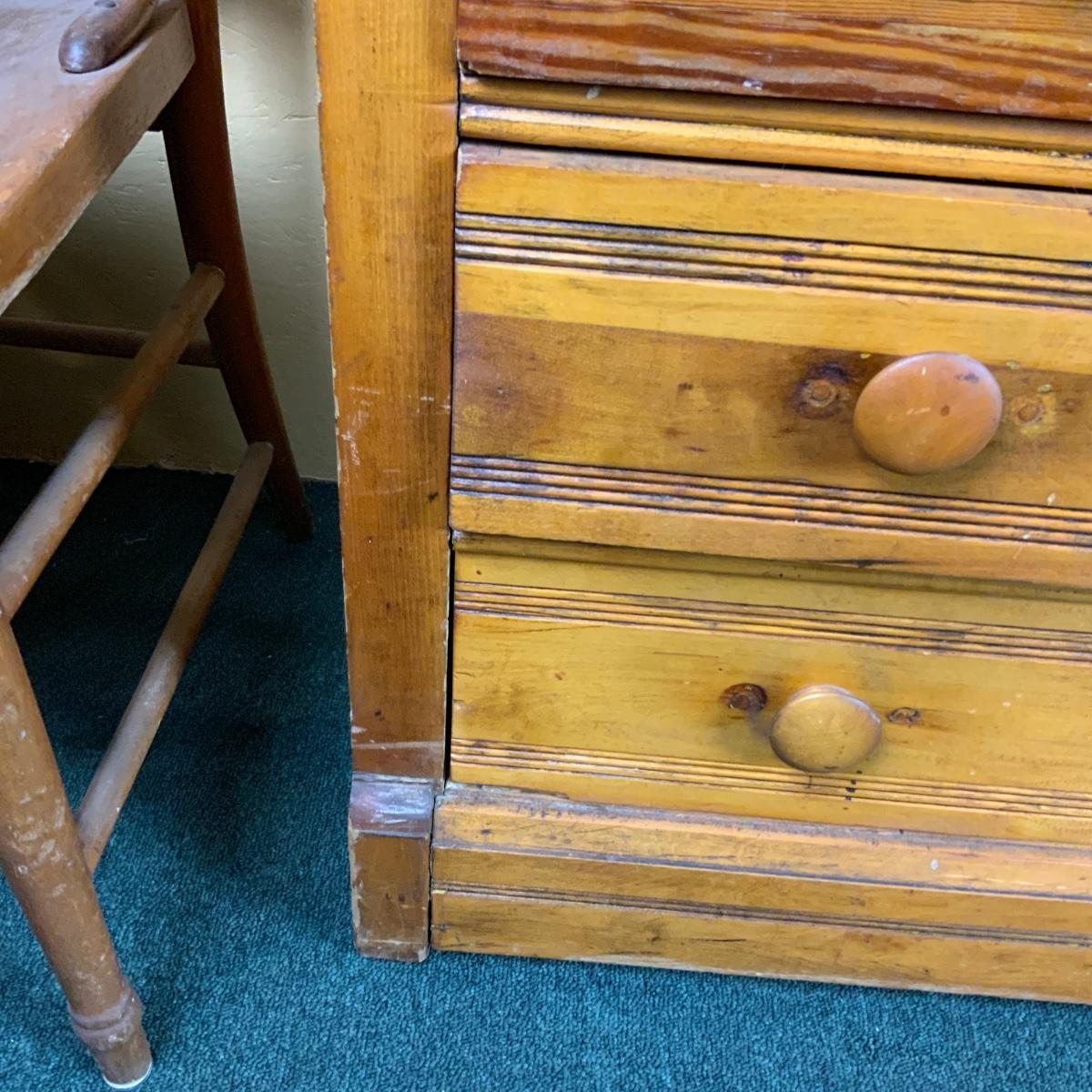 Pine Chest of Drawers. Rustic and perfect for the cabin! //::\\ Please see photos for details and condition. No attempt has been made to hide any imperfections. All items listed in this auction are warehouse items, and need to be cleaned. A majority of the items need restoration as well. All items are sold AS IS and WITHOUT GUARANTEE. If you are uncertain about an item, DO NOT BID. Due to the nature of this online auction in-person inspection is HIGHLY recommended. All Sales are FINAL. Pick Up Times are FIRM. Please confirm with your own schedule that you can pick up in the scheduled times listed in the Terms and Conditions. Any questions please message the auctioneer. DO NOT Contact The Harp Gallery.