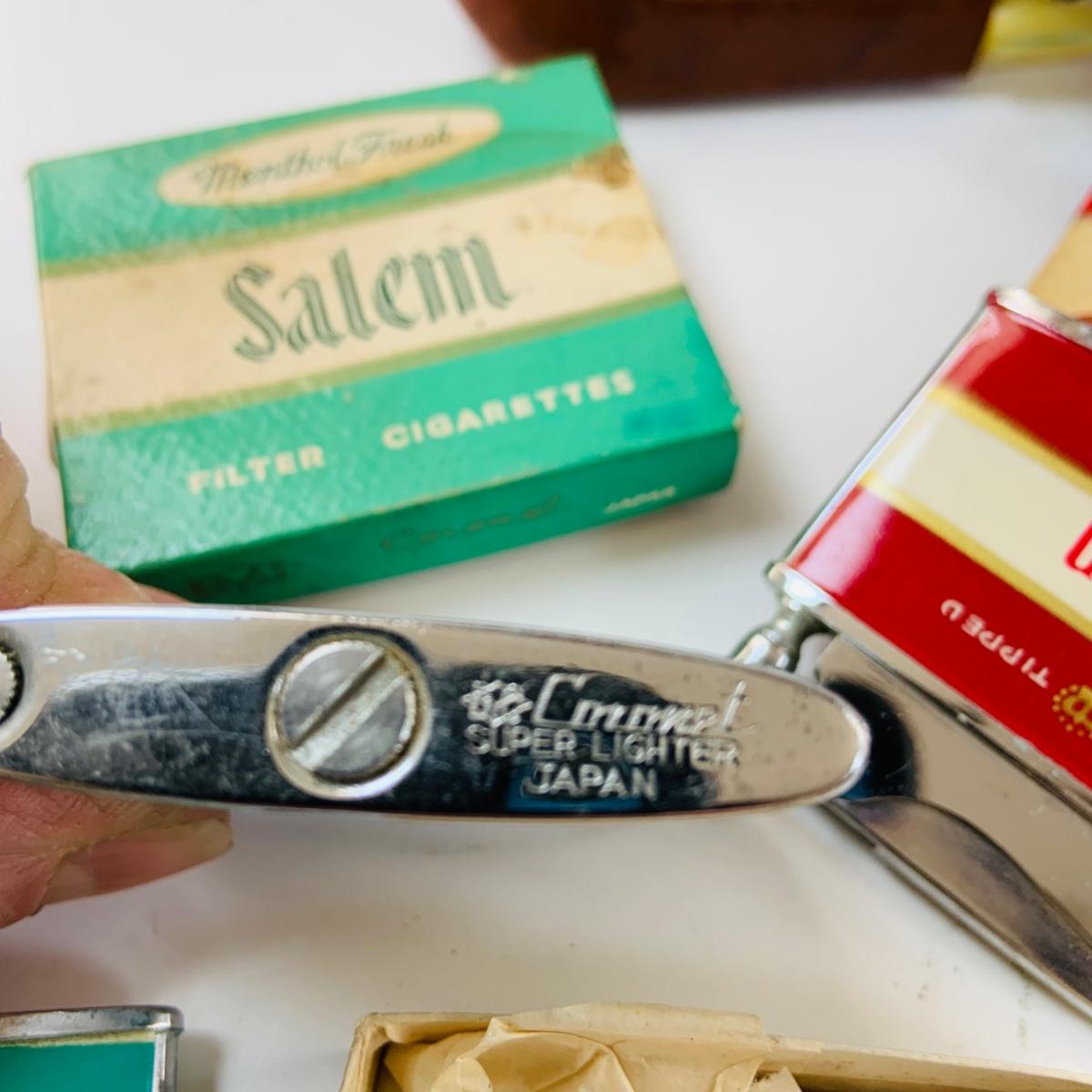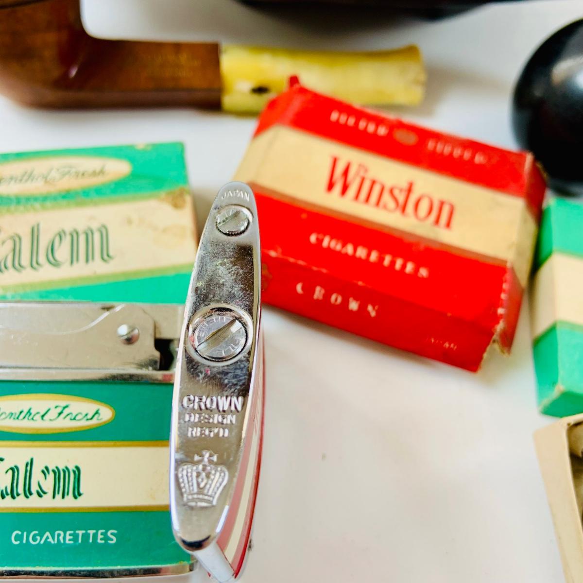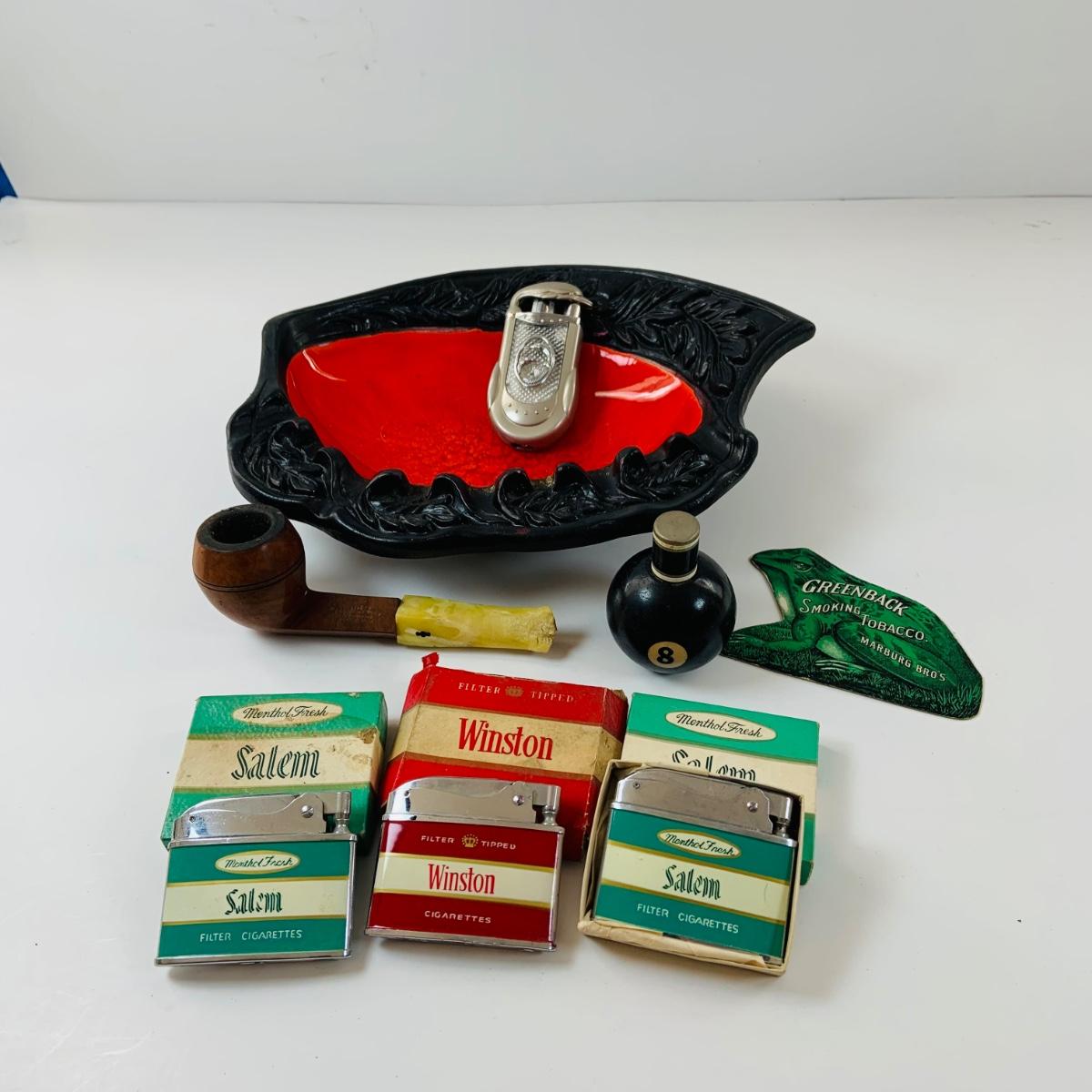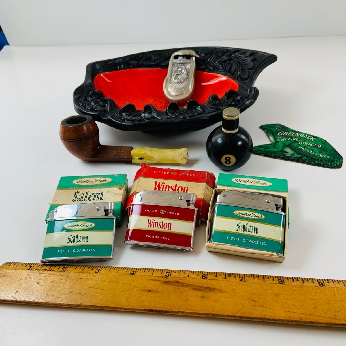 Lot 517: Vintage Eight Ball Lighter, Salem and Winston Cigarettes Branded Lighters, Pipe,Ashtray and More
