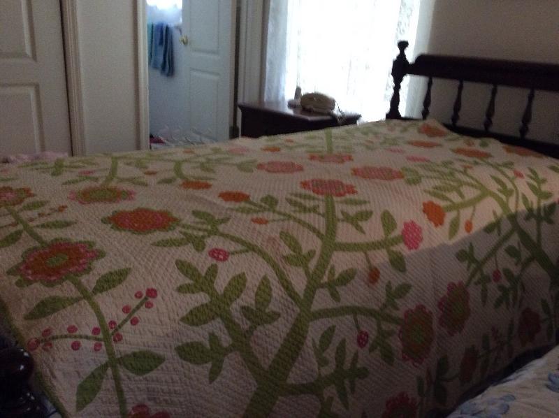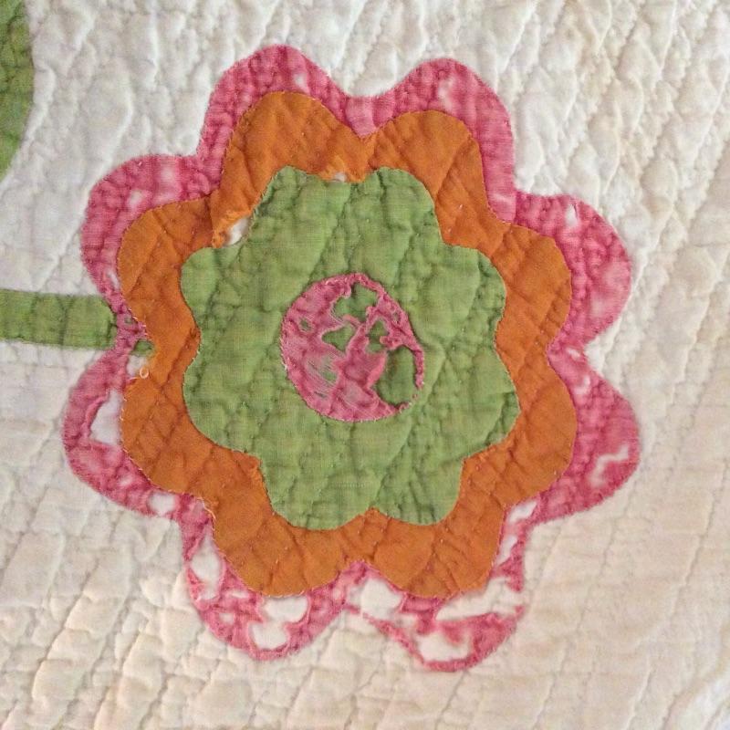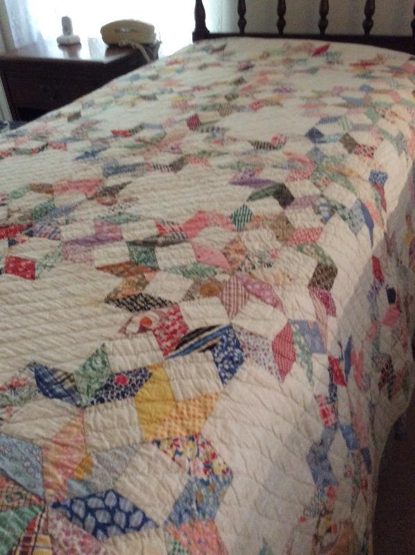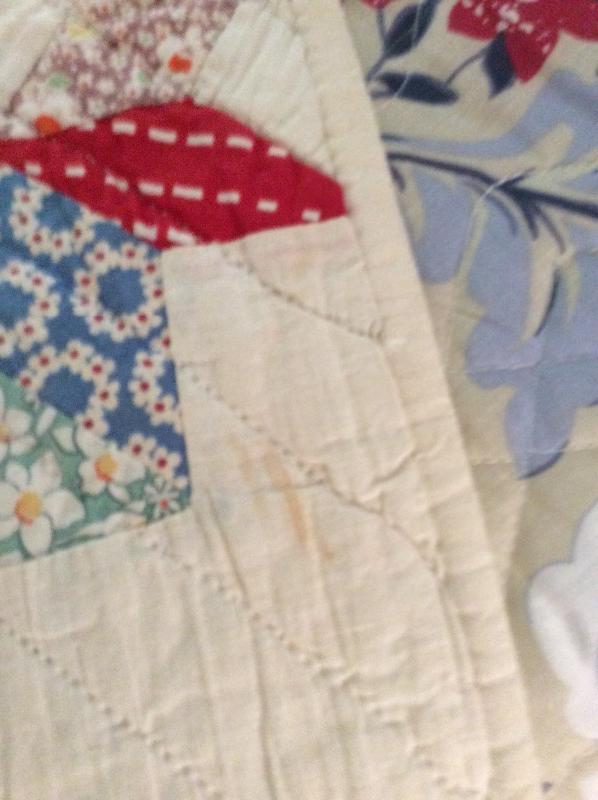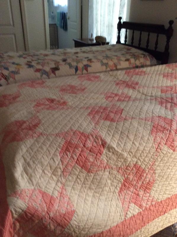 Three vintage, hand sewn quilts. All have different patterns and are twin size. Very good condition for age, although one has been more loved showing rips and stains.