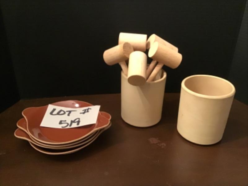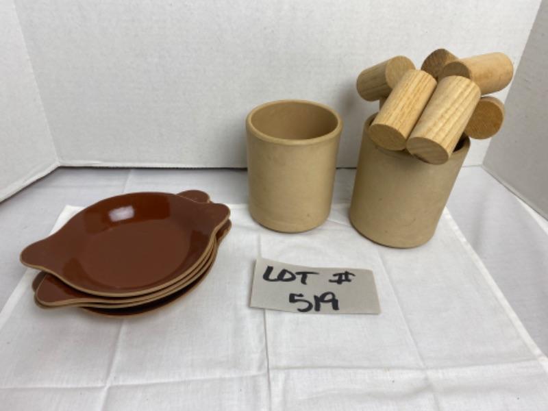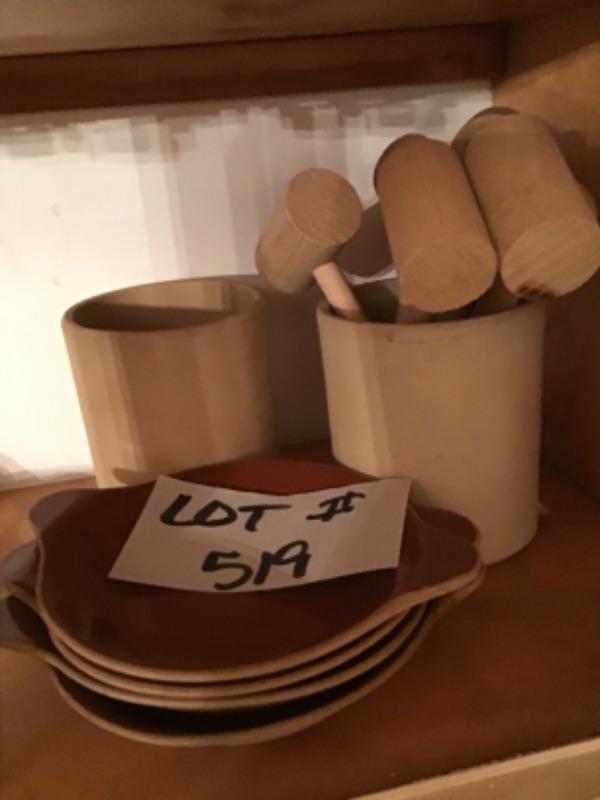 CRAB MALLETS, POTTERY JARS, 4 CERAMIC APPETIZER PLATES