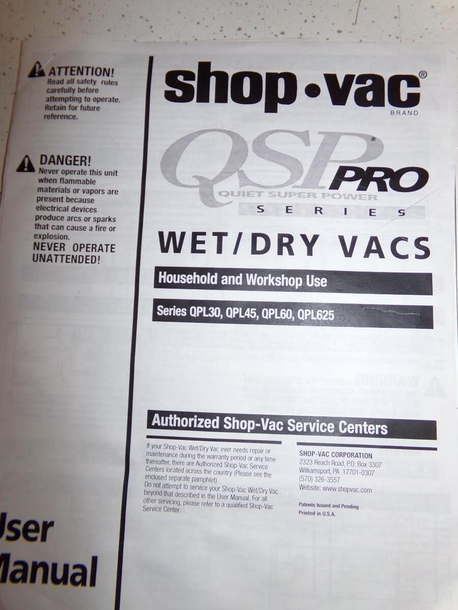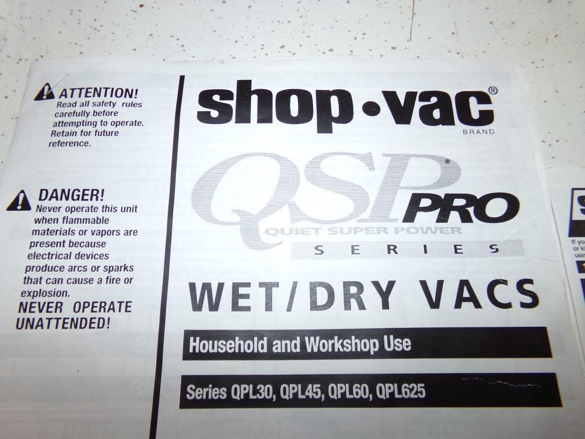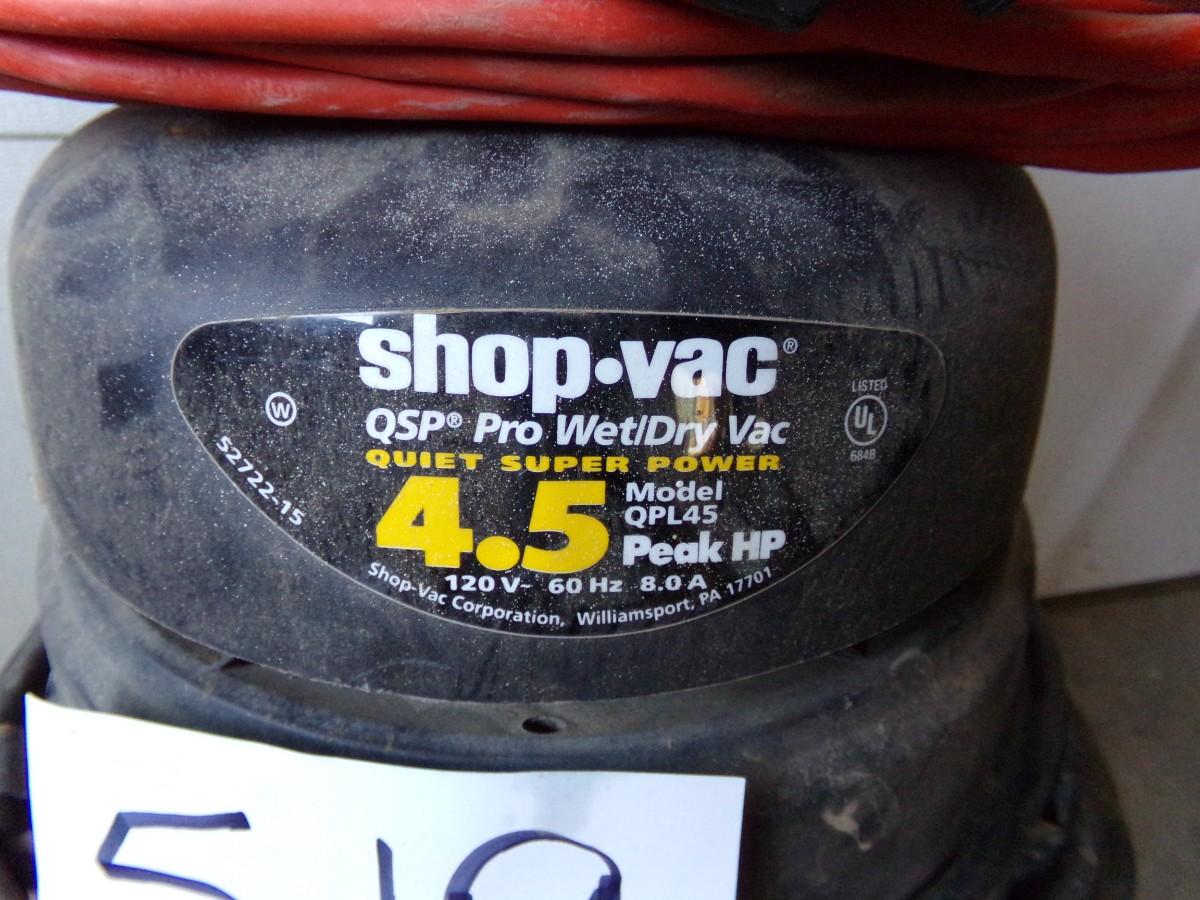 12 GALLON SHOP-VAC QSP PRO WET/DRY VAC. 4.5 HP. HAS ORIGINAL OWNERS MANUAL. ALSO COMES WITH EXTENSION CORD.