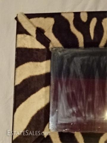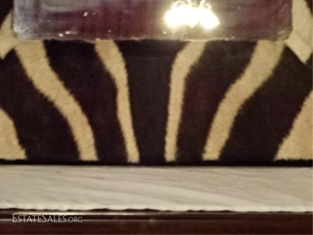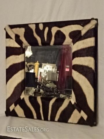 LOT 51C: ZEBRA PRINT NATURAL STEER HIDE FRAMED MIRROR, VERY GOOD CONDITION, 25" X 25", SKU387.60