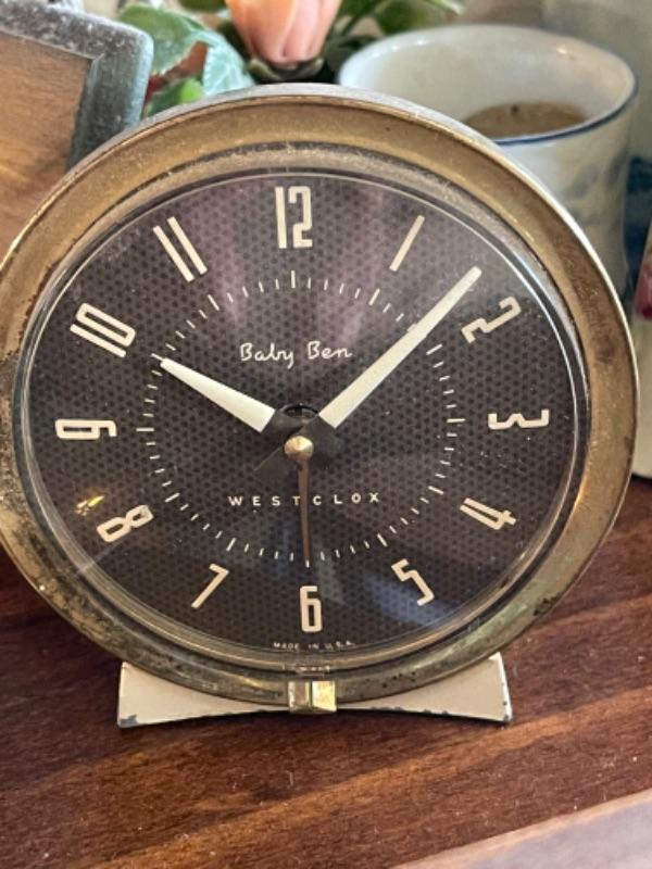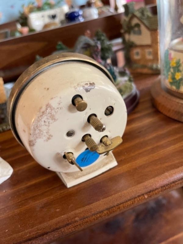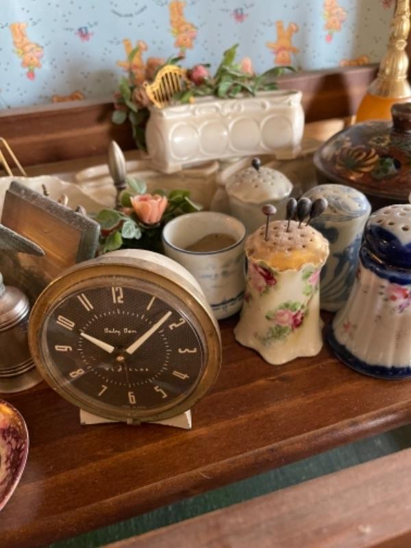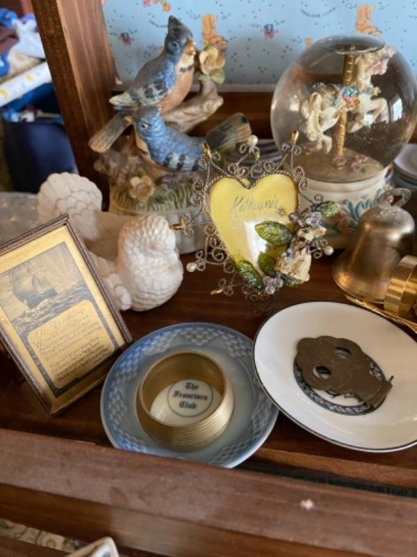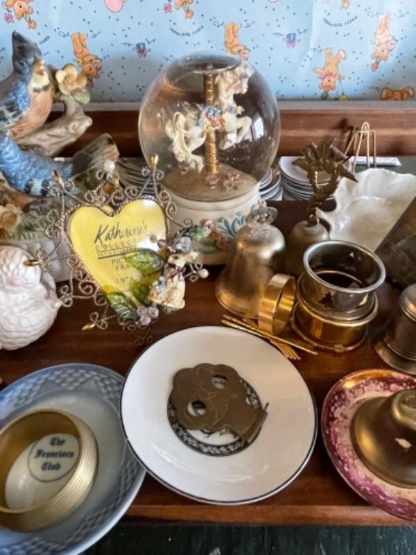 Lot 51L. Collection of knick knacks and smalls“”jewelry trays, cloisonné powder holders, Thomas Kinkade houses, musical merry-go-round in dome, Westclox Ben clock, frames, porcelain hat pin holders, etc.--$75