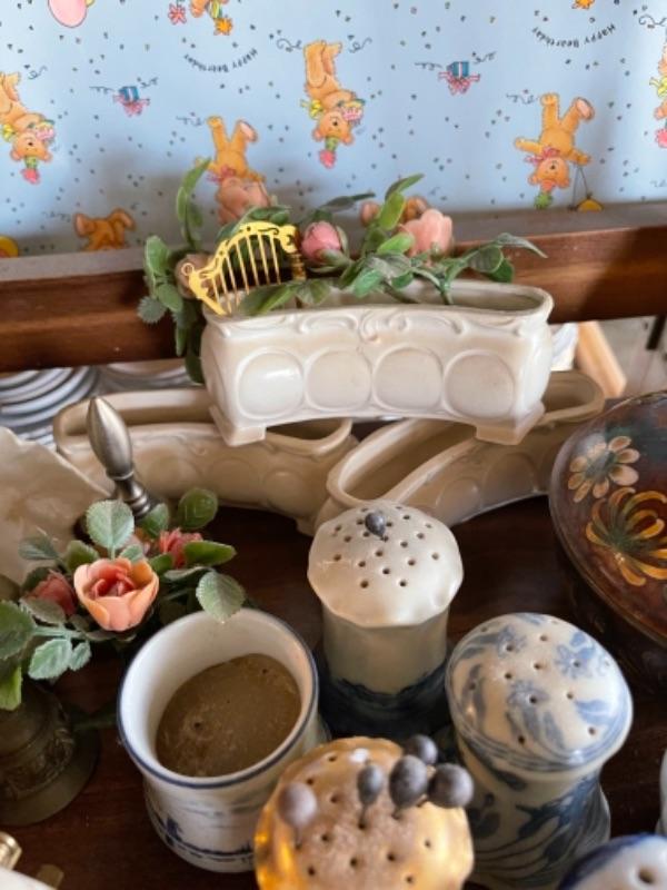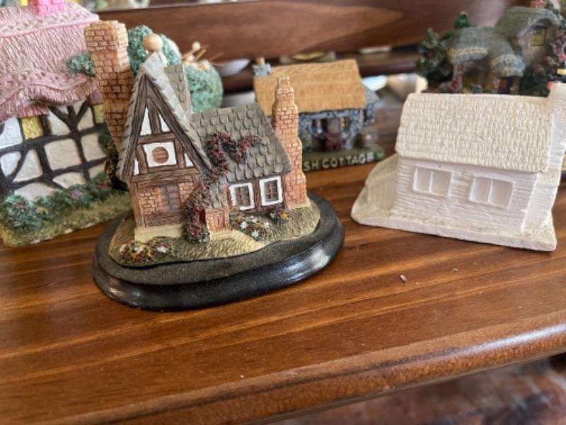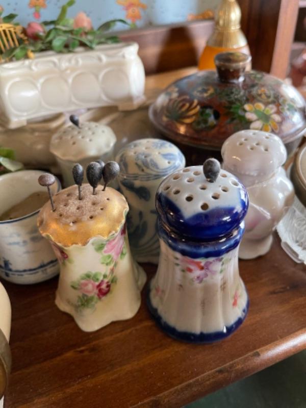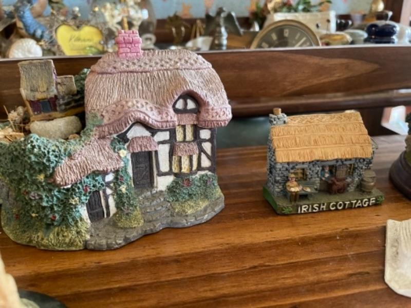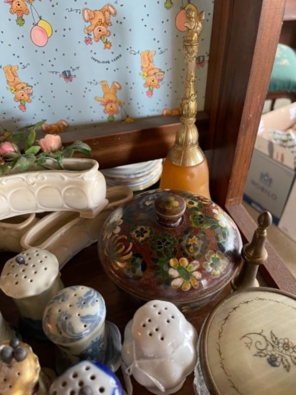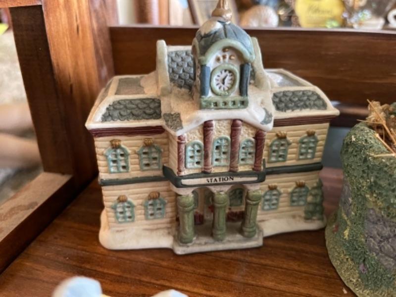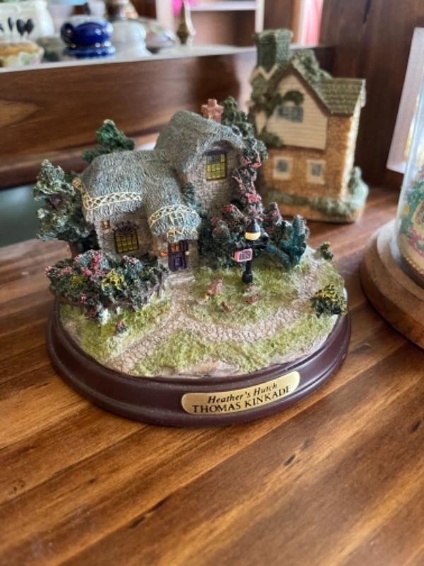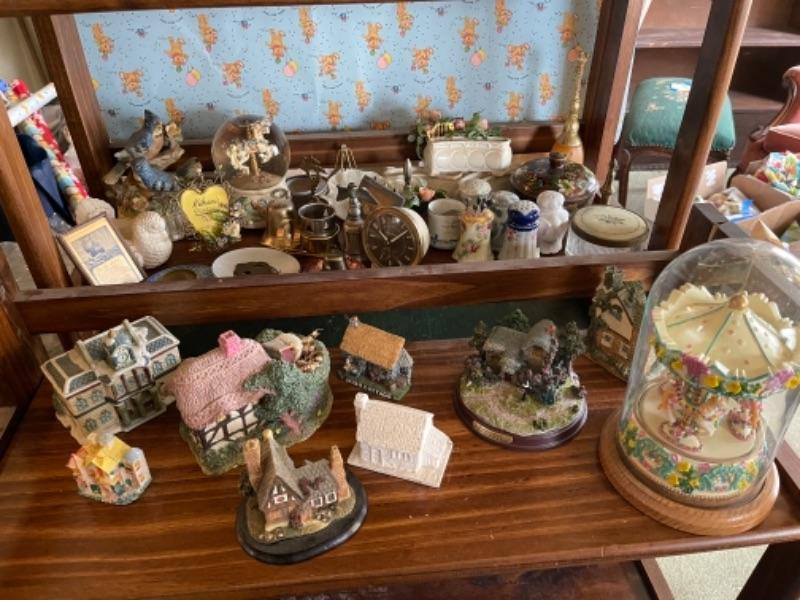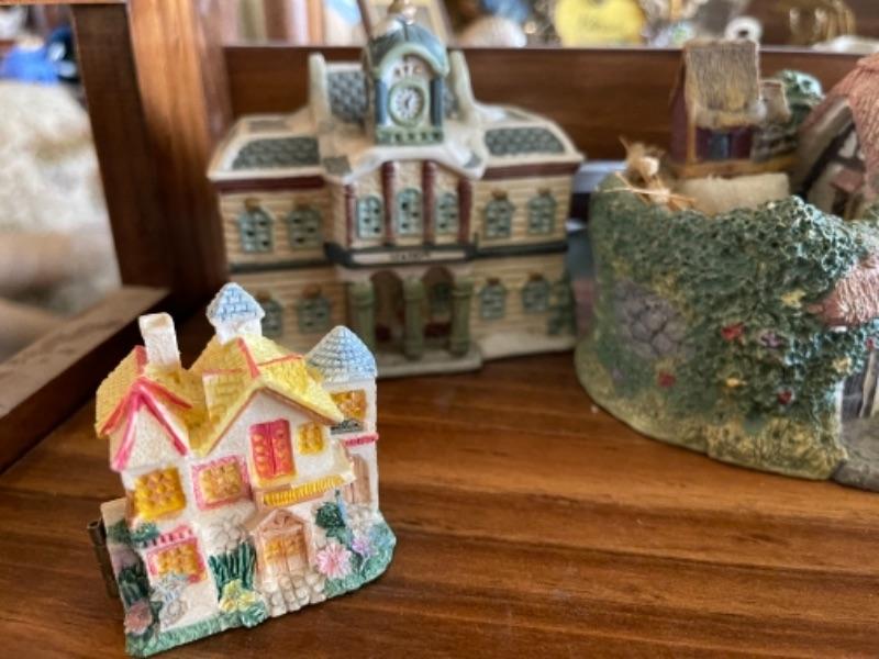 Lot 51L. Collection of knick knacks and smalls“”cloisonné powder holders, Thomas Kinkade houses, music box, porcelain hat pin holders, etc.--$75