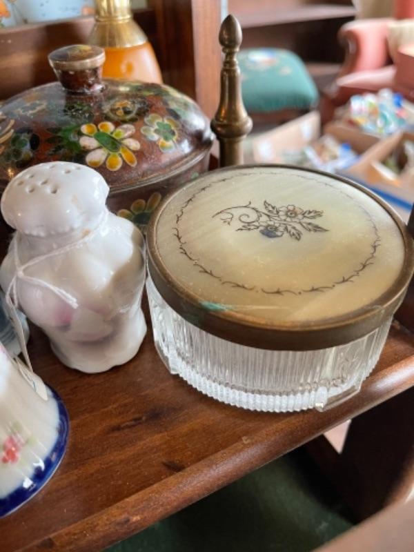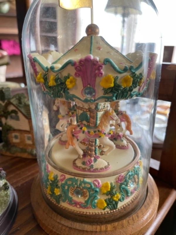 Lot 51L. Collection of knick knacks and smalls“”jewelry trays, cloisonné powder holders, Thomas Kinkade houses, musical merry-go-round in dome, Westclox Ben clock, frames, porcelain hat pin holders, etc.--Was $75 - -NOW $20