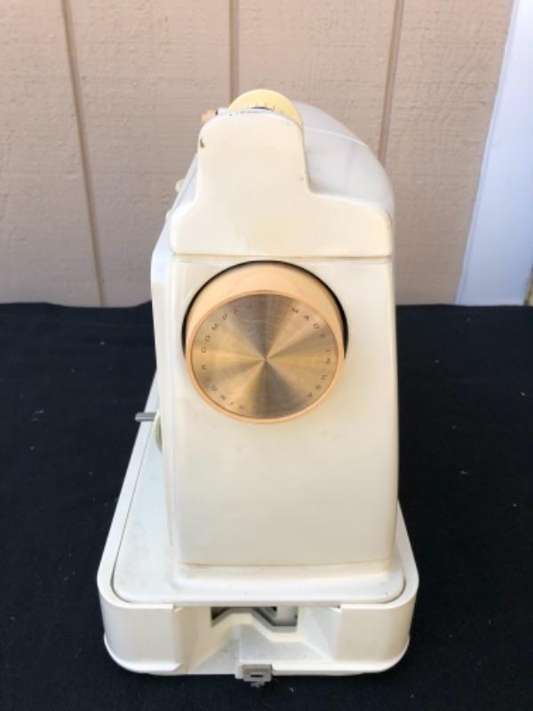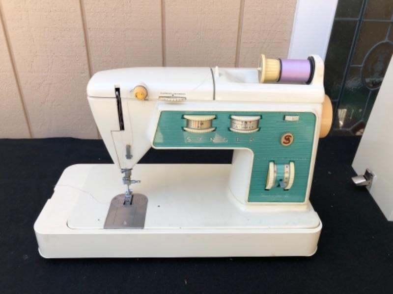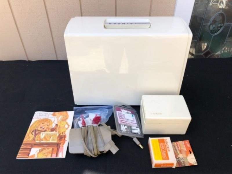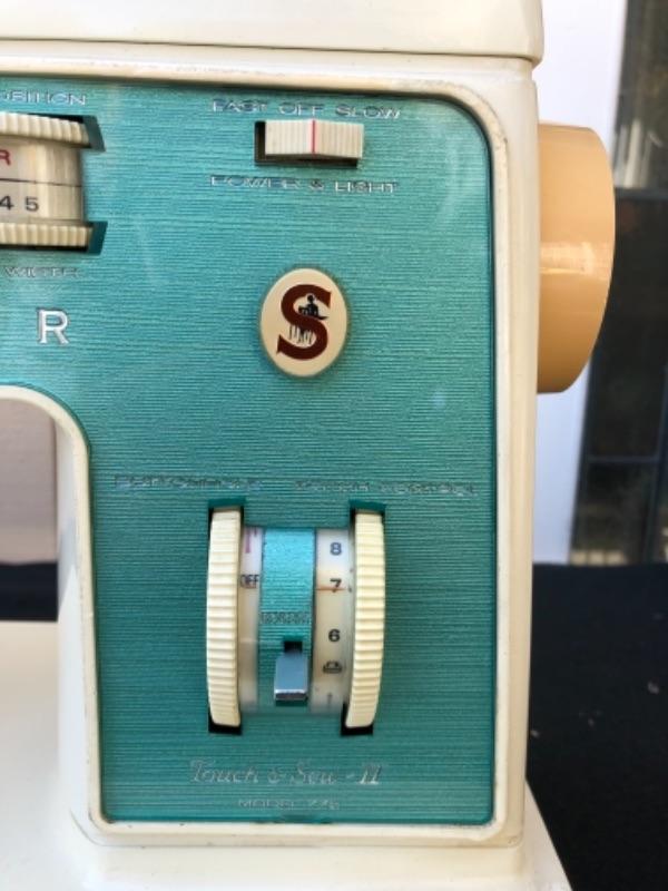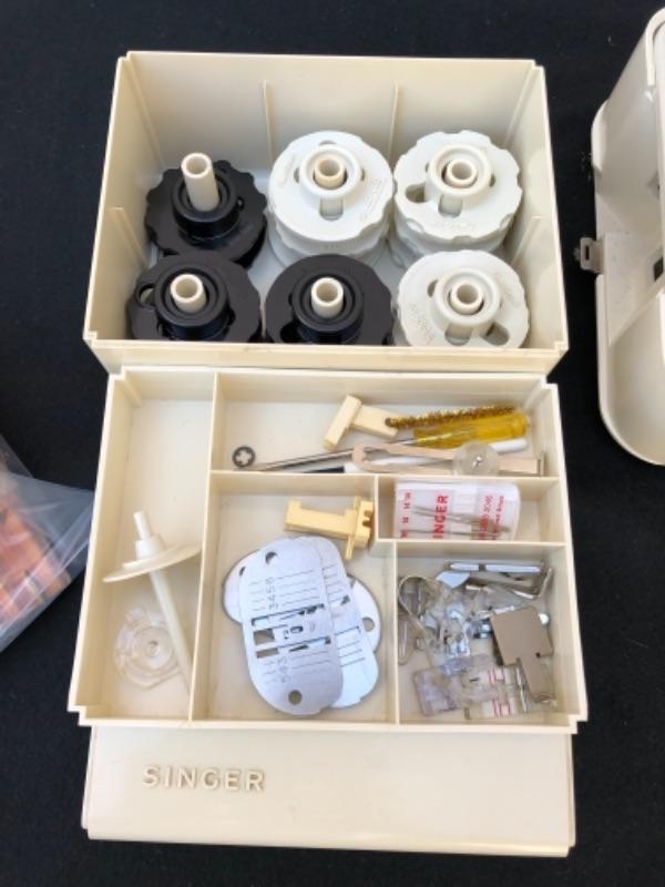 Lot 51L. Vintage Singer Sewing Machine Touch and Sew II Model 775, in case with box of attachments and bag of sewing notions, and works “” $125