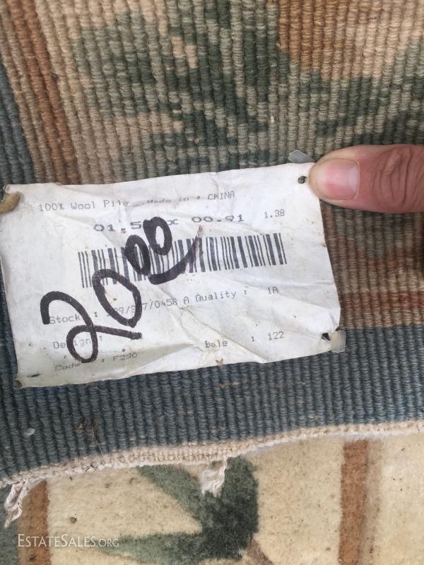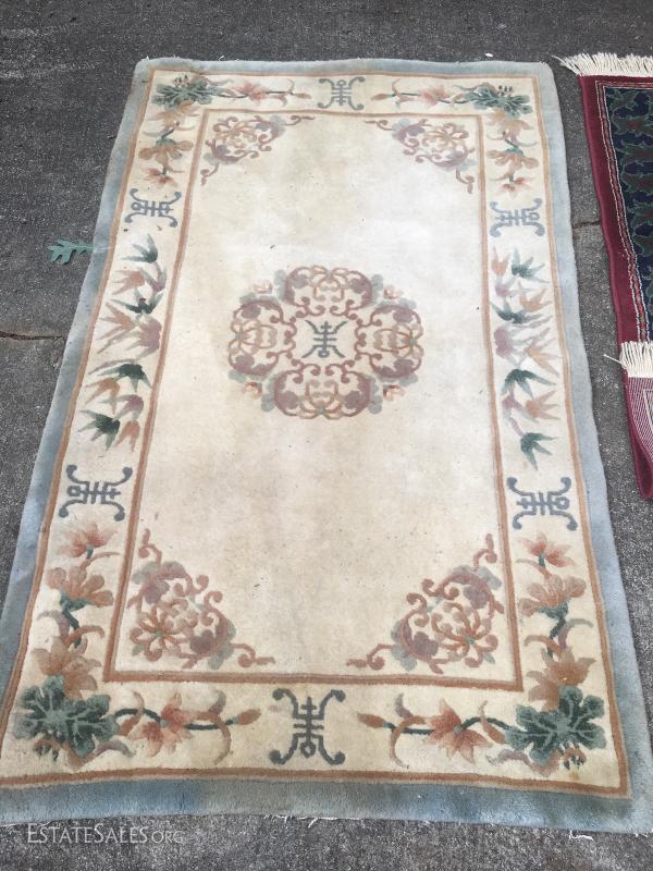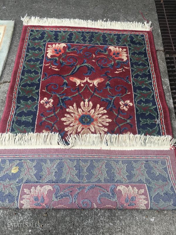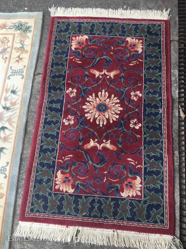 Two wool pile rugs. Red, green, blue and cream colored one is in nice condition. There are some pulls in the fringe. Measures 57" x31". The cream colored one has some sage, grey, mauve and brown and is a bit stained. It is thick pile and it appears that the fringe has been removed. Measures 59" x36". This lot is available for shipping or local pick up in Waynesville, NC.