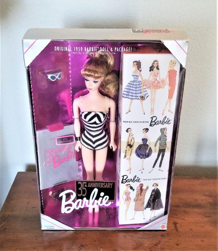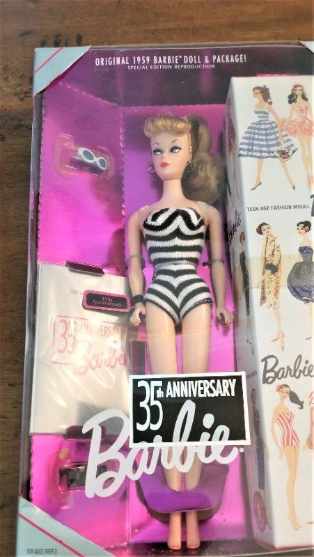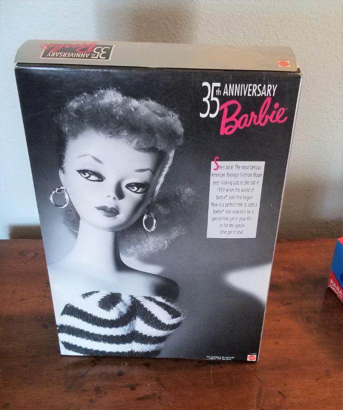 35th anniversary Barbie doll - never removed from box - the straps to hold her up swimsuit have deteriorated, otherwise good. Complete. These were made in 1993.
