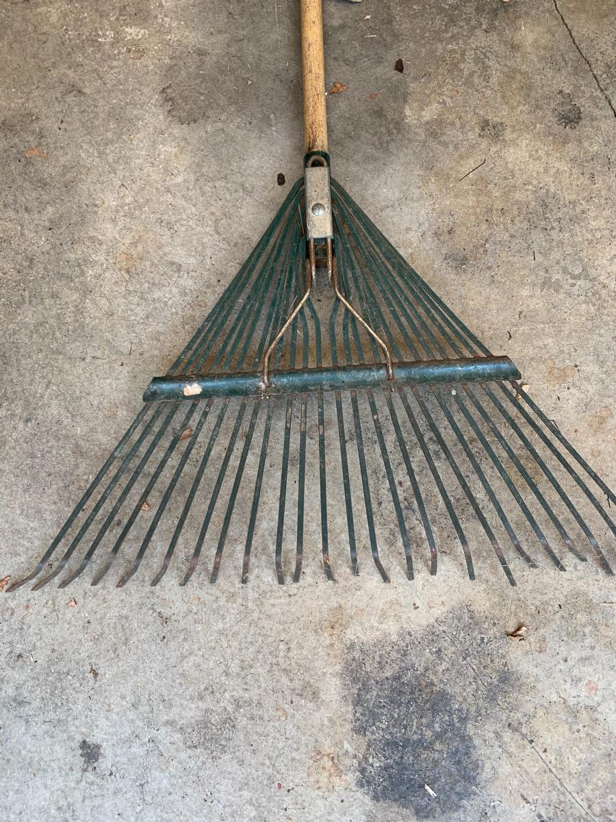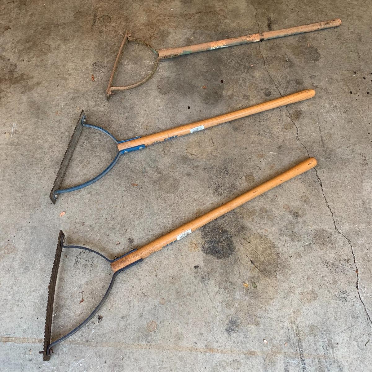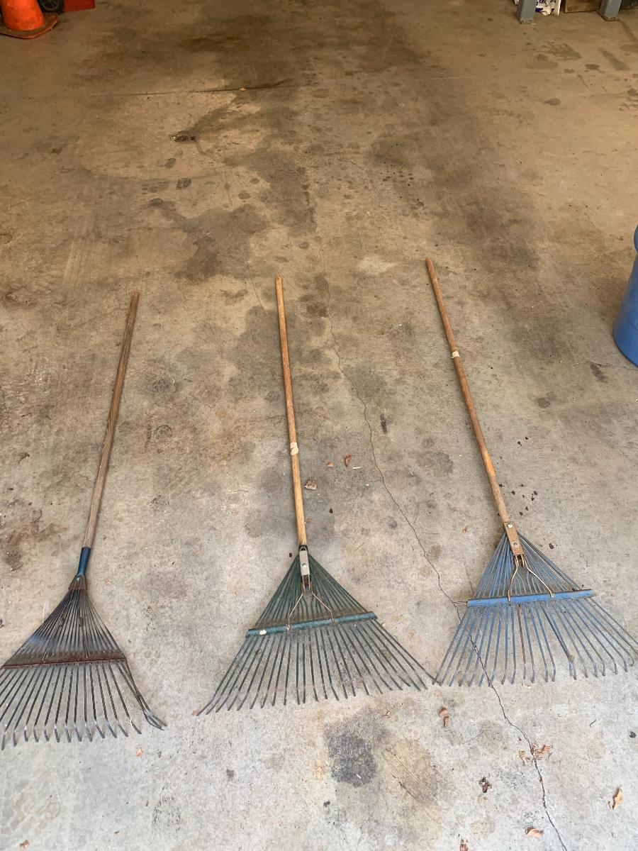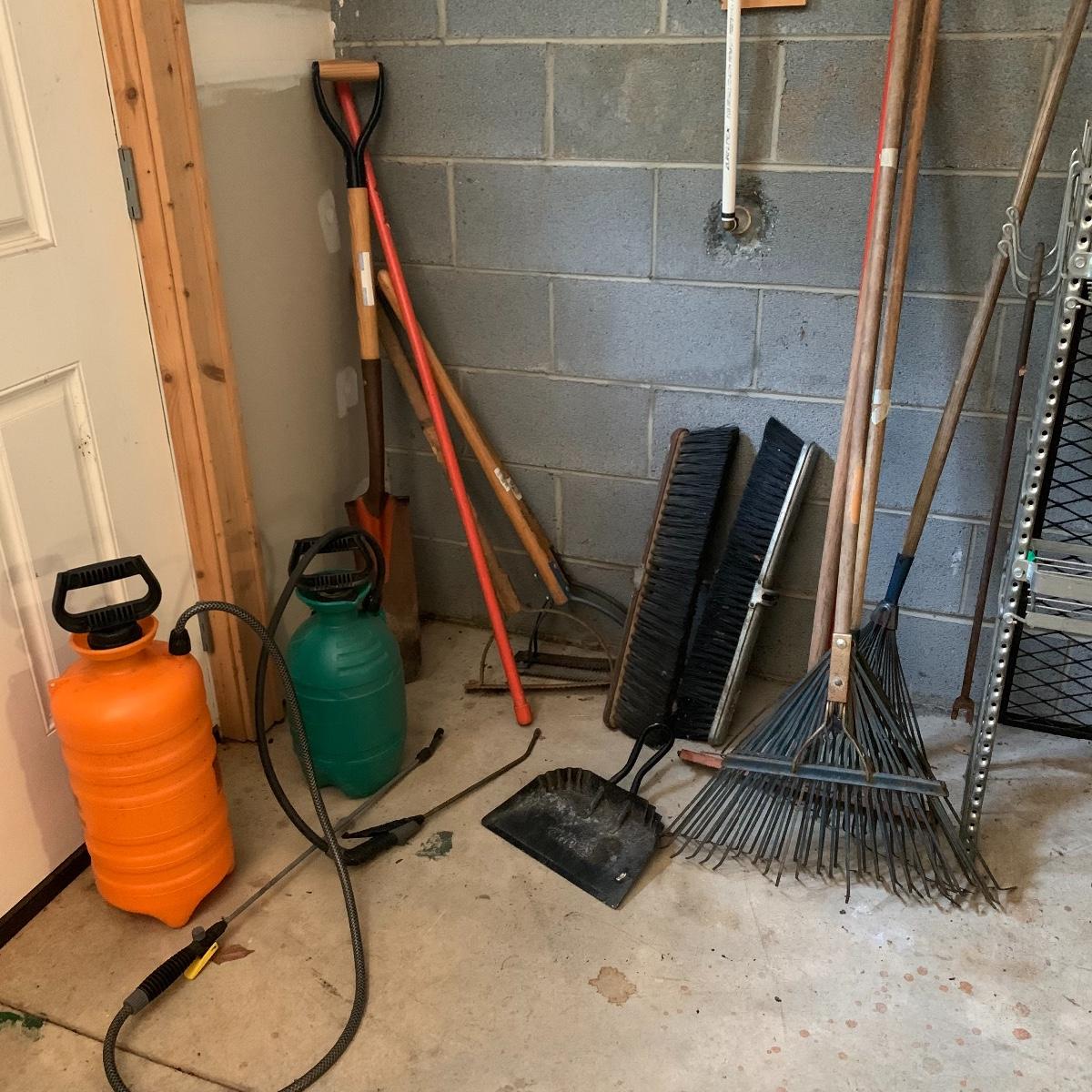Clean up your yard and garden with this lot! This lot includes three leaf rakes, one three gallon handheld sprayer, one two gallon handheld sprayer, three scythe, one spade, two broom heads, one squeegee, and more. The largest tool (rake) measures about 69in tall. Local pickup.