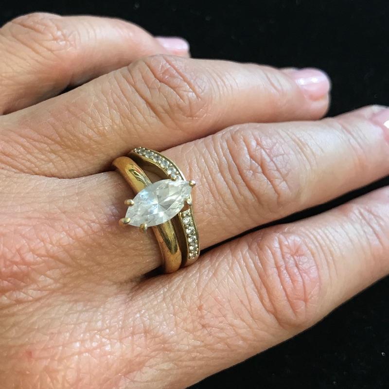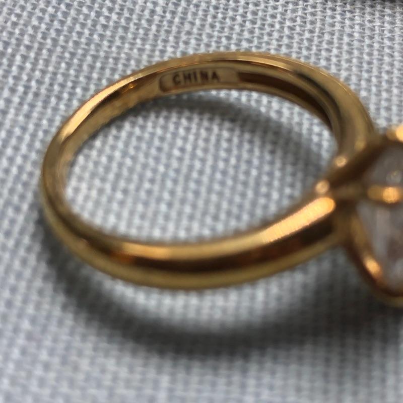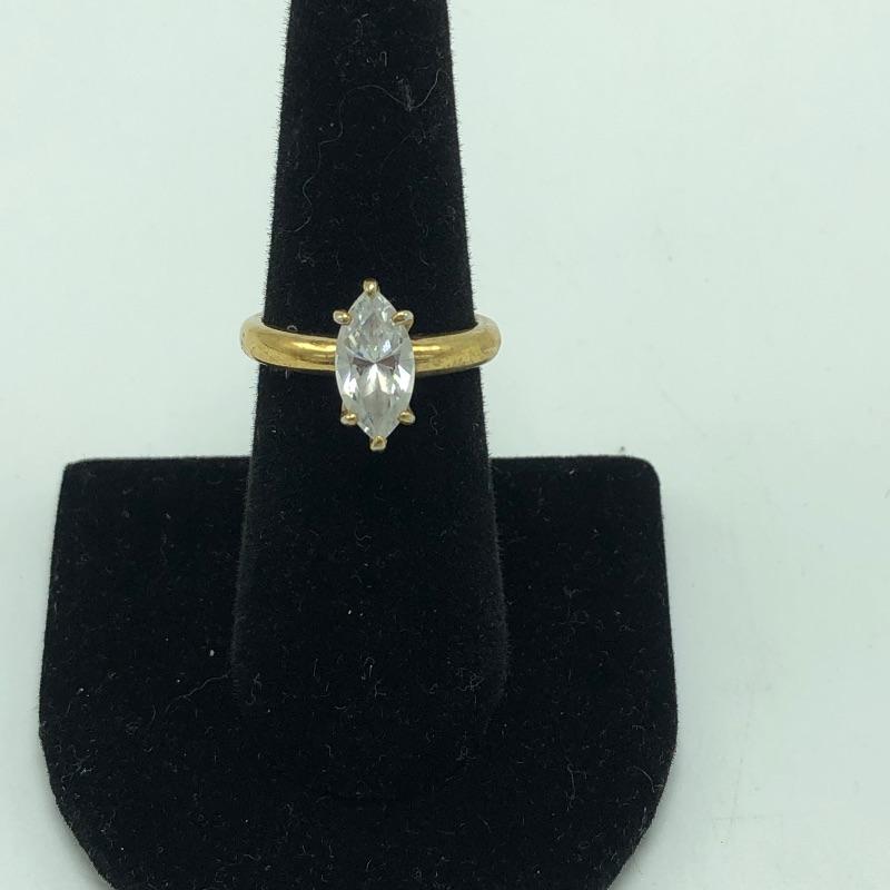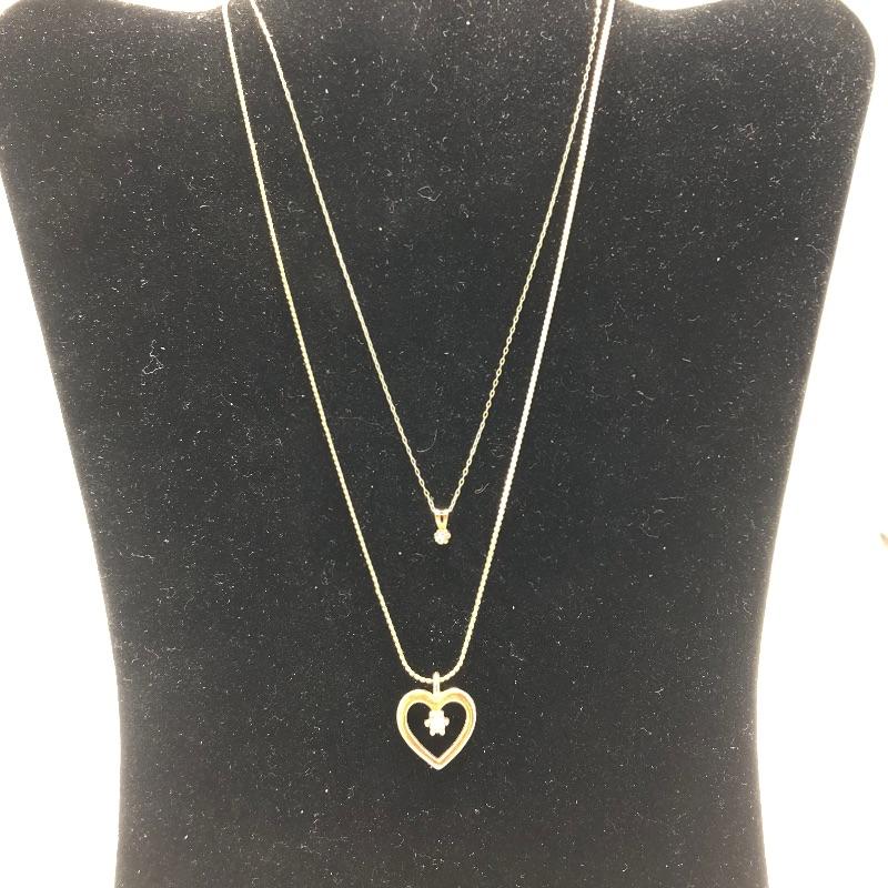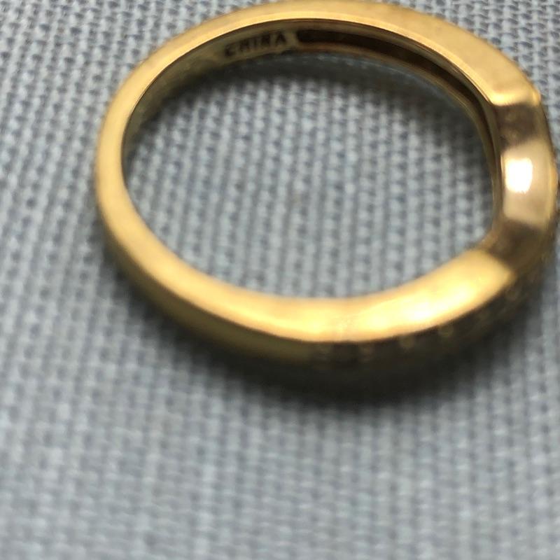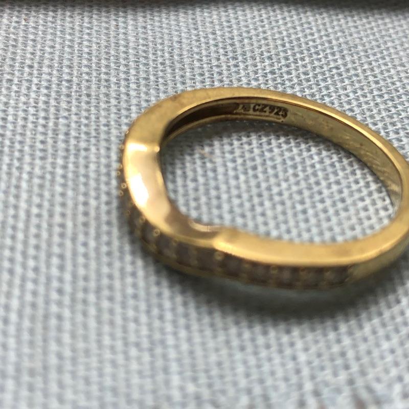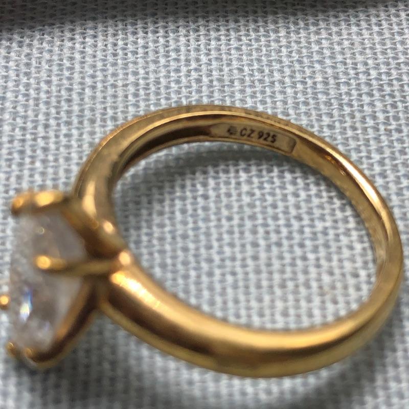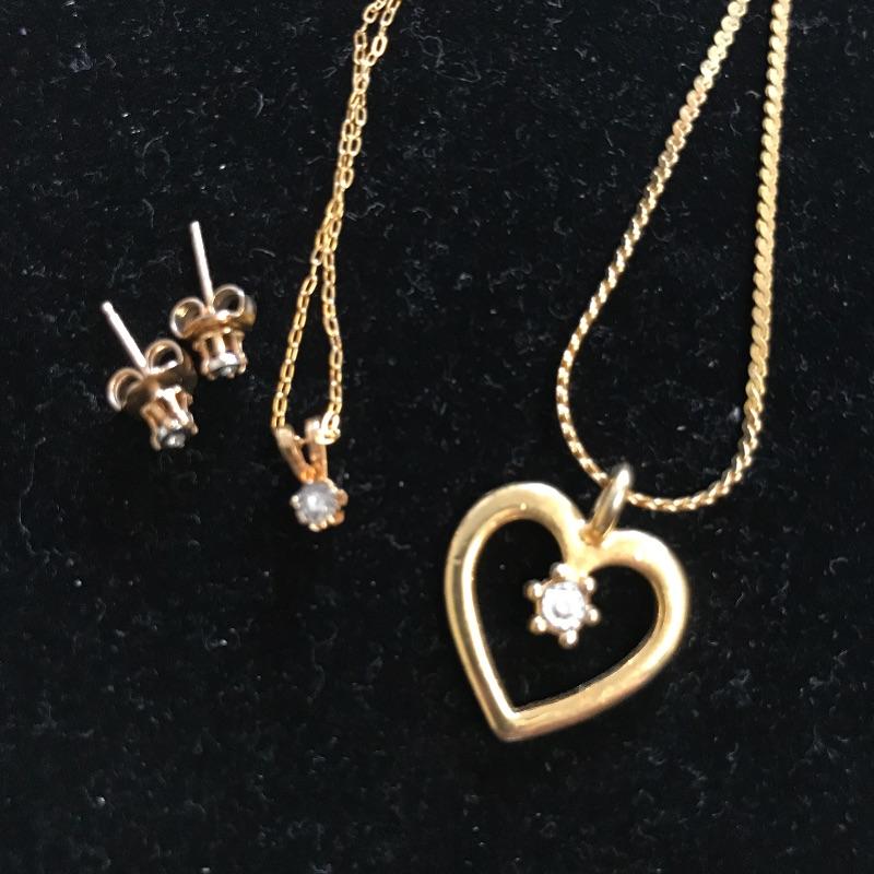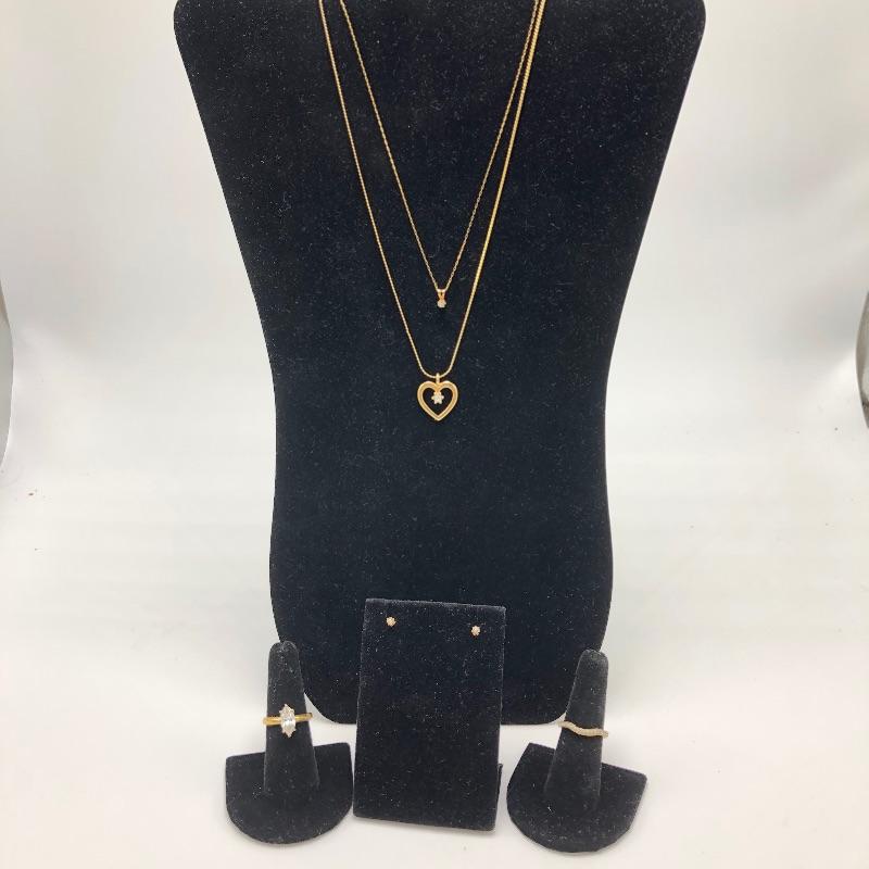 This lot includes a gold colored band with small diamonds and one with a large clear stone.. Both marked 925. There is also a set that includes a pair of stud gold colored earrings with clear stones and a gold chain with a matching stud pendant. You also get a second gold colored chain with heart pendant and small clear stone in the center. No real gold or diamonds that we can tell.
