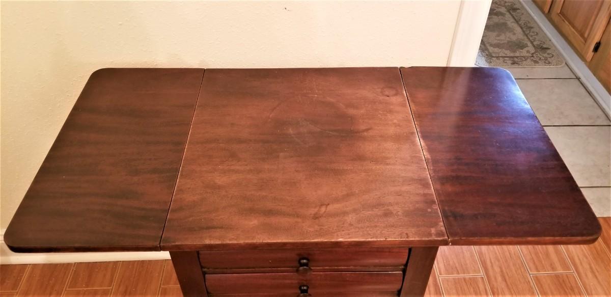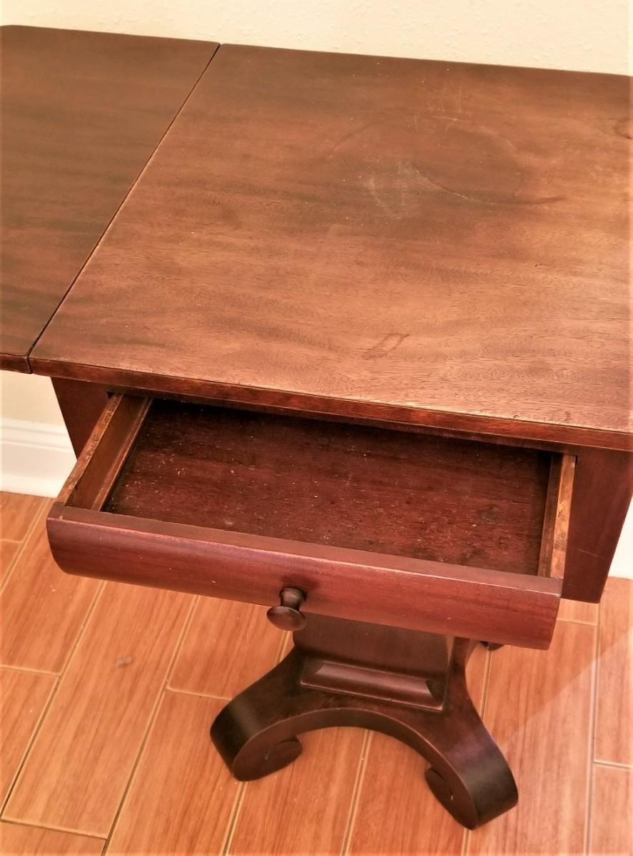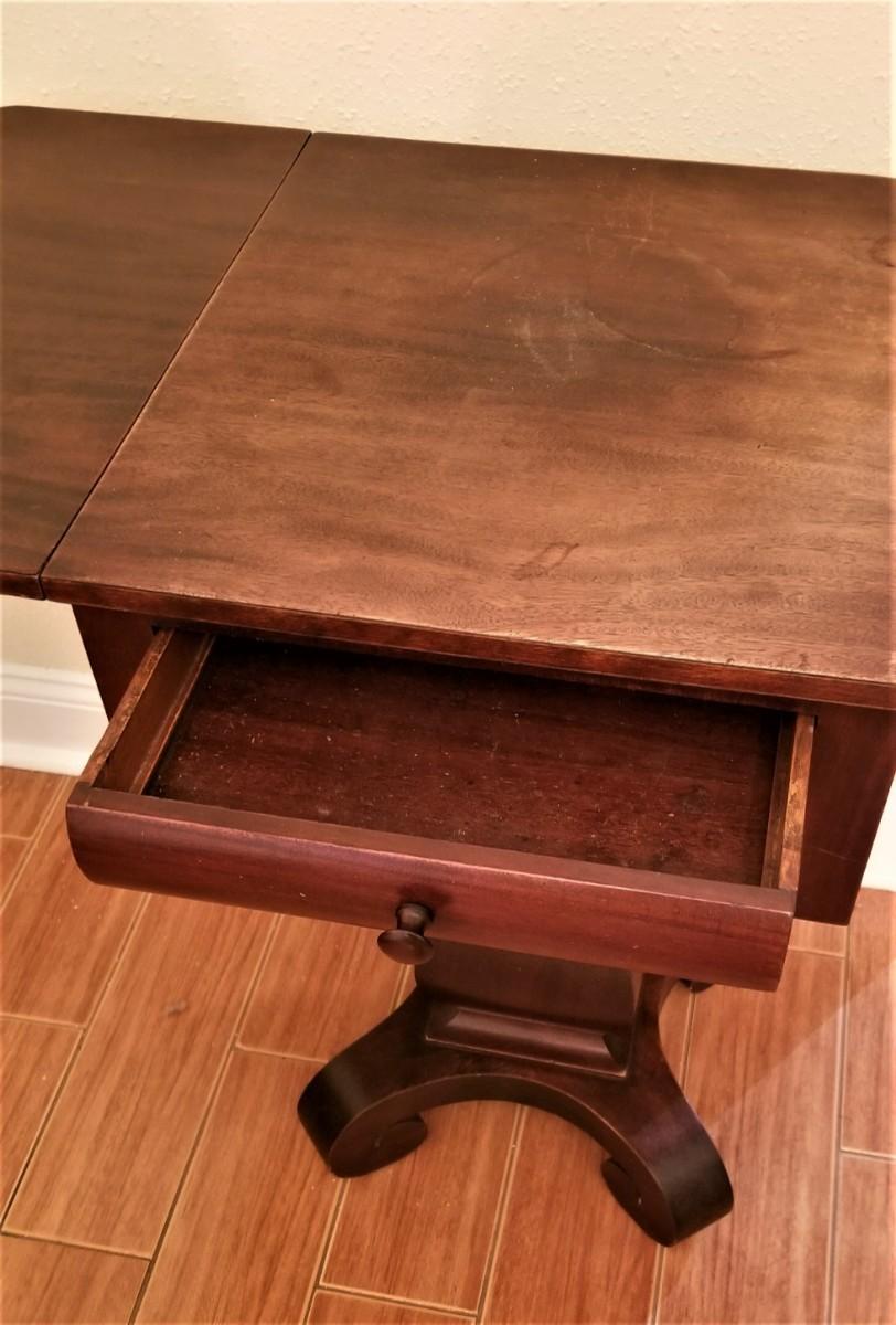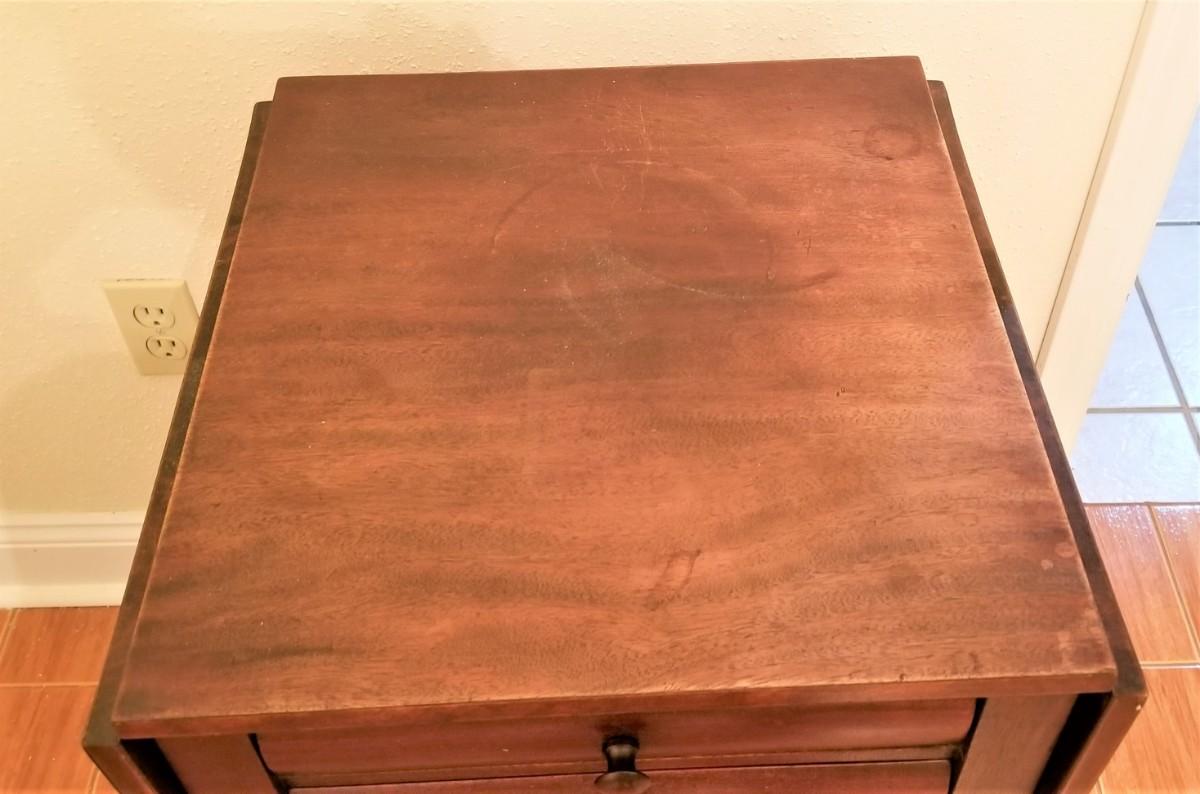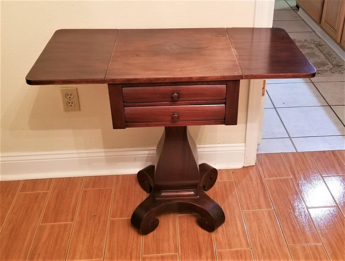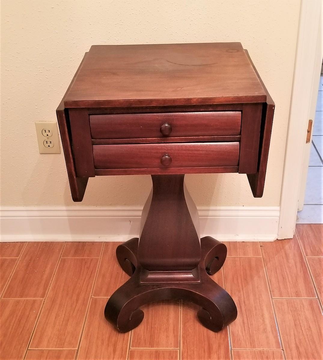 Cute little antique side table - this family was using it as a nightstand. Empire style. 2 drawers. Has original casters. 35" across, x 18" deep fully extended. 28.5" tall. Vintage condition.