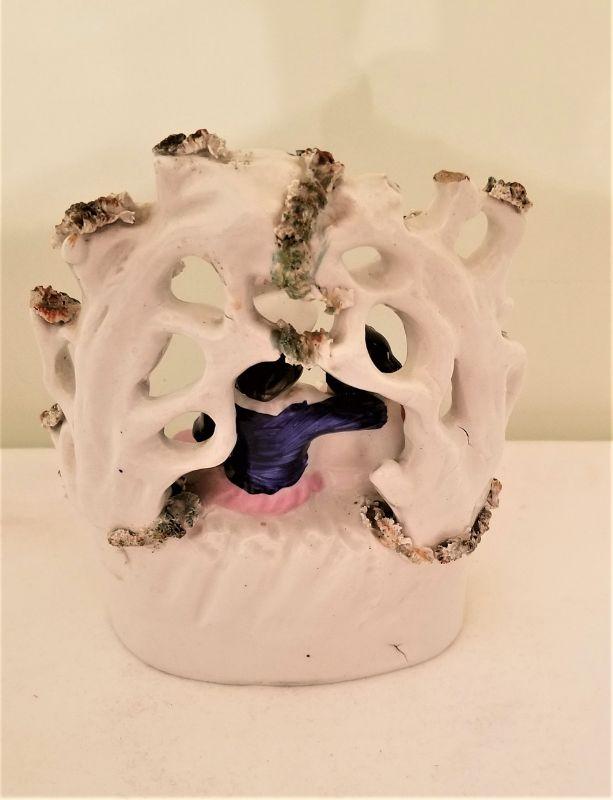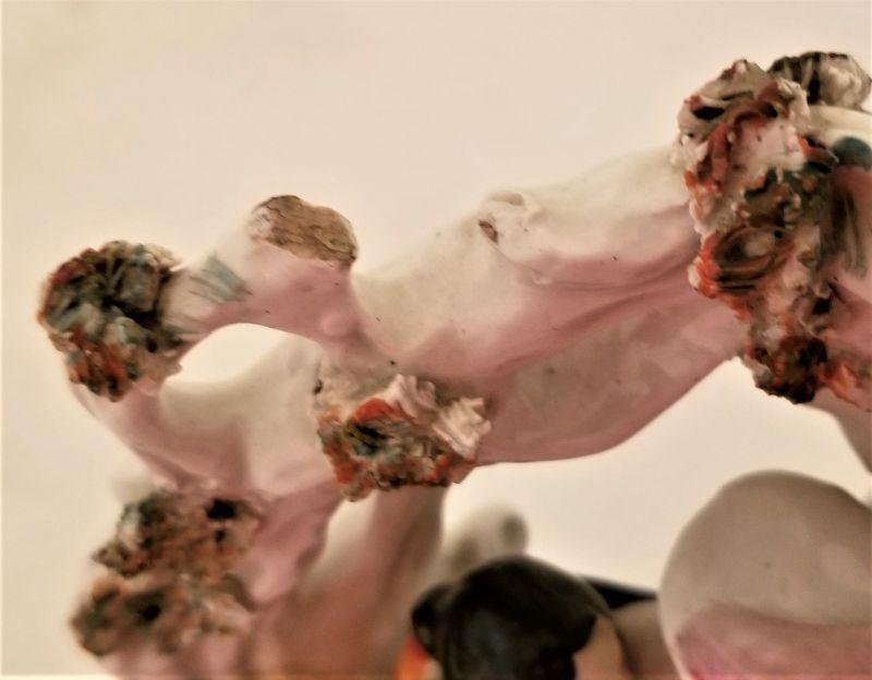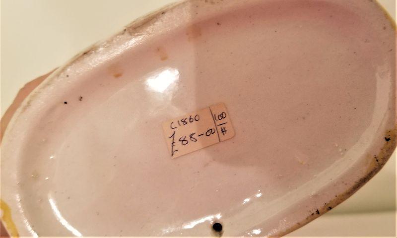 Another British 19th century Staffordshire porcelain scene - two lovers in a arbor. A couple of minor losses, as is common with this old soft paste porcelain figures. Note the original price tag on bottom where she paid 85 British pounds for the item. Based on when she bought it, this would have been about $150.00.