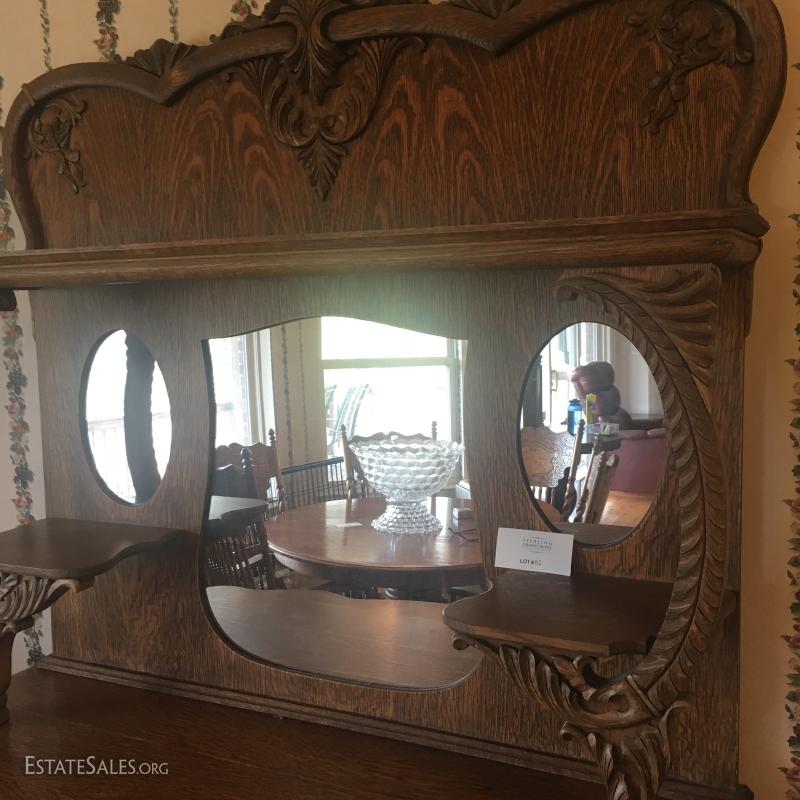 Oversized Top with Leaf Carving on Edges, Mantle Top with Two Split Shelves, Center has Backboard with Three Mirrors.