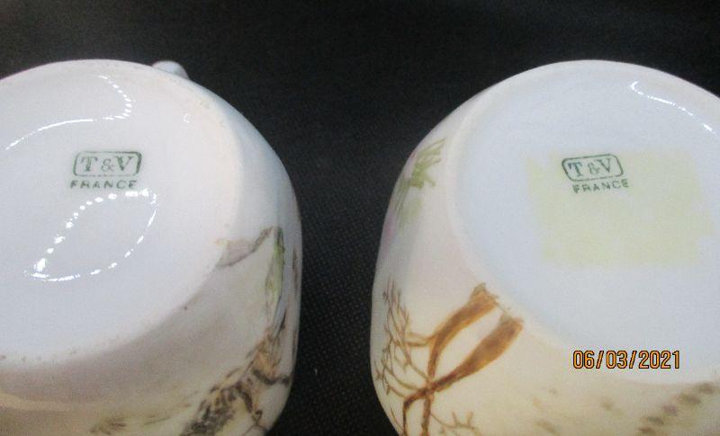 T & V stands for Tressemanes & Vogt who partnered with Limoges (although this mark doesn't identify Limoges) in the late 1800s to early 1900s. They produced during this time period until one passed away and the other a few years later sold the business. These pieces are in great condition with the only flaw being gold trim wear along the edges. They are about 3" tall.