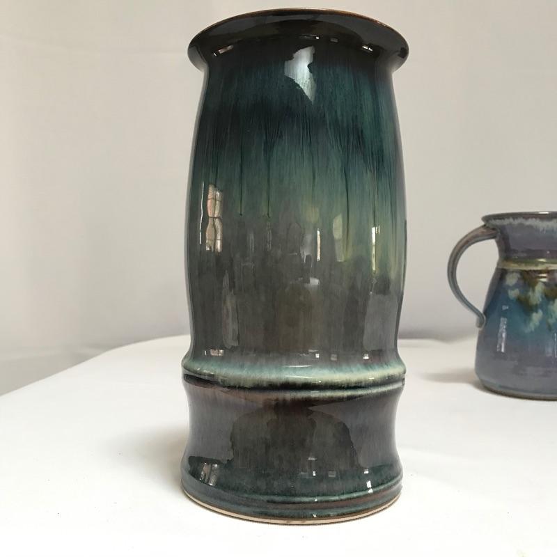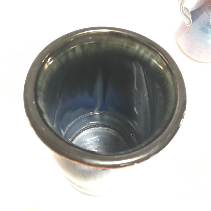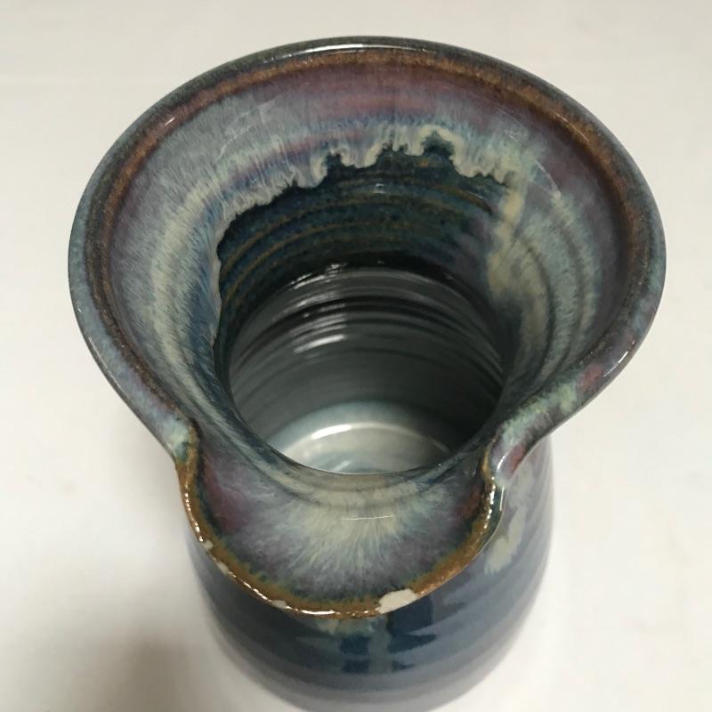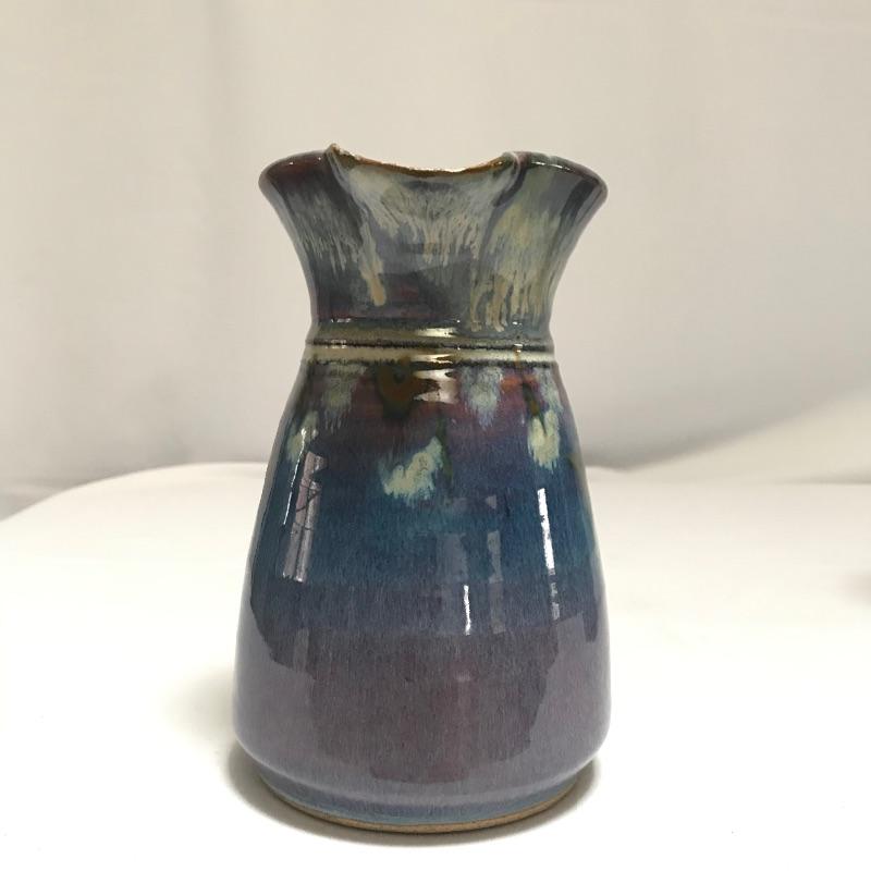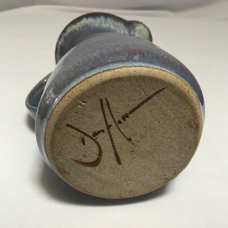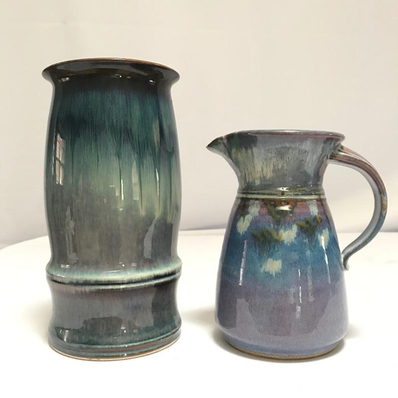 Two beautiful pieces of pottery each signed by their artist. A smaller 7” pitcher has hints of lavender on its blue base. It also has a tiny chip on the rim, see photos. Paired with the pitcher is a bold 9.25” vase with blue hombre leading into a violet hue. Both pieces show character with simple elegance throughout. Different artists but pieces look great together. See photos. Shipping available.