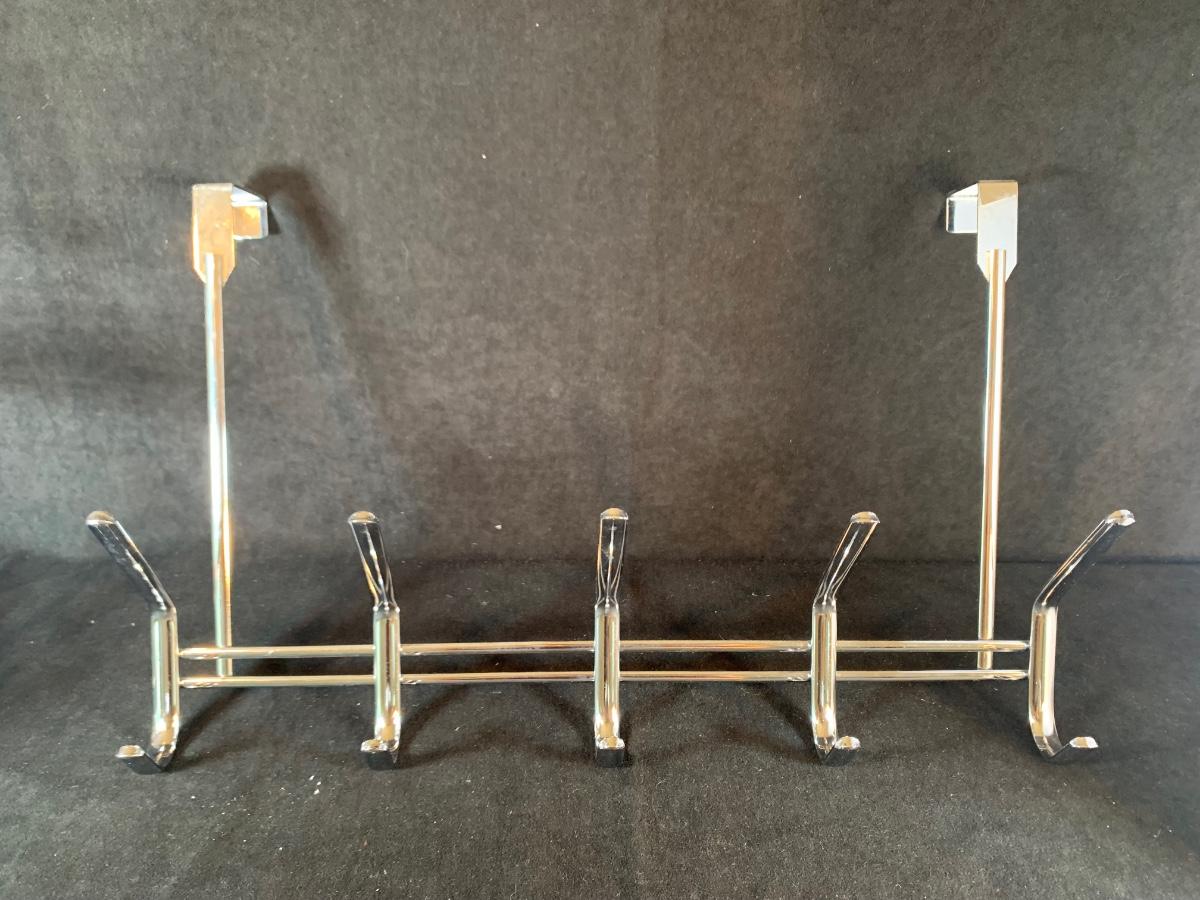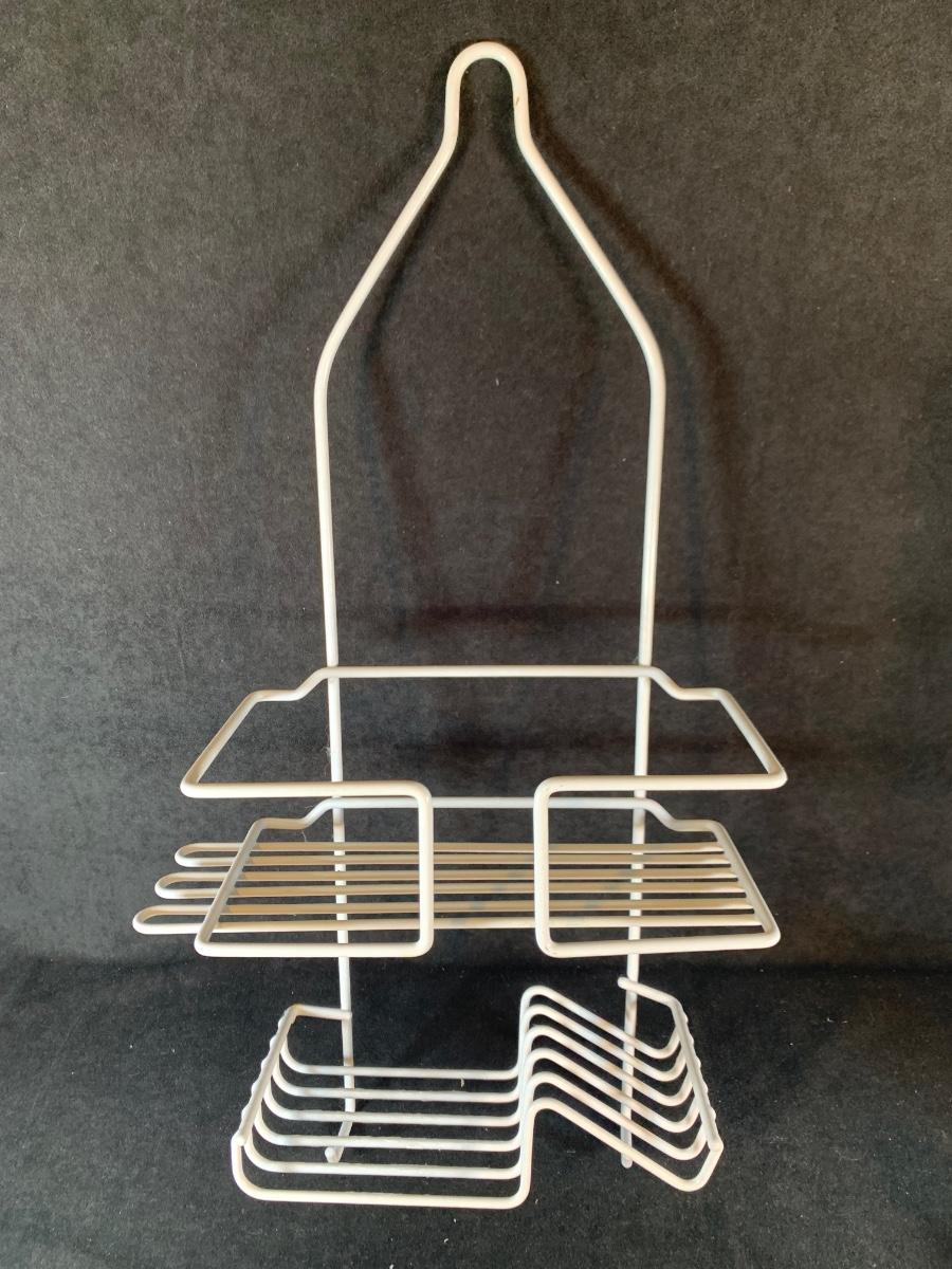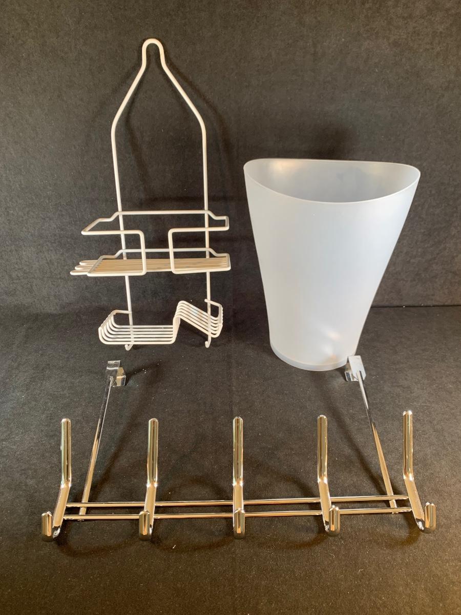 Includes Over-the-Door Hook Rack, Over the Shower Head shower Organizer and a white plastic Garbage can.