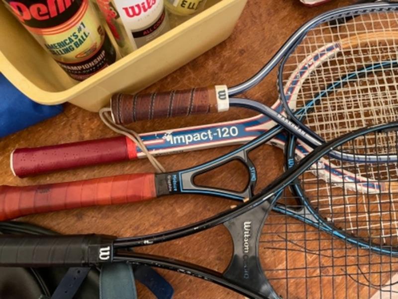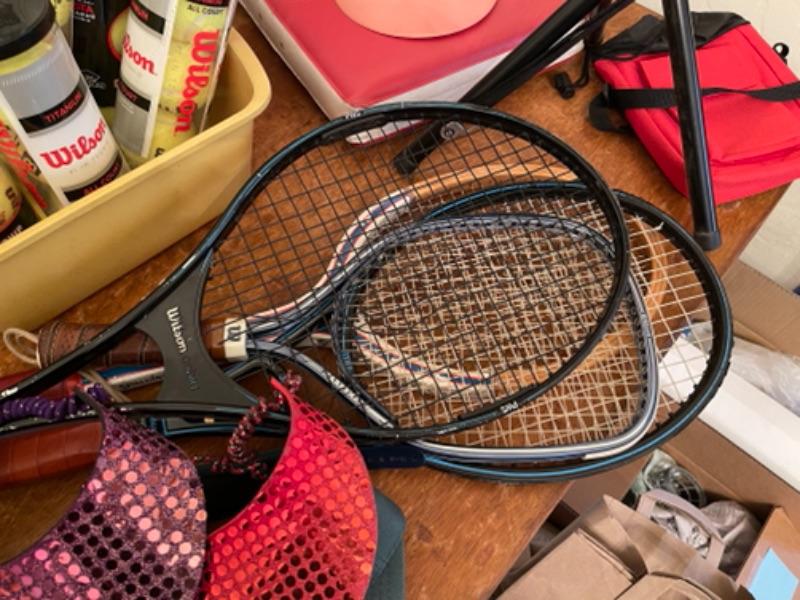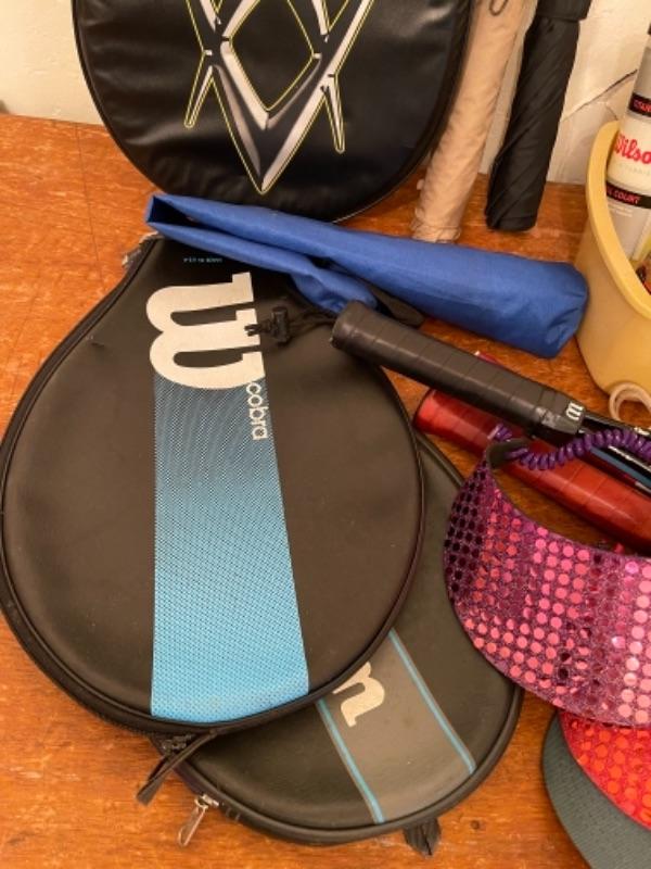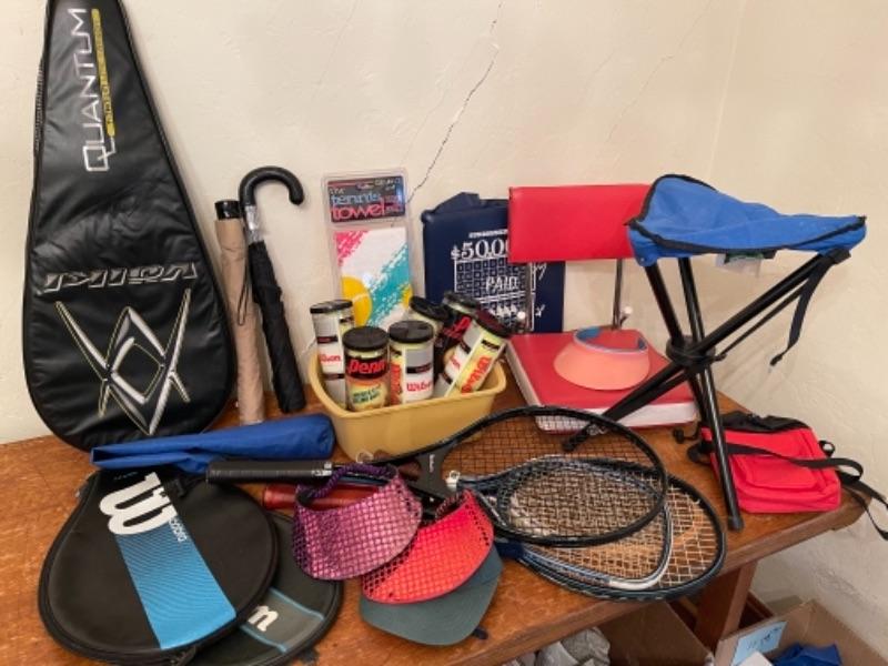 Lot 52. Assortment of tennis equipment and accessories (6 rackets, stadium seat), etc.--$25