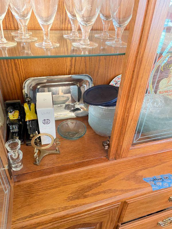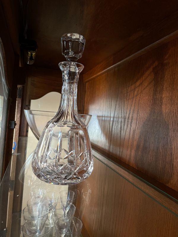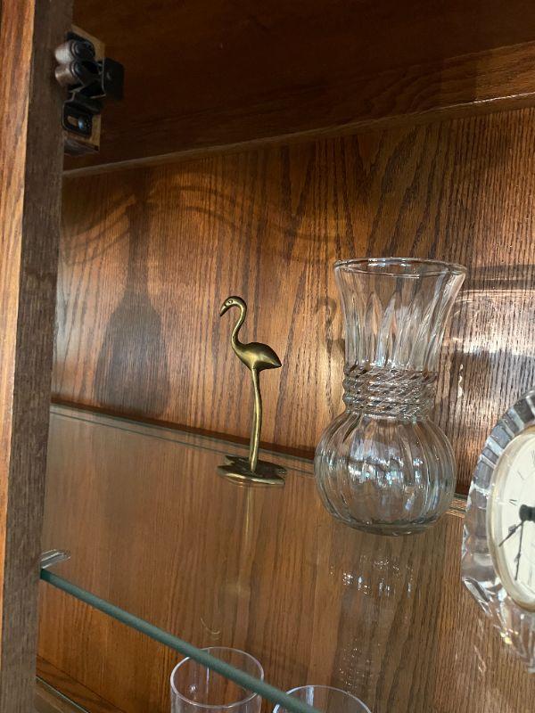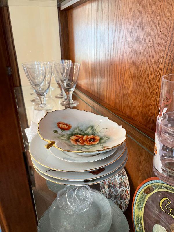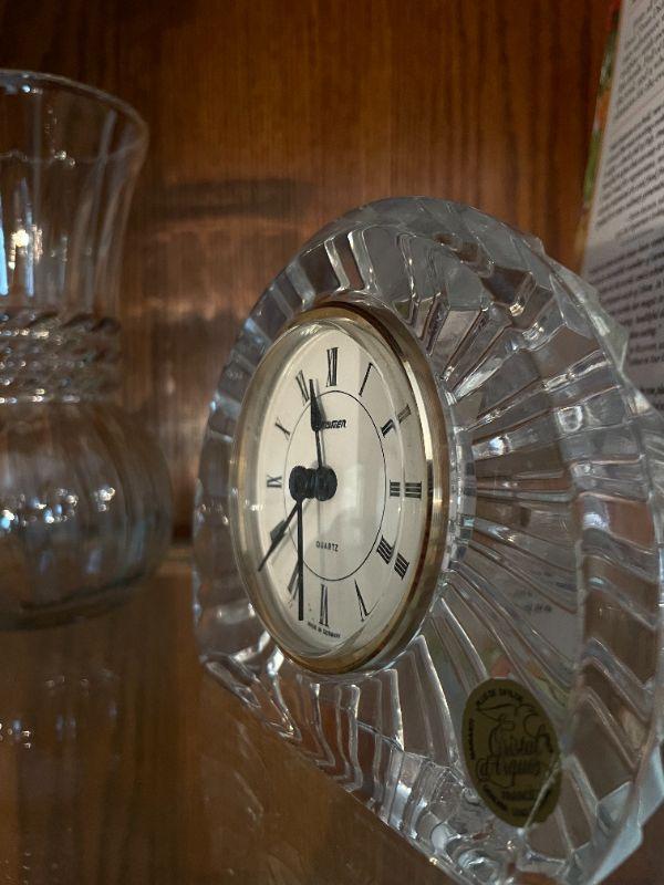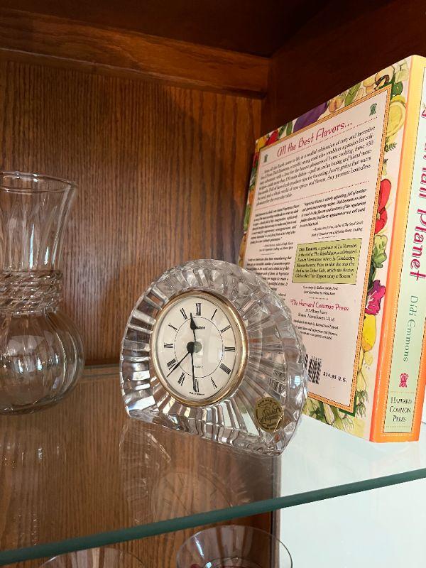 Cast iron planter, glass plate set, misc. brass pieces, crystal decanter, crystal clock, hand painted plates, misc. glasses, book, (2) large glass bowls.