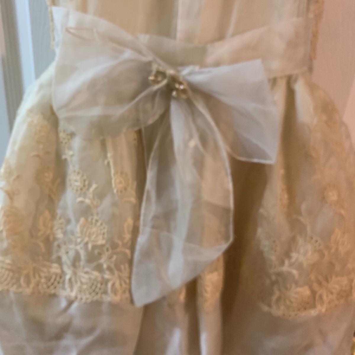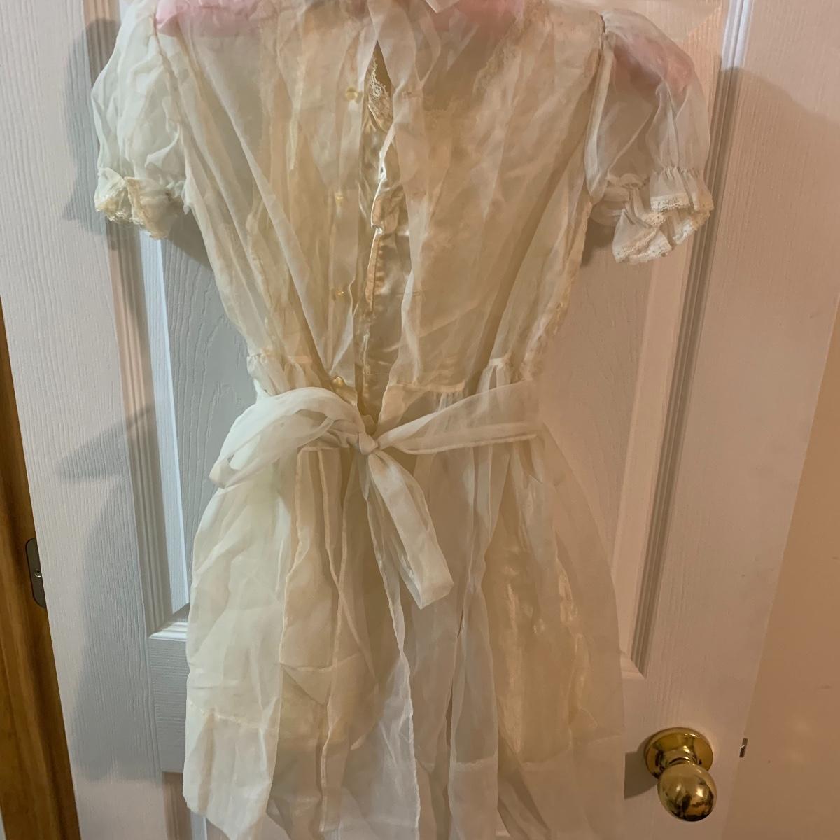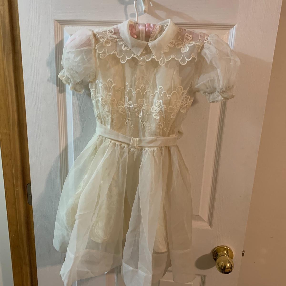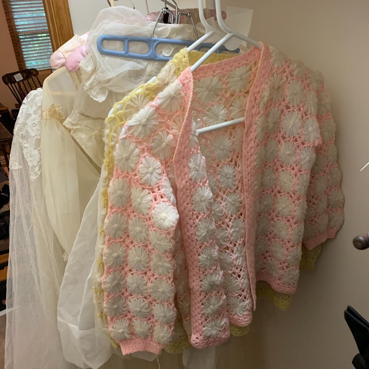 Lot contains two hand knitted sweaters that are matching but one is yellow and the other pink they measure 16” across chest and 23” long. Two small organza dresses with sweet under slips included, they measure 13” across chest and 28” long. One has a label but none found on the other. There is a dressing gown and a crinoline bottom also in the lot. My guess all this was from a very special wedding back in the day. Shipping available.