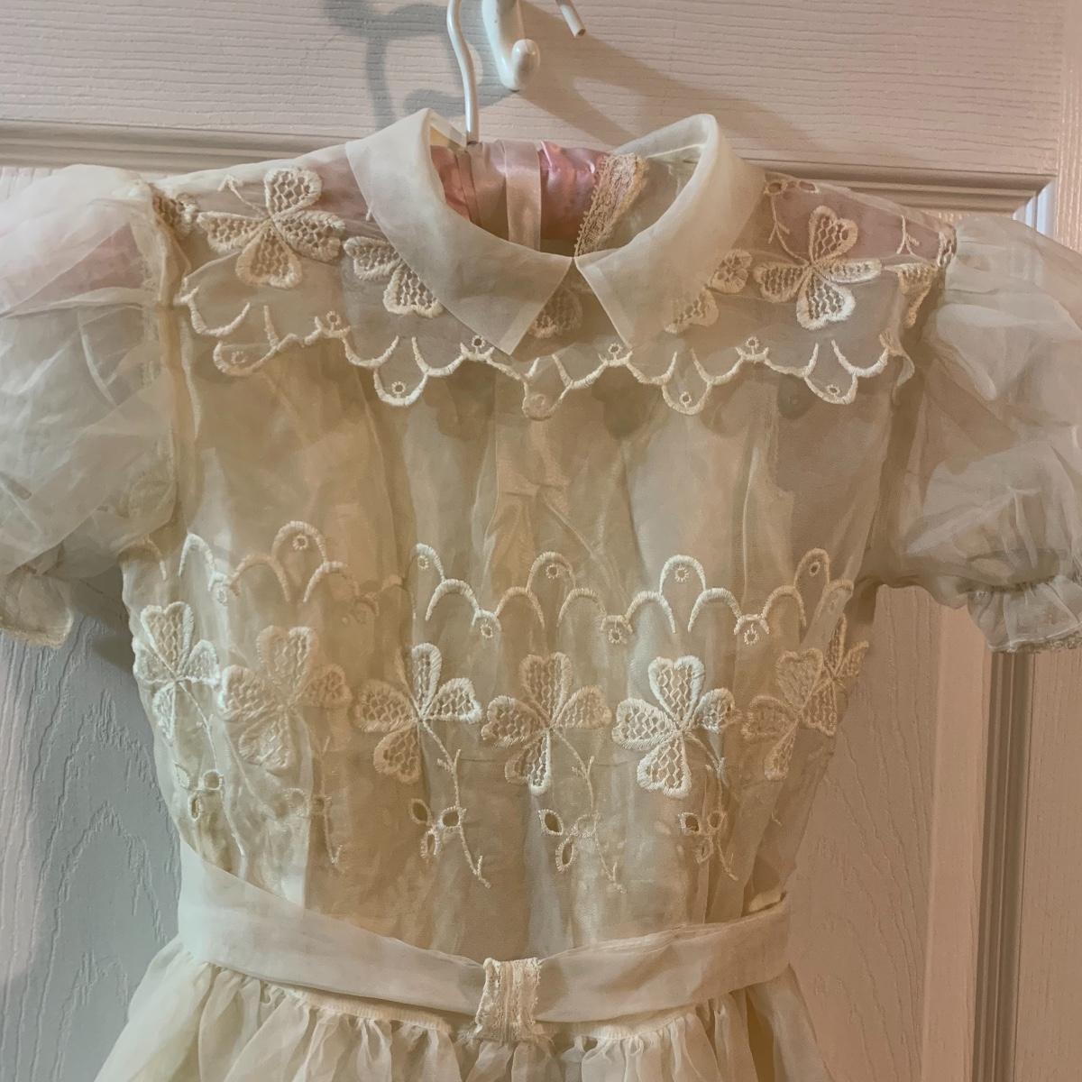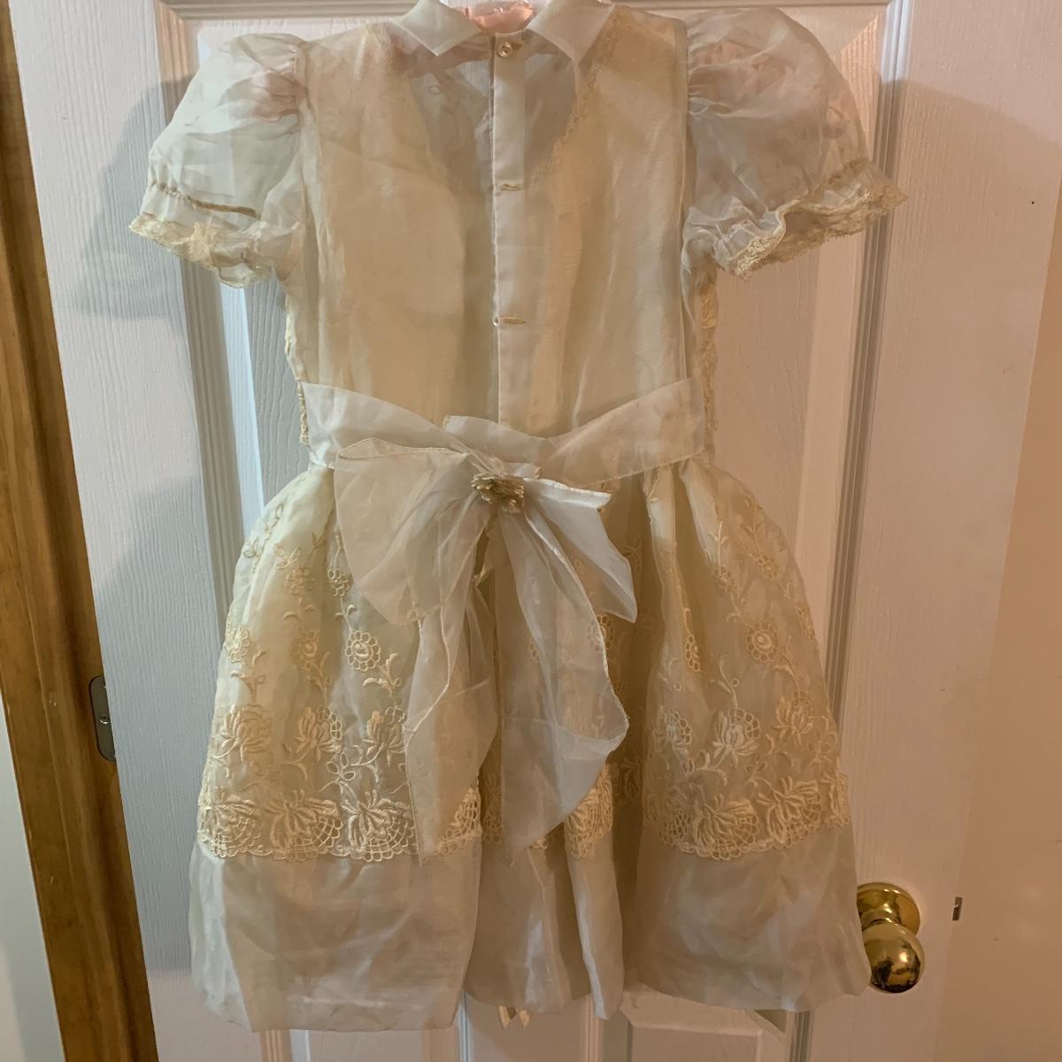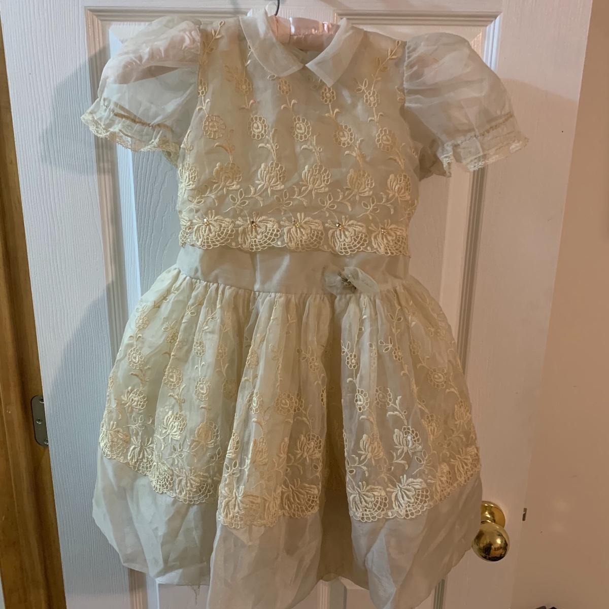 Lot contains two hand knitted sweaters that are matching but one is yellow and the other pink they measure 16” across chest and 23” long. Two small organza dresses with sweet under slips included, they measure 13” across chest and 28” long. One has a label but none found on the other. There is a dressing gown and a crinoline bottom also in the lot. My guess all this was from a very special wedding back in the day. Shipping available.