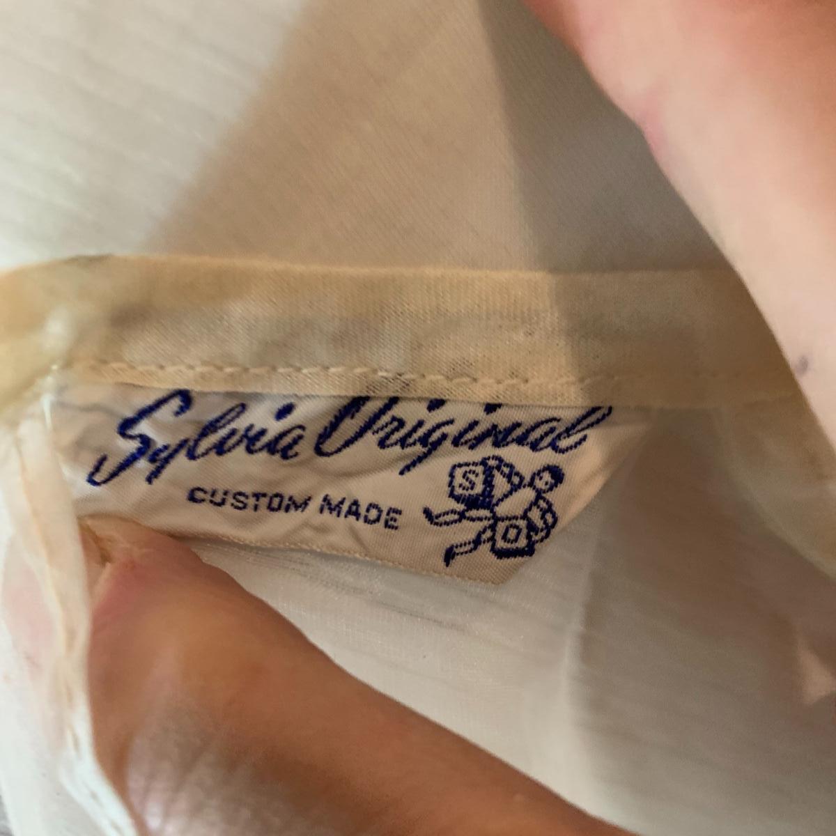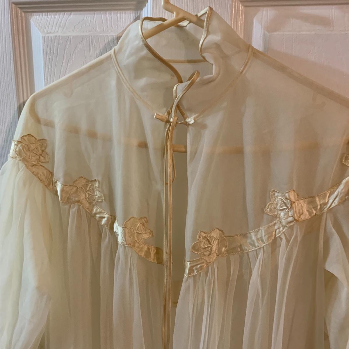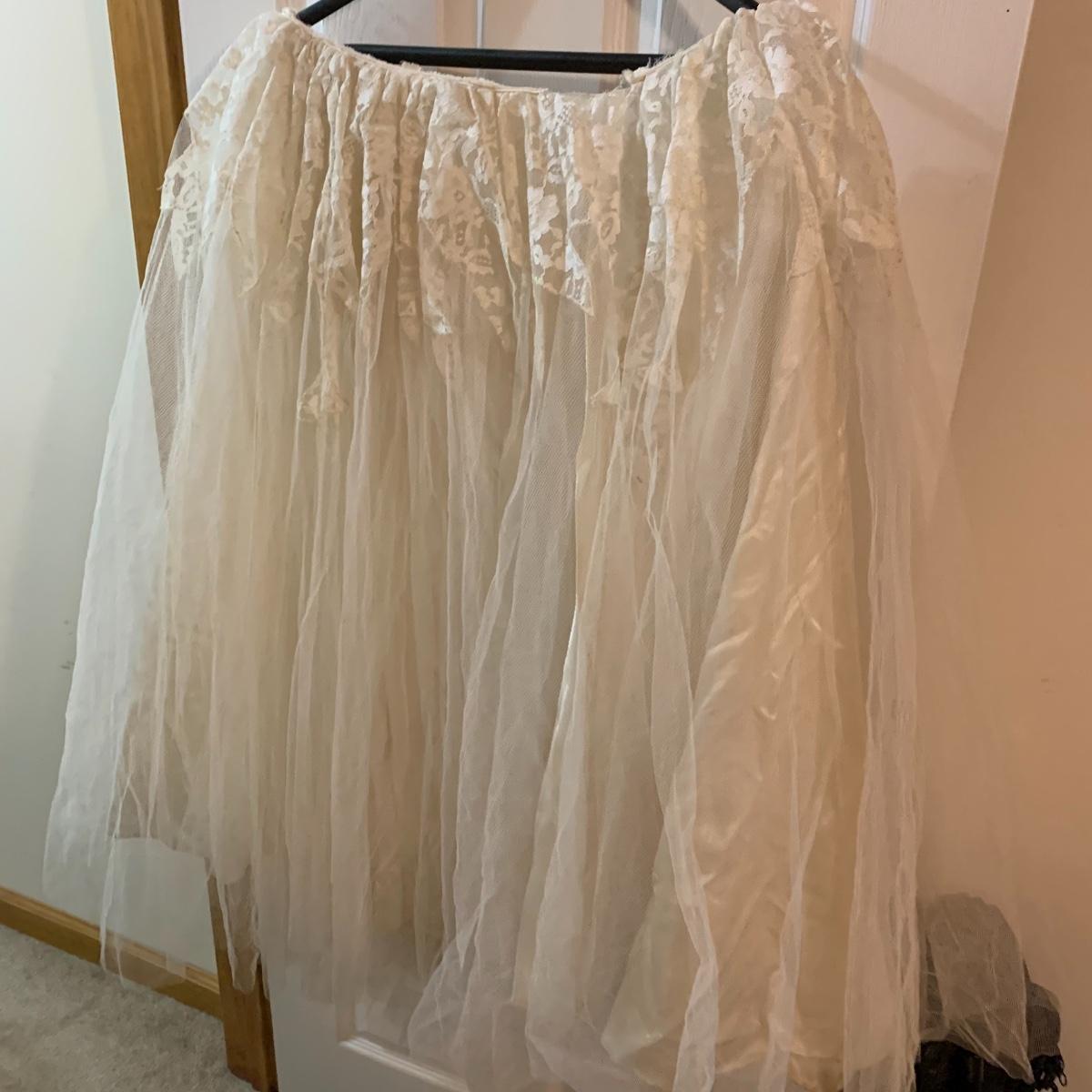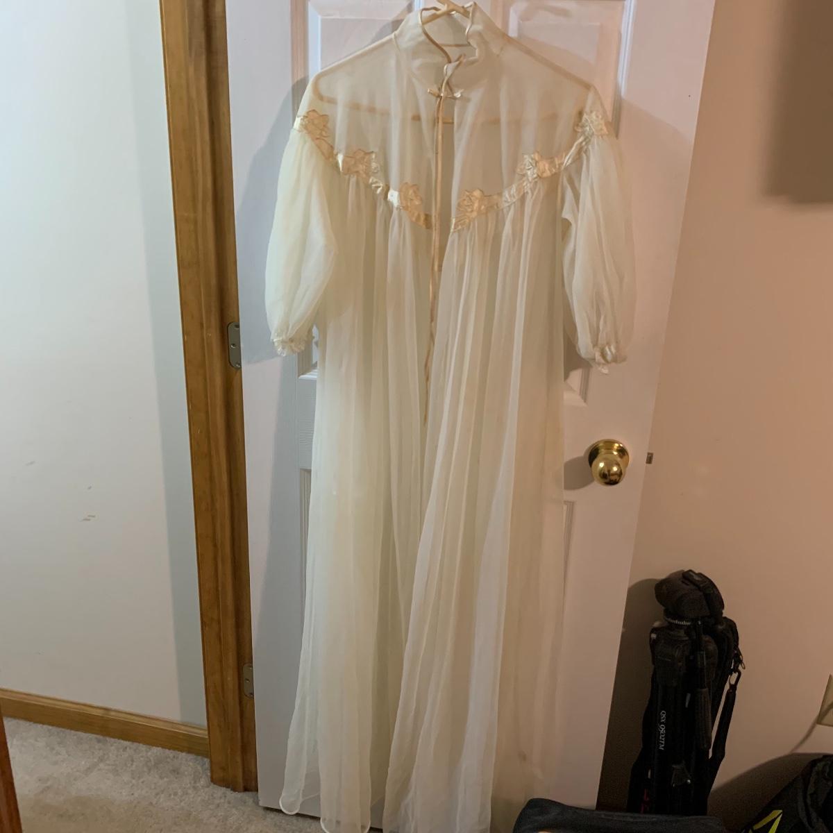 Lot contains two hand knitted sweaters that are matching but one is yellow and the other pink they measure 16” across chest and 23” long. Two small organza dresses with sweet under slips included, they measure 13” across chest and 28” long. One has a label but none found on the other. There is a dressing gown and a crinoline bottom also in the lot. My guess all this was from a very special wedding back in the day. Shipping available.