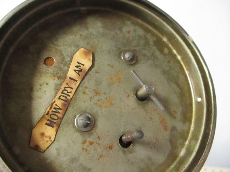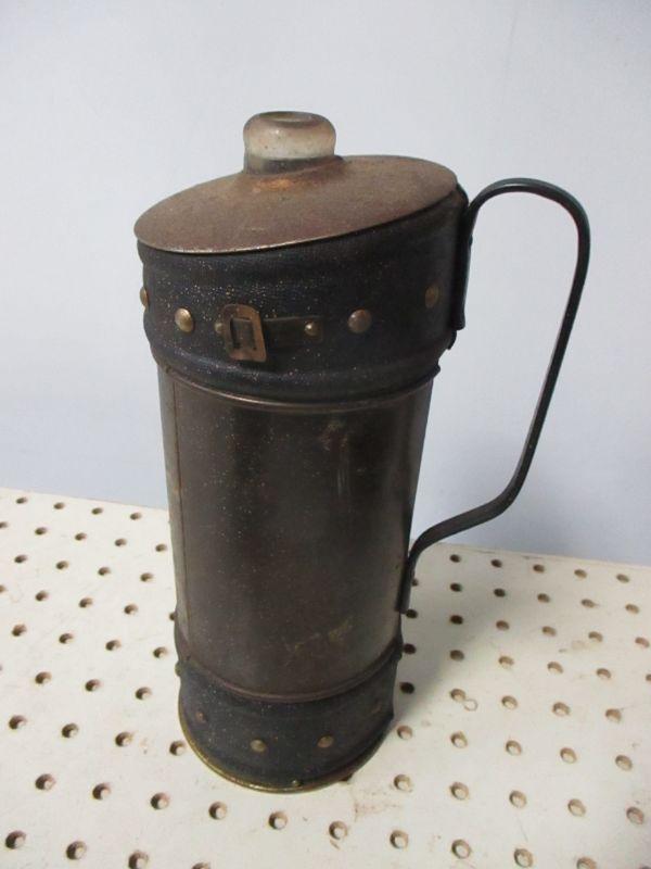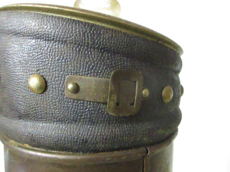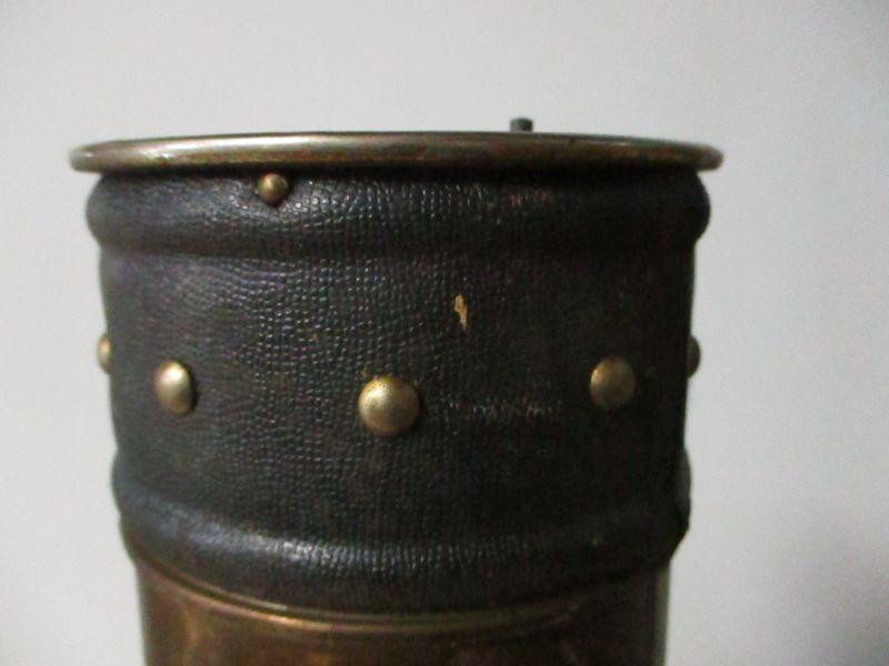 This decanter is vintage in age and is from the 1950's/1960's. It is heavy and extremely well made. It is approximately 12 inches tall and weighs over 2 1/2 pounds. It is brass with leather trim, a metal handle and decorative brads. I am unsure if the leather is genuine. The decanter is glass. This decanter is in very good condition and includes the stopper with the cork intact. The brass does show vintage aged patina, giving it character. There is one small dent below the handle (refer to photo). The decanter has a built in music box (How Dry I Am), however it plays sporadically and sounds like something is loose with the mechanism