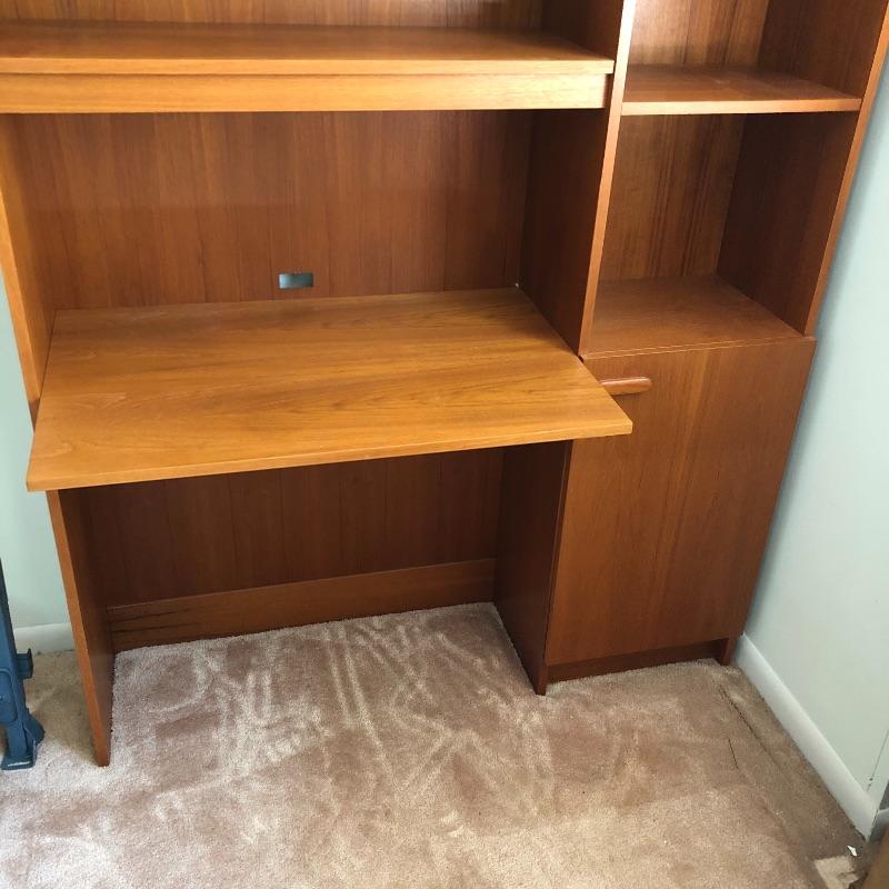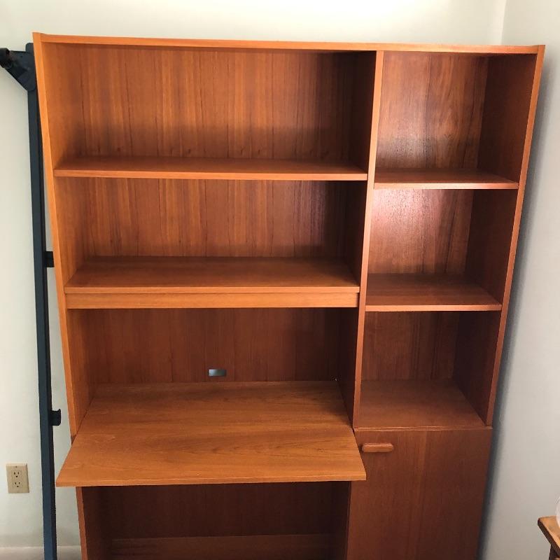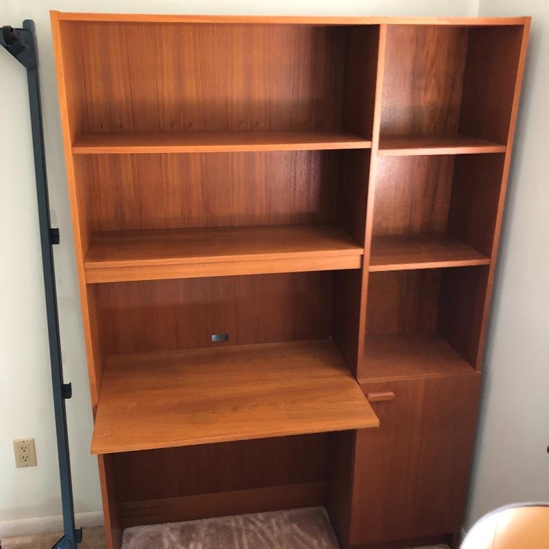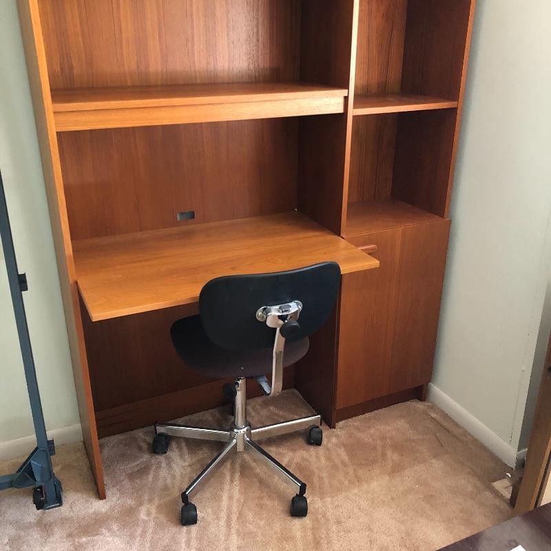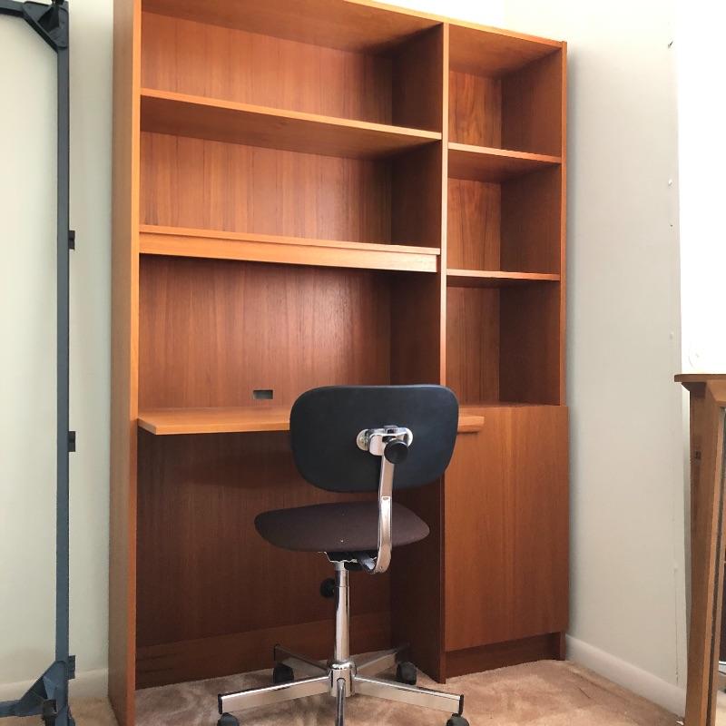 A great place for your child to study without taking up too much room. Desk has five open shelves and three in cabinet along with a writing/ computer surface. Some shelves are adjustable. Also includes swivel office chair. Desk measures 12.5” x 47.5” x 79.5” and is pressed wood.
