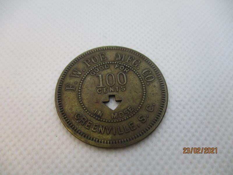 This token is good for 100 cents at their general merchandise store - if it was still in business! This link will give some sanitized history of the mill (you may have to copy the link and then paste it in your browser) http://greenville-textile-heritage-society.org/mills/poe/