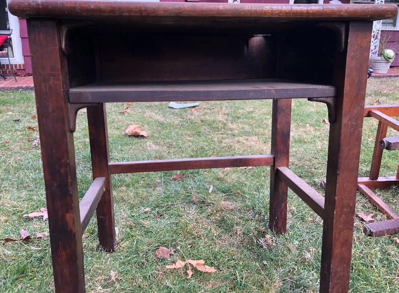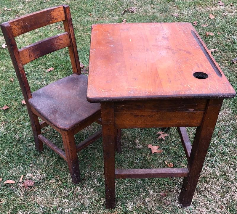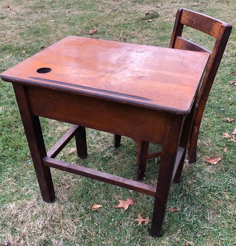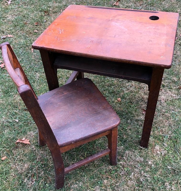 Antique Wooden School Desk & Chair. Desk 24” L x 18” W x 25” H. Chair 14-1/2” L x 13-1/2” W x 28” H. Please see all pictures for condition. Thank you for looking and have fun bidding