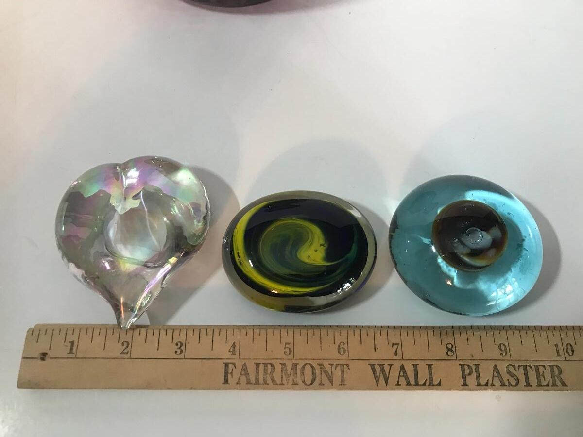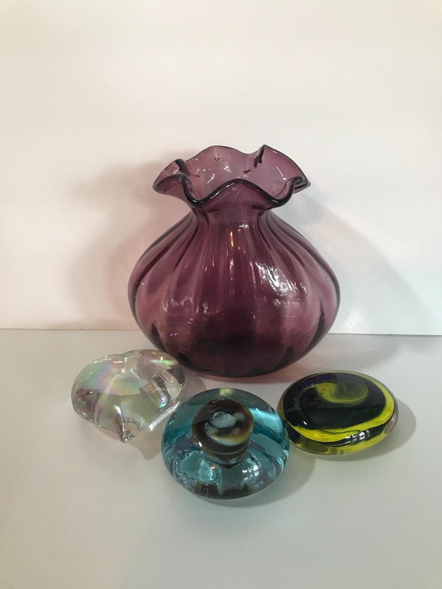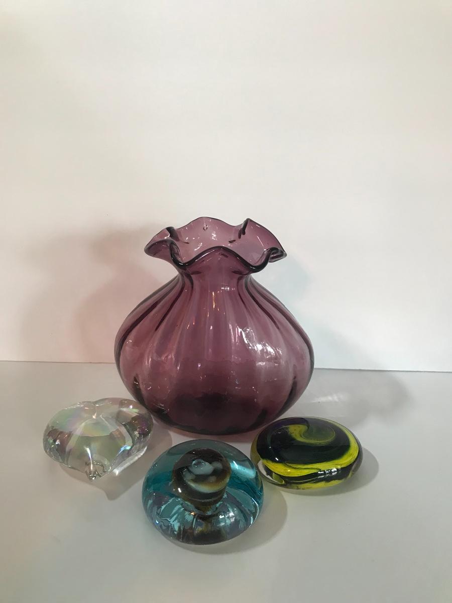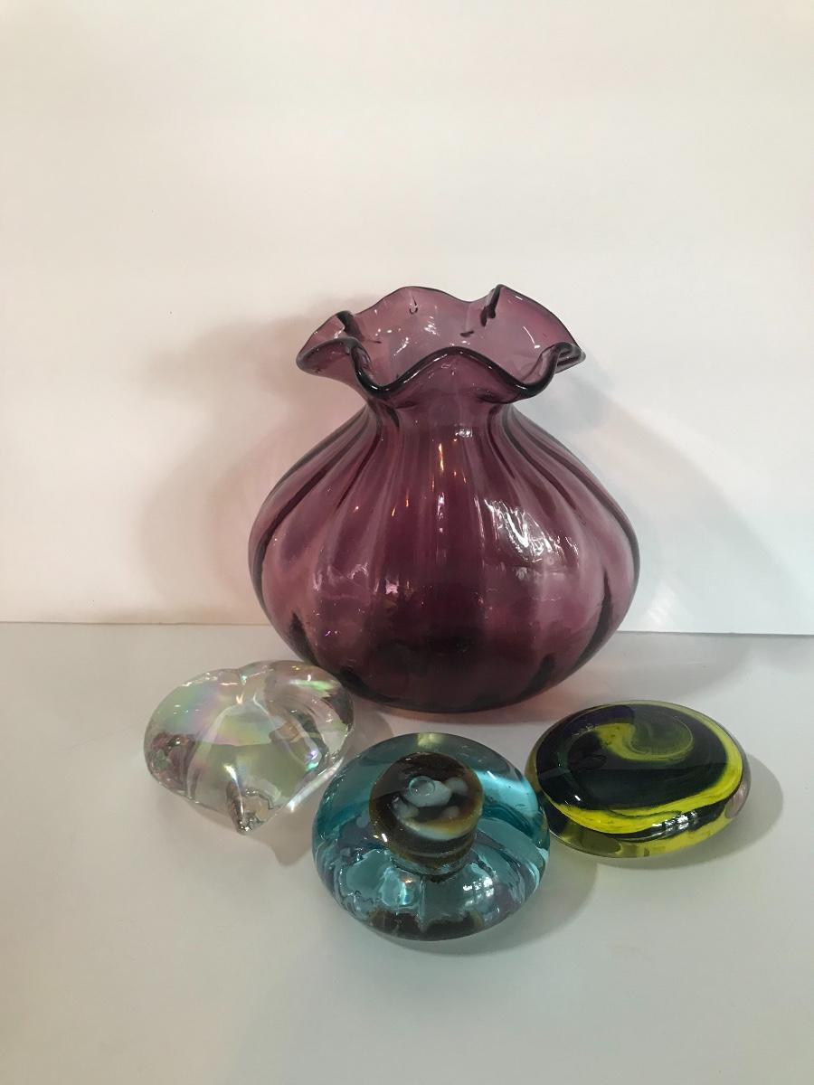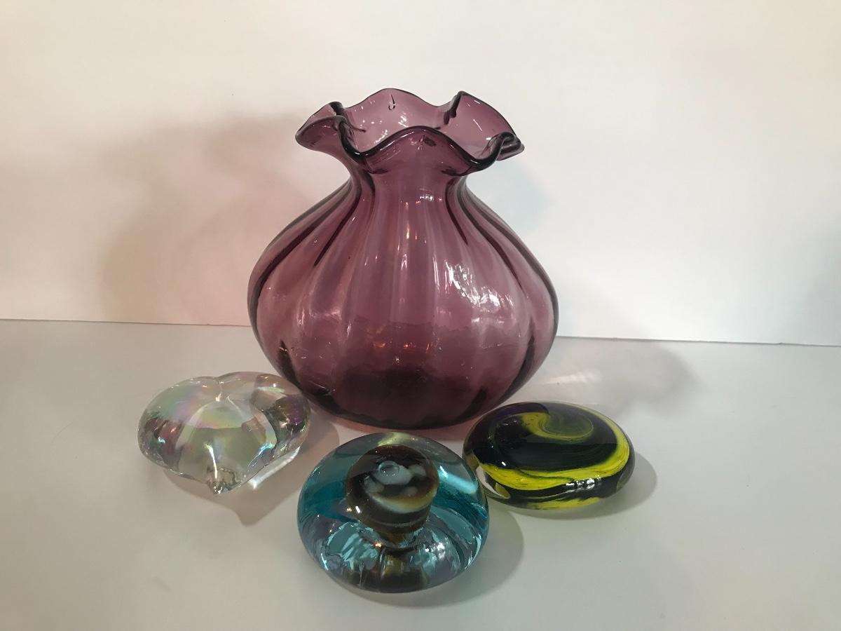 Hand blown, purple vase, and three glass paper weights, one is handblown. The pictures show condition, measurements if taken, and what is included in the lot. Due to the large amount that we photograph and the time frame, we are not always able to take measurements. All items unless noted, are pre-owned and have been used. If you purchased furniture, you must bring help. We do not allow one person to carry large furniture out on their own. Bring help, tools and a truck for the safety of our client’s homes, and your personal safety. Company policy. Thank you.