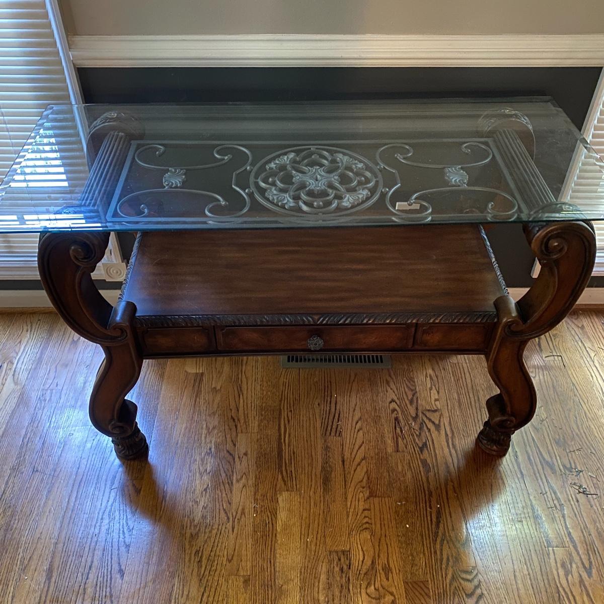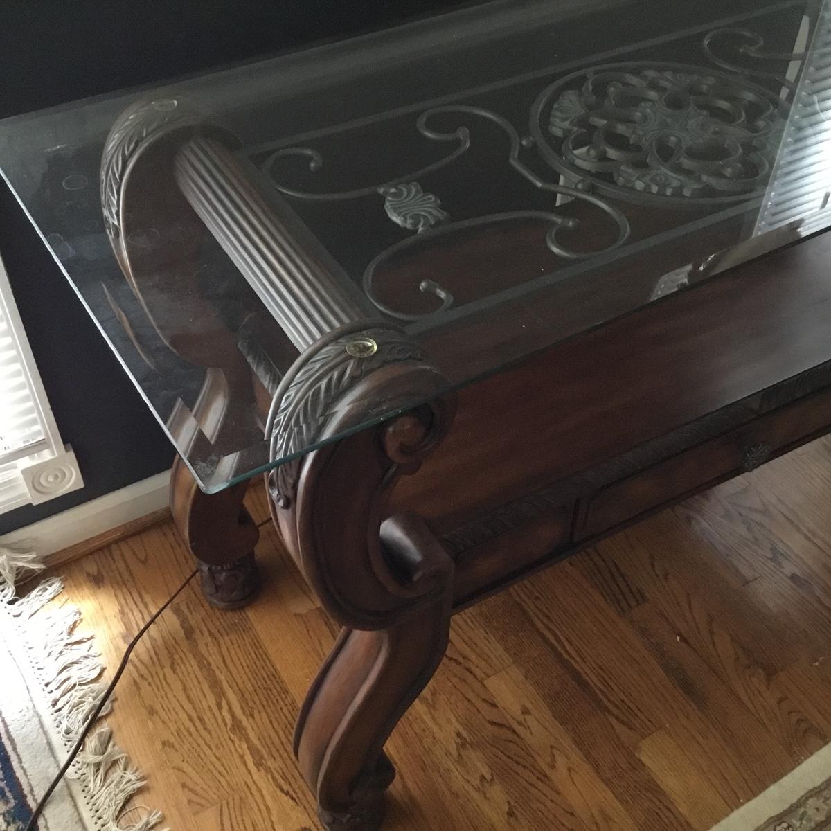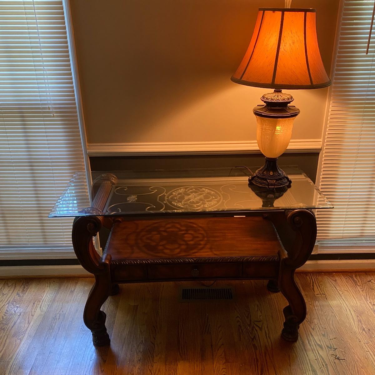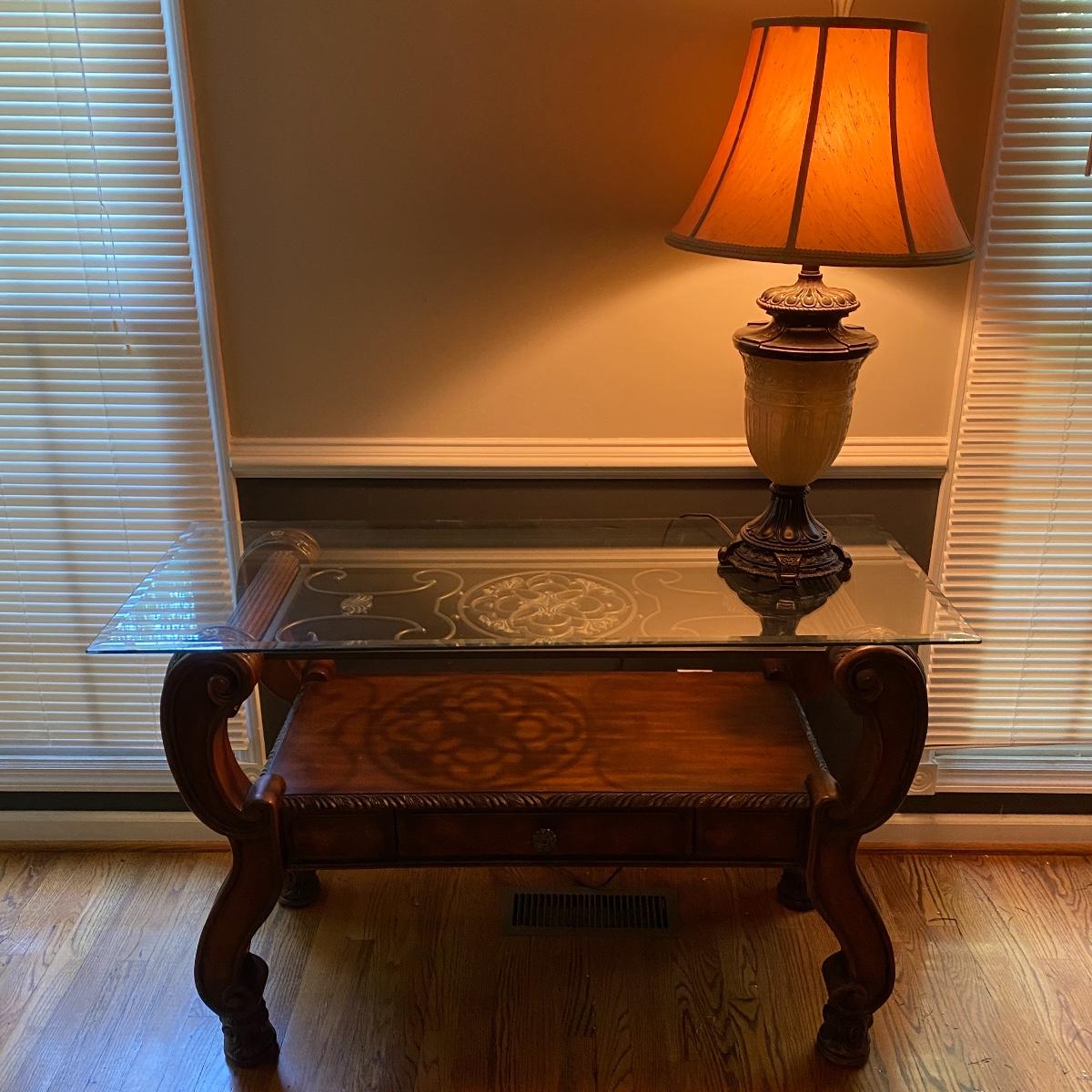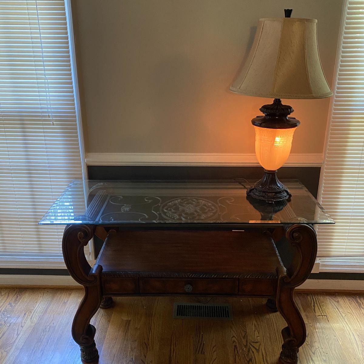 Beautiful Glass top table with iron design and wooden base. base has a small drawer and nice intricate details. The glass is not attached but lays on top of base securely with sticky tape. Measures 48" x 20.5" x 30" high. This lot comes with a glass bulb base lamp. This base can light up instead of the bulb for mood lighting or you can light both at same time. Take your pick!. 17' d x 33' tall. Local pick up.