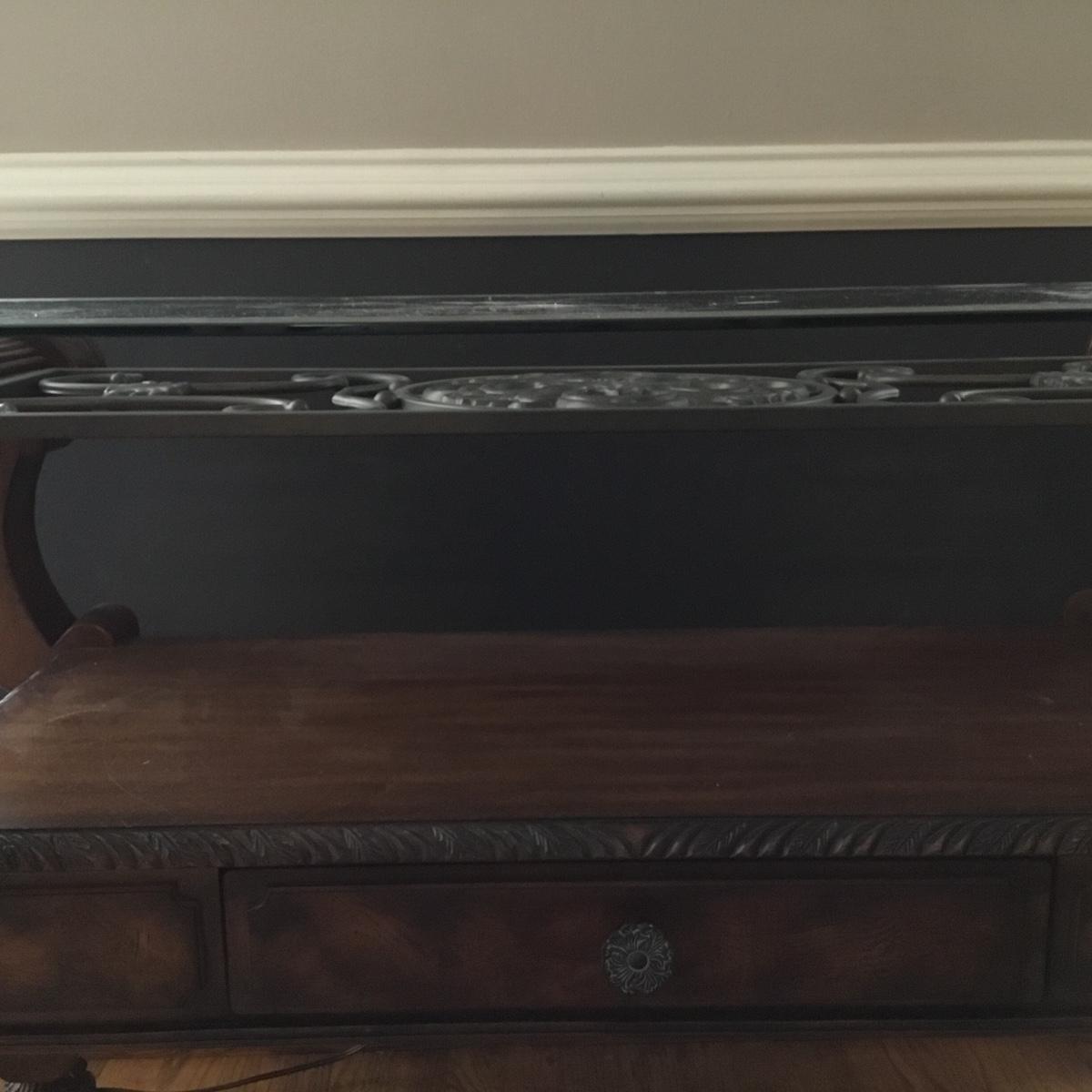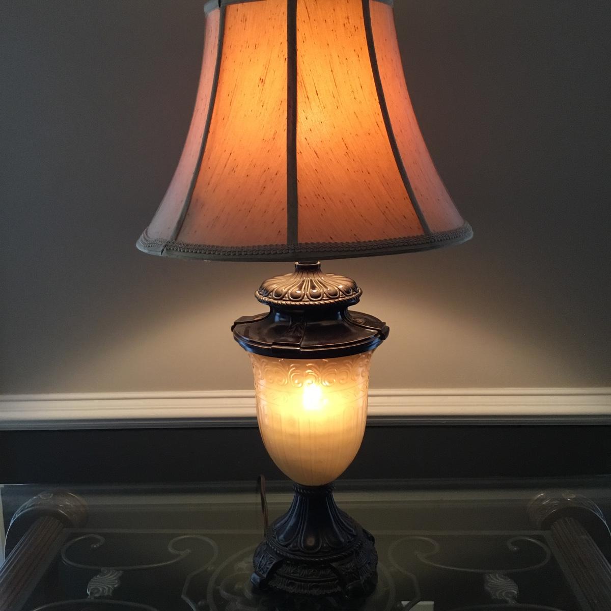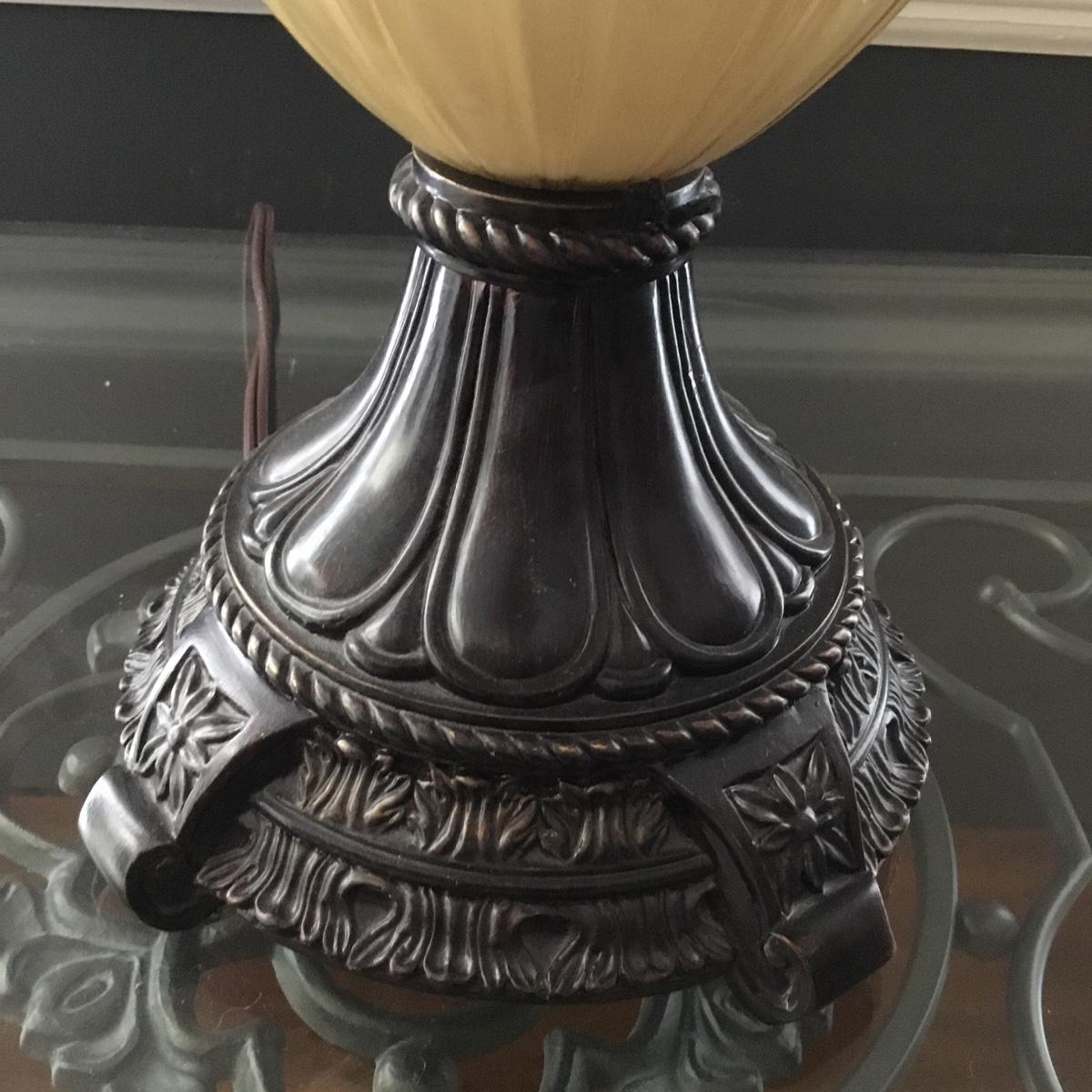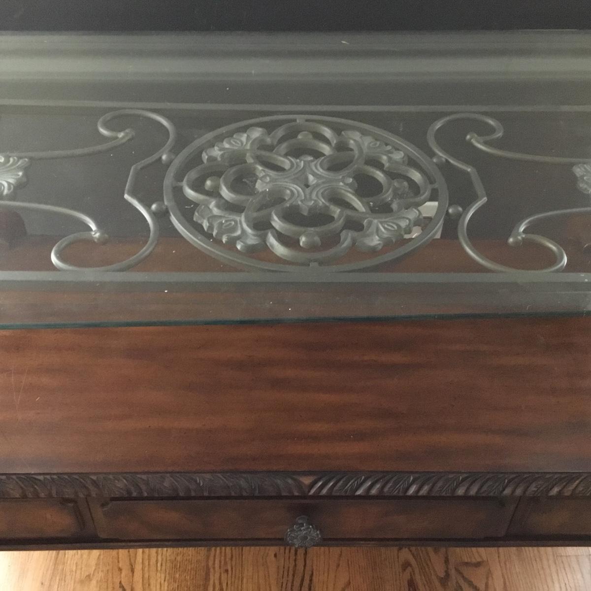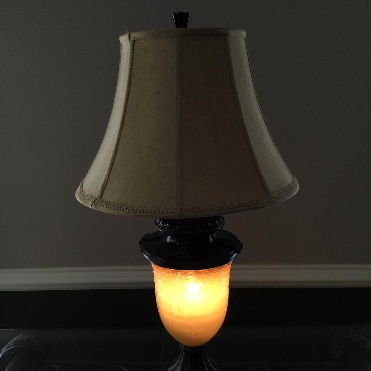 Beautiful Glass top table with iron design and wooden base. base has a small drawer and nice intricate details. The glass is not attached but lays on top of base securely with sticky tape. Measures 48" x 20.5" x 30" high. This lot comes with a glass bulb base lamp. This base can light up instead of the bulb for mood lighting or you can light both at same time. Take your pick!. 17' d x 33' tall. Local pick up.
