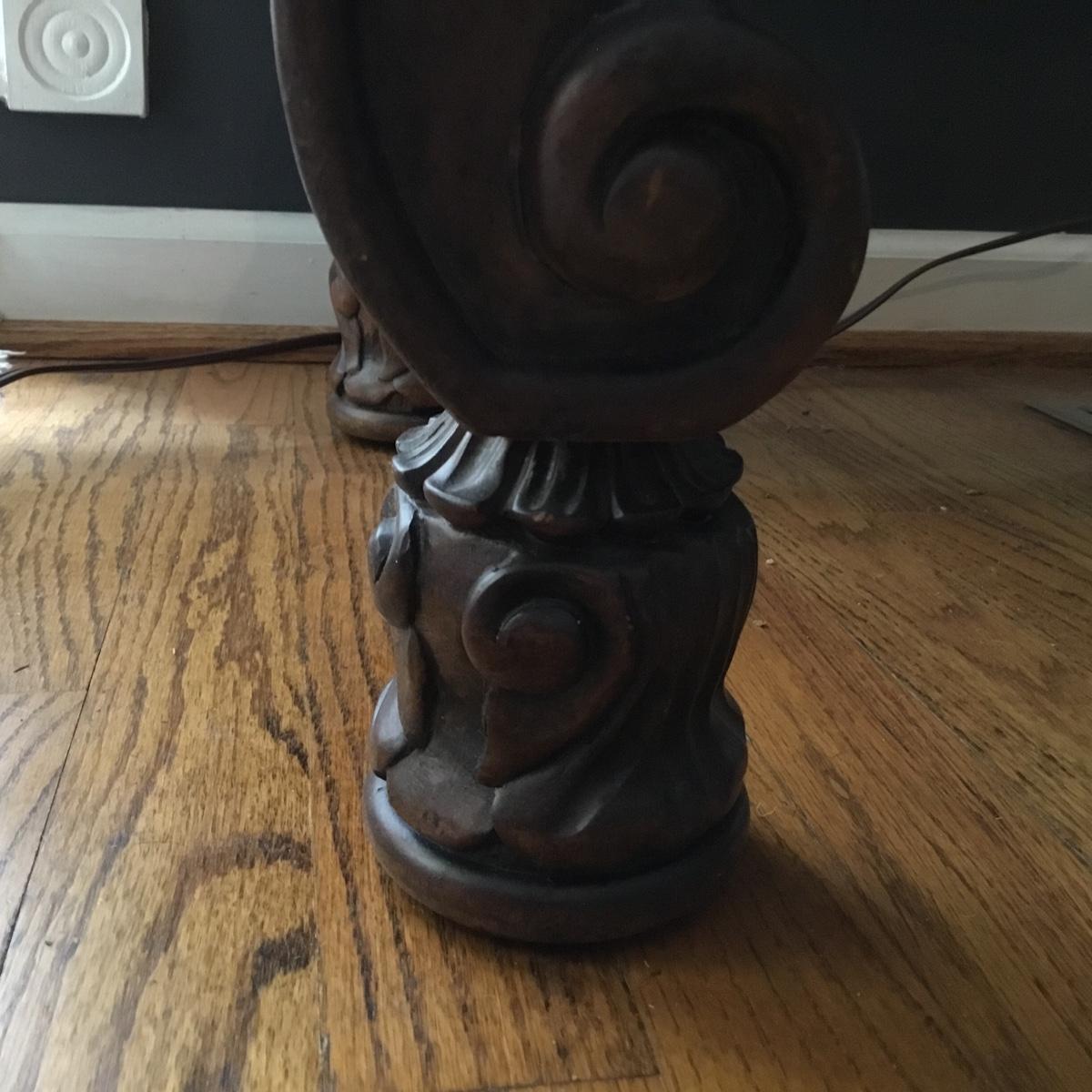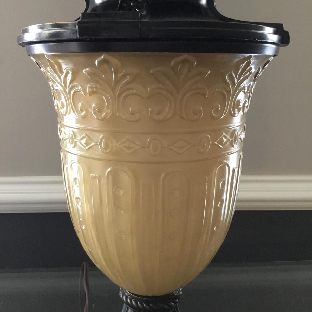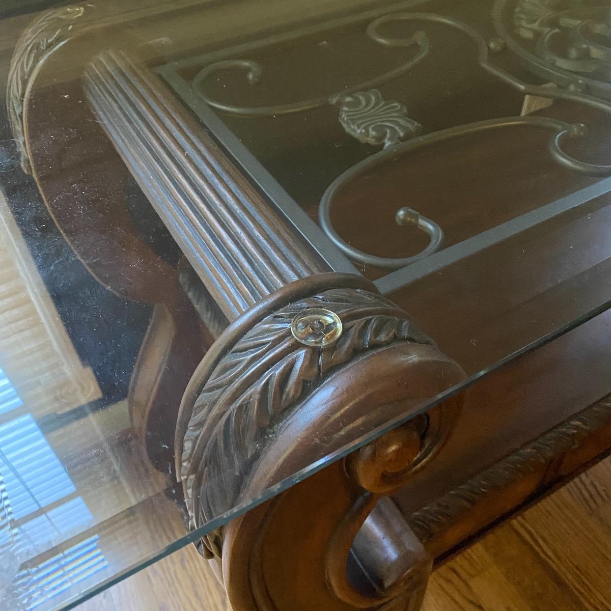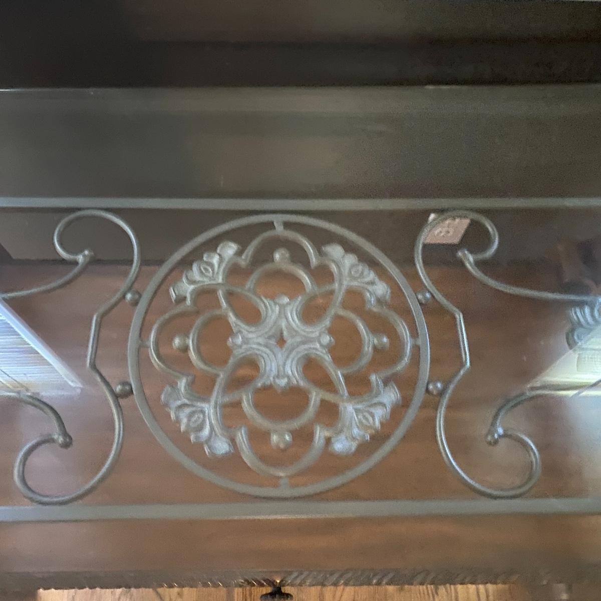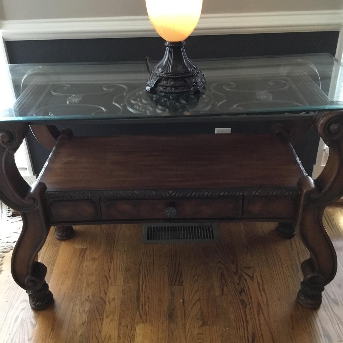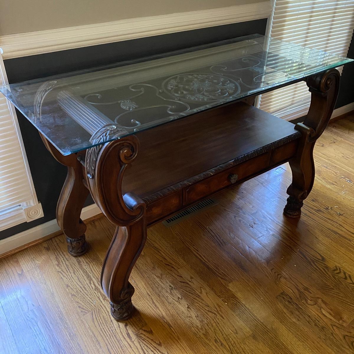 Beautiful Glass top table with iron design and wooden base. base has a small drawer and nice intricate details. The glass is not attached but lays on top of base securely with sticky tape. Measures 48" x 20.5" x 30" high. This lot comes with a glass bulb base lamp. This base can light up instead of the bulb for mood lighting or you can light both at same time. Take your pick!. 17' d x 33' tall. Local pick up.