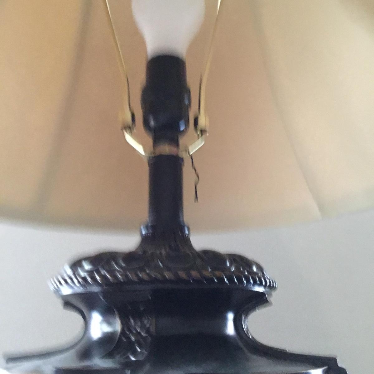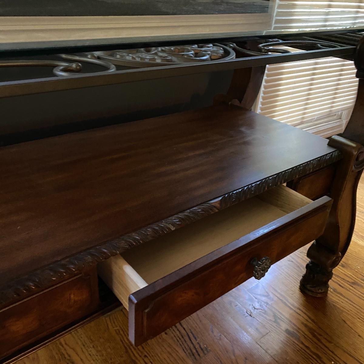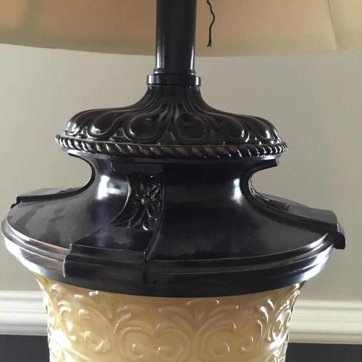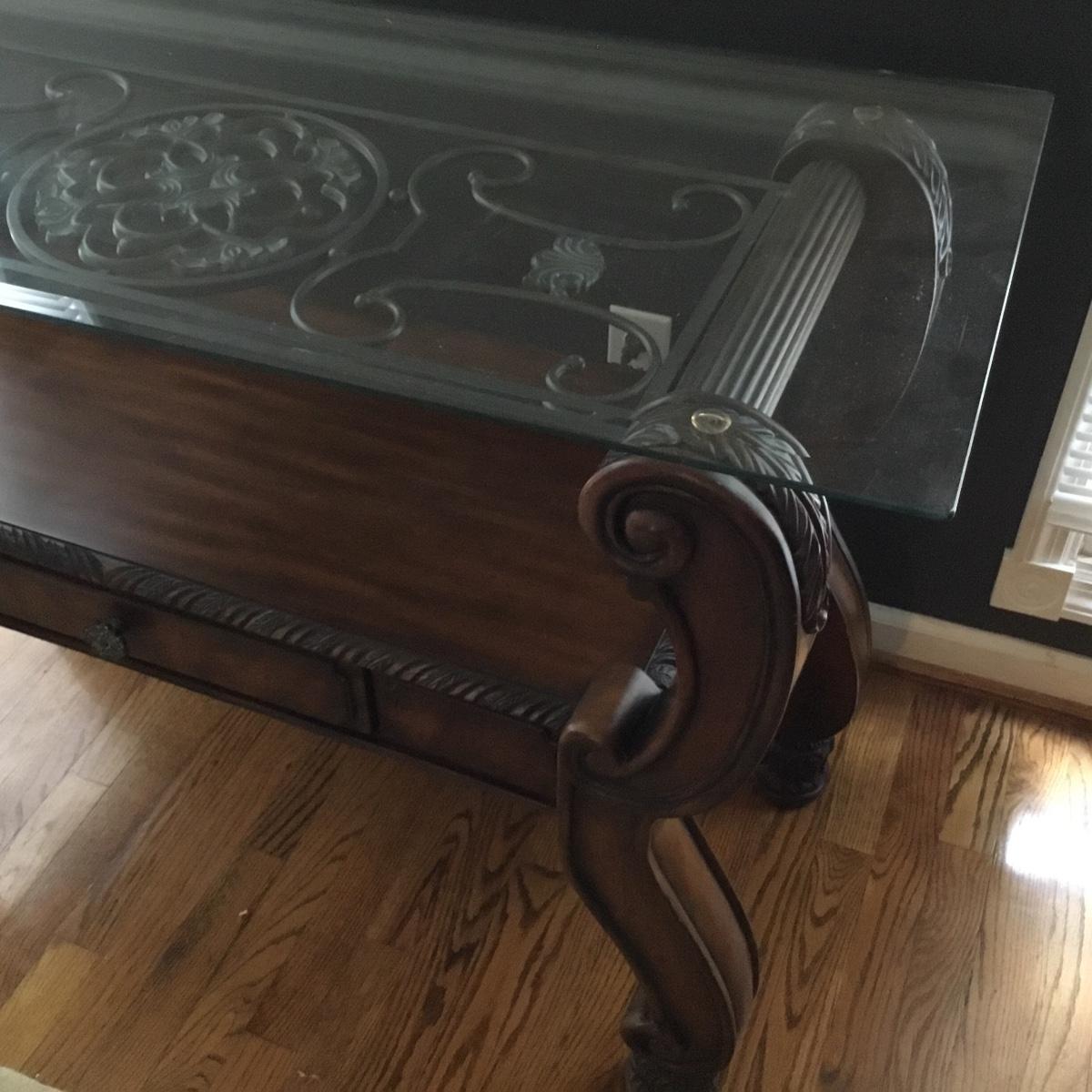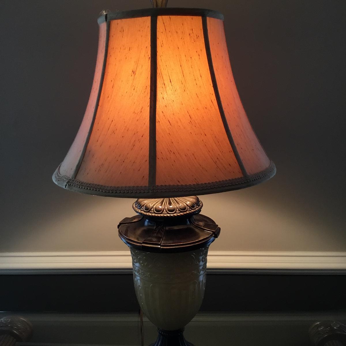 Beautiful Glass top table with iron design and wooden base. base has a small drawer and nice intricate details. The glass is not attached but lays on top of base securely with sticky tape. Measures 48" x 20.5" x 30" high. This lot comes with a glass bulb base lamp. This base can light up instead of the bulb for mood lighting or you can light both at same time. Take your pick!. 17' d x 33' tall. Local pick up.