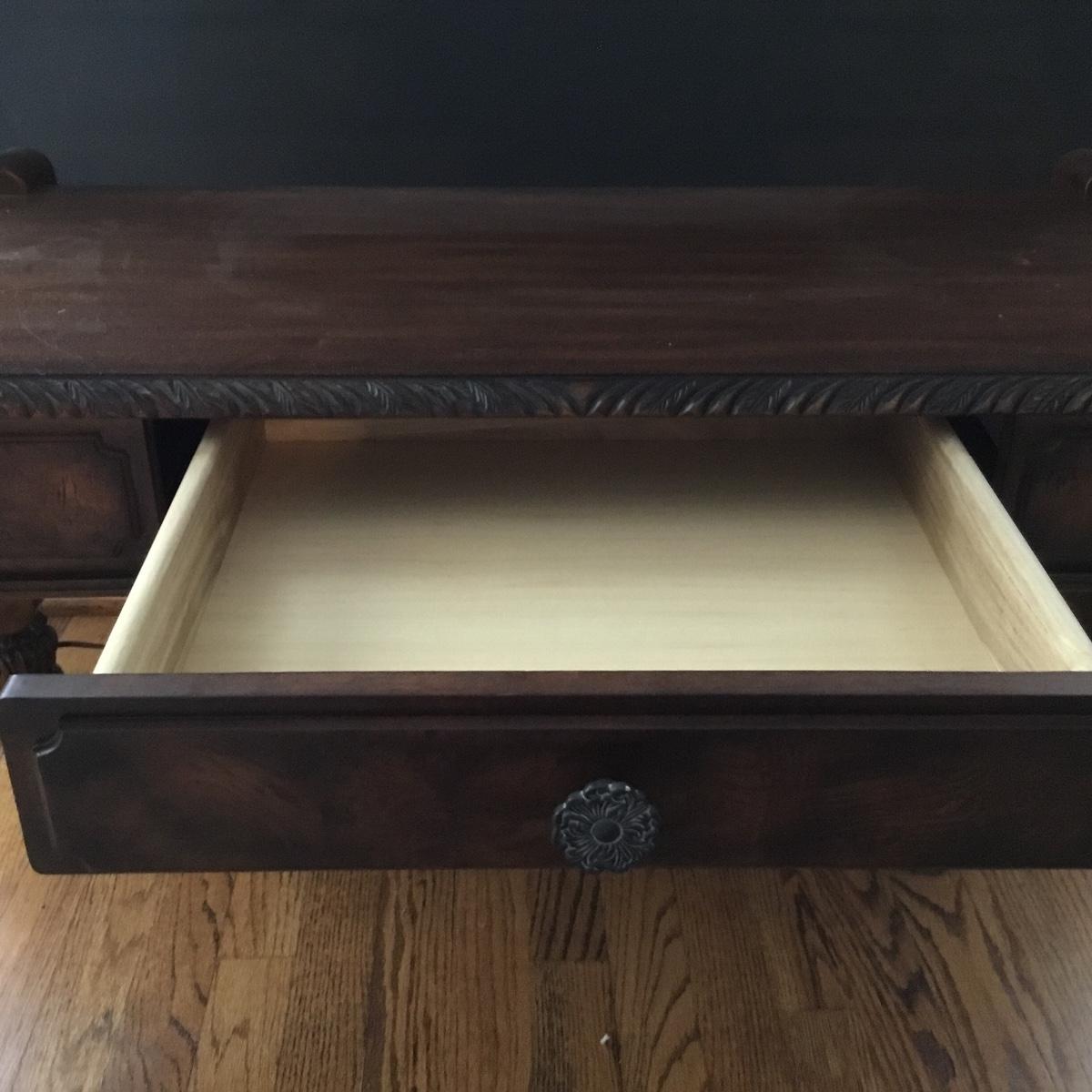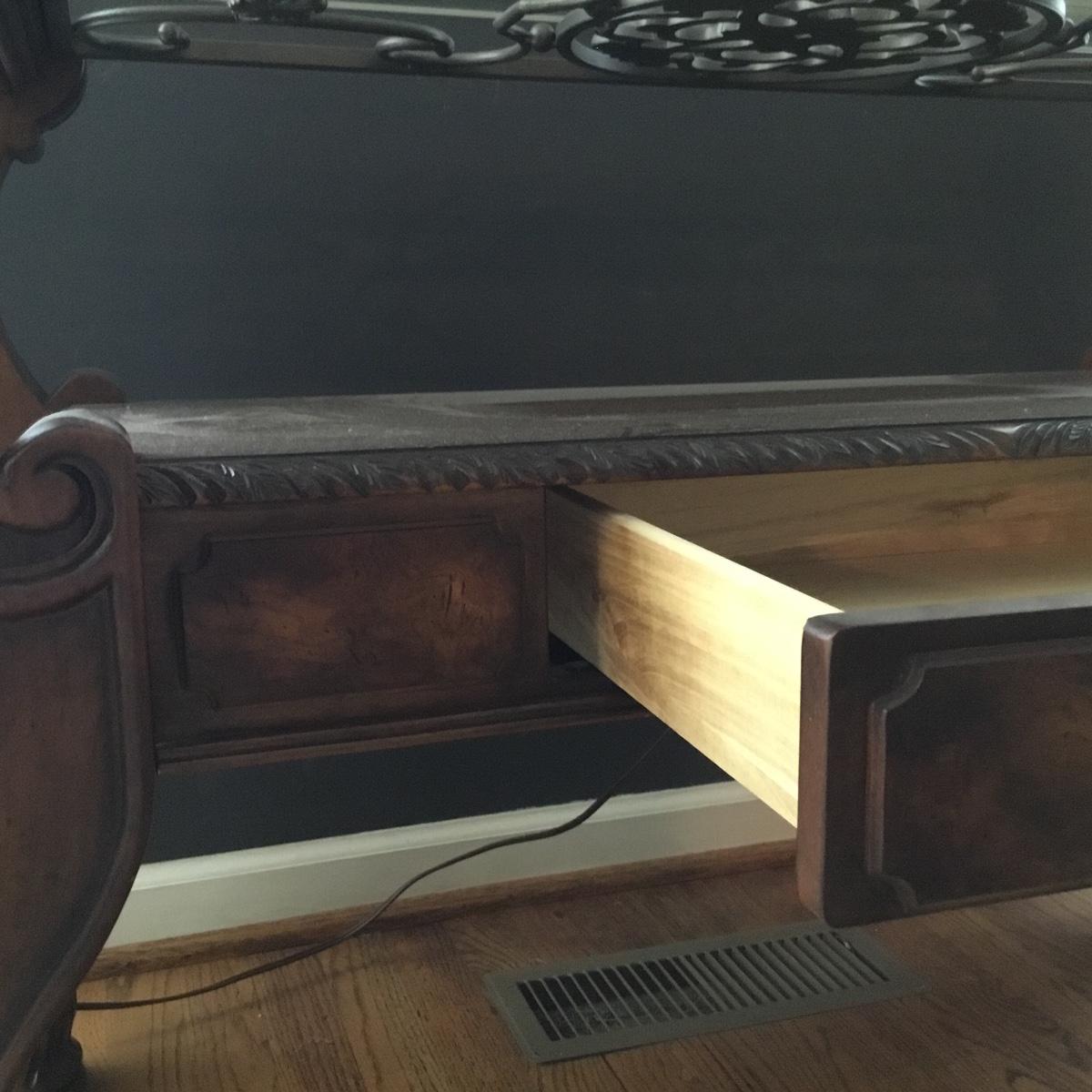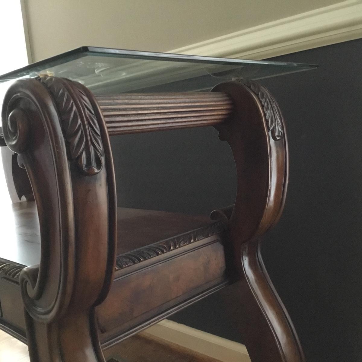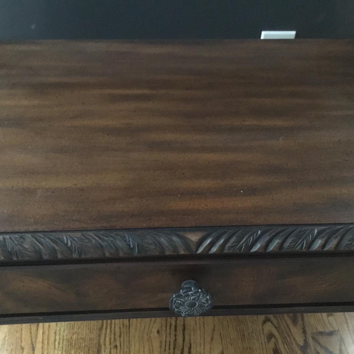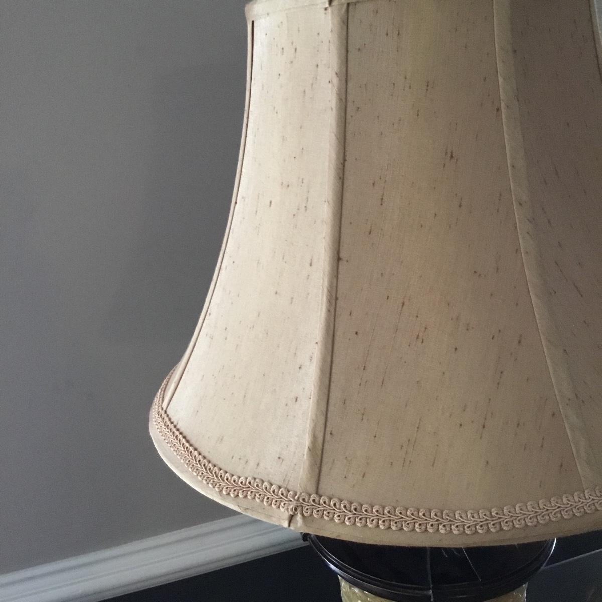 Beautiful Glass top table with iron design and wooden base. base has a small drawer and nice intricate details. The glass is not attached but lays on top of base securely with sticky tape. Measures 48" x 20.5" x 30" high. This lot comes with a glass bulb base lamp. This base can light up instead of the bulb for mood lighting or you can light both at same time. Take your pick!. 17' d x 33' tall. Local pick up.